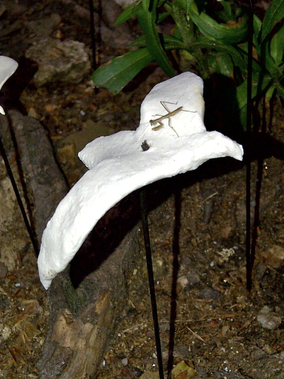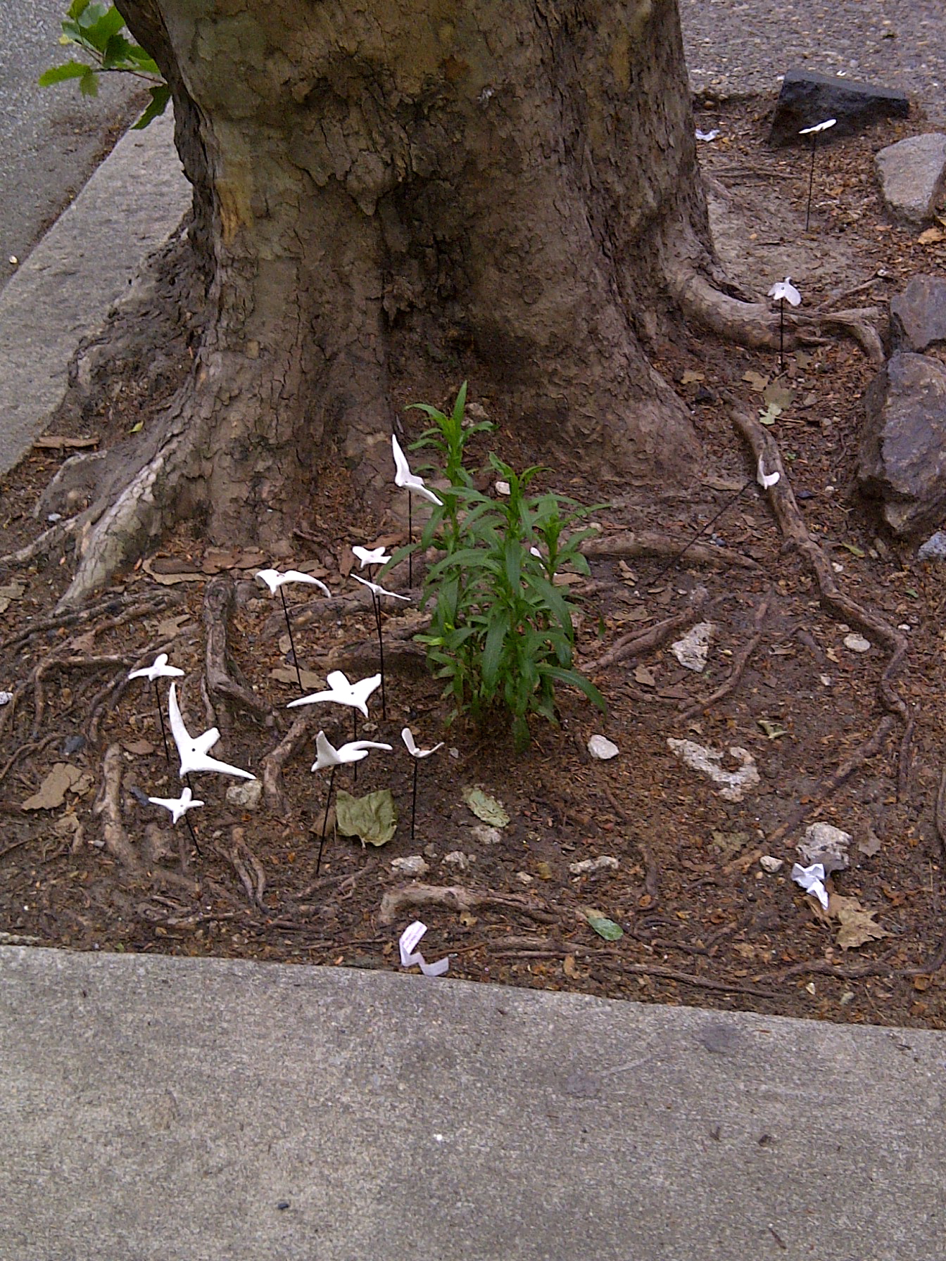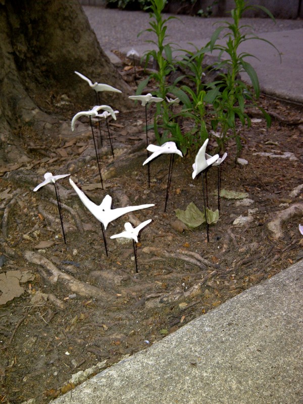 Denine R. Gorniak (“The Bicycle-Chef,”) just emailed me these photos of some kind of bird installation at 18th and Delancey streets. She said they’re very tiny, probably no bigger than three inches across and maybe 10 inches high. And one of the birds (photographed above) even had some kind of baby preying mantis on its wings… So weird, maybe these are meant to attract preying mantises? Is that even a thing?!