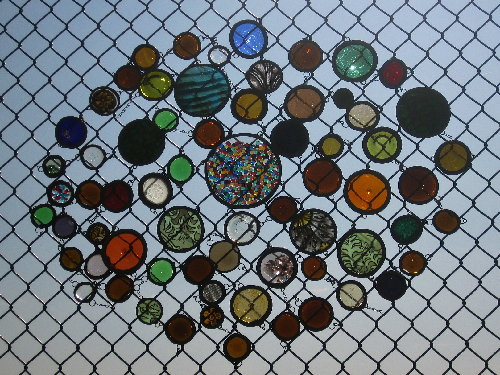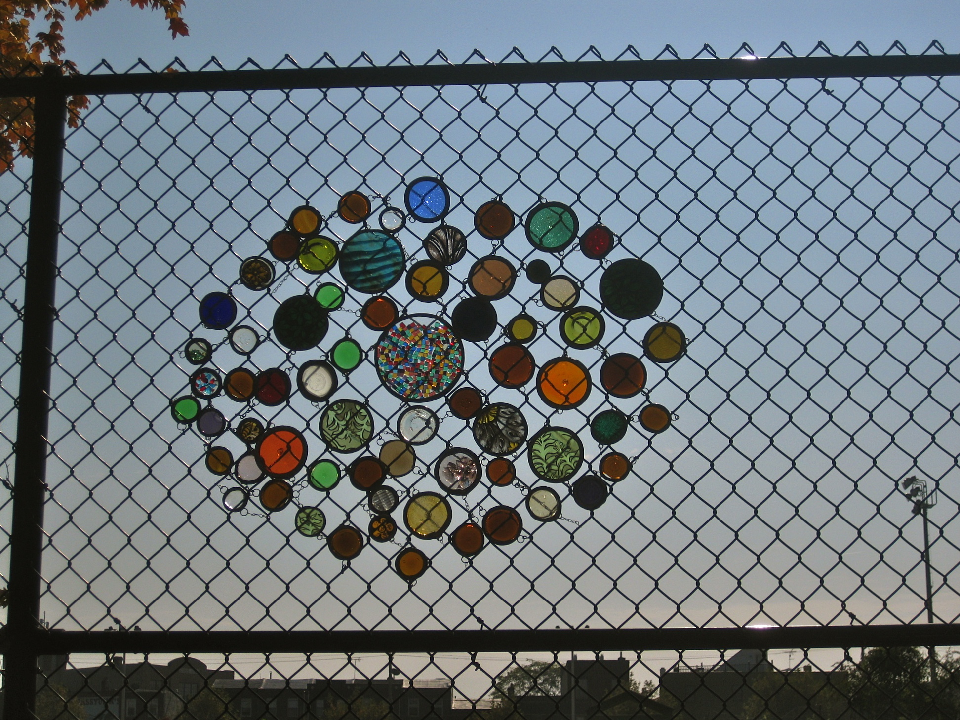 New work by stained glass artist, and first-time street artist, JT, who installed a mixture of recycled broken glass bottle bottoms and historical stained glass scraps for this beautiful piece on Federal between 9th and 10th streets in South Philly.