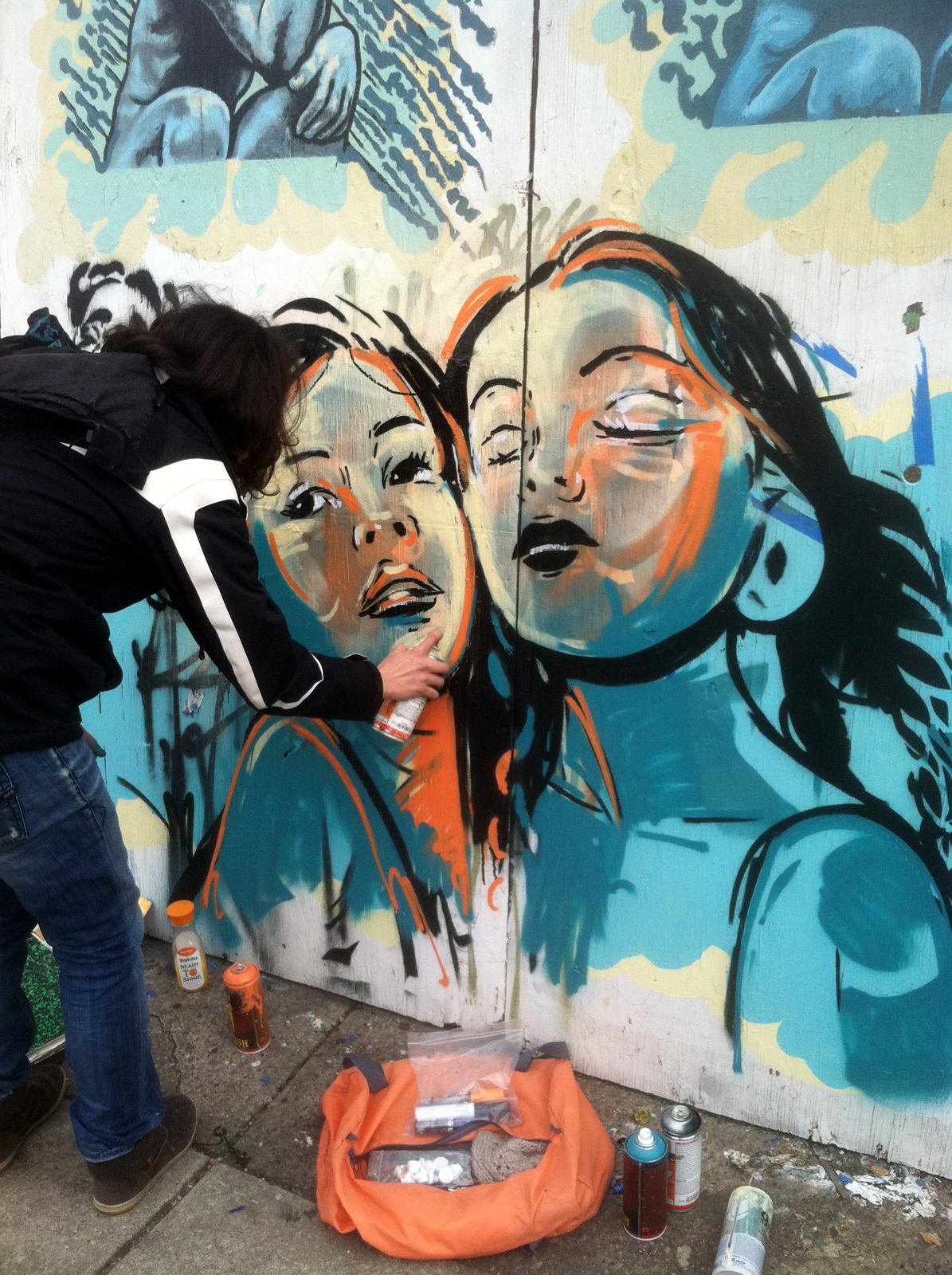 AliCè (Alice Pasquini,) the amazingly talented street artist from Rome, stopped by Philly last week to put up two new pieces of work… The first in South Philly, in the Italian Market at 9th and Washington streets. The second tucked away in Center City on Ionic street, just above 20th.