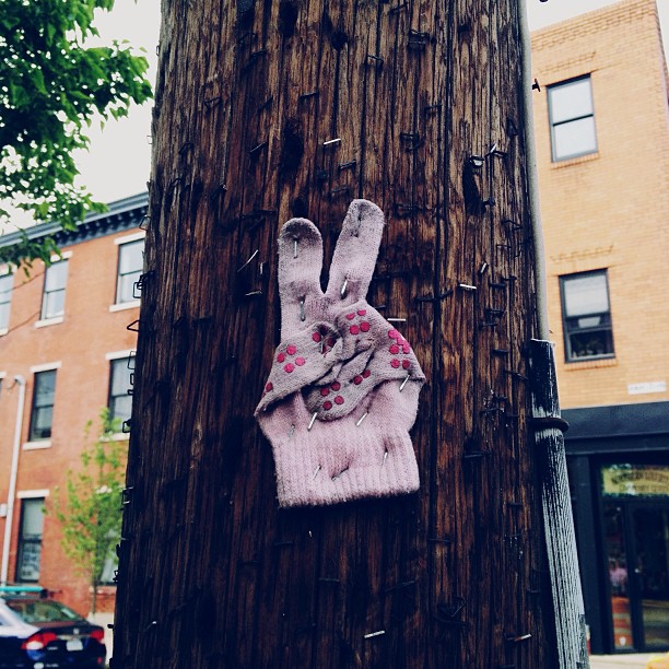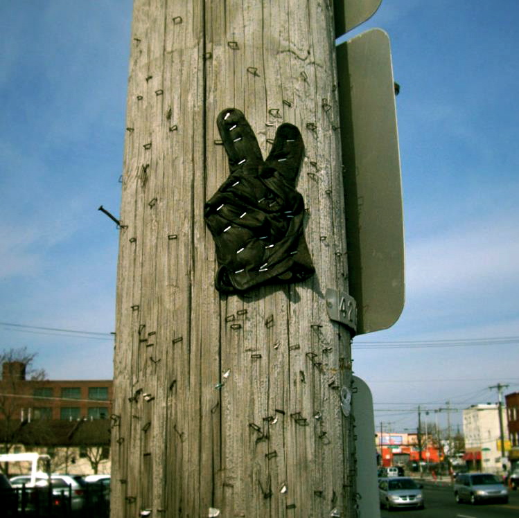 Left glove found in Northern Liberties, and right glove in North Philly. Wonder who’s installing these ‘peace’ gloves around the city/and why? Hhmm…