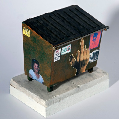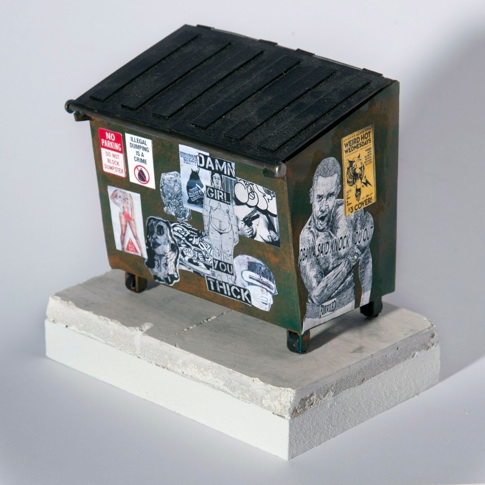 Love these little Philly dumpster sculptures by Drew Leshko! Seriously, I want all of them… I suppose I’m drawn to them because of their ridiculously on point likenesses to some of Philly’s more prevailing street art as of late. In fact, if you scroll through my blog here, I’m sure you will see most of the stickers/pastes above posted about within the last few pages. Nevertheless, I have a pretty specific aesthetic that I enjoy (obviously,) so I reached out to the artist himself to get his take on this series and his work in general: