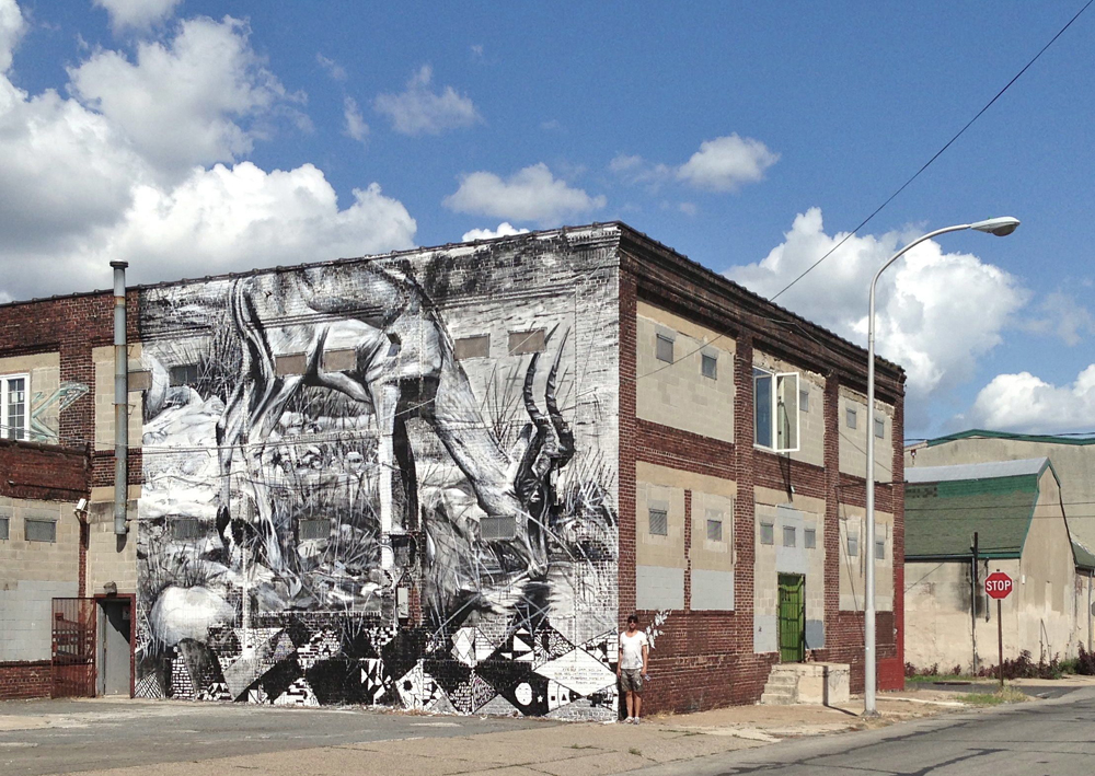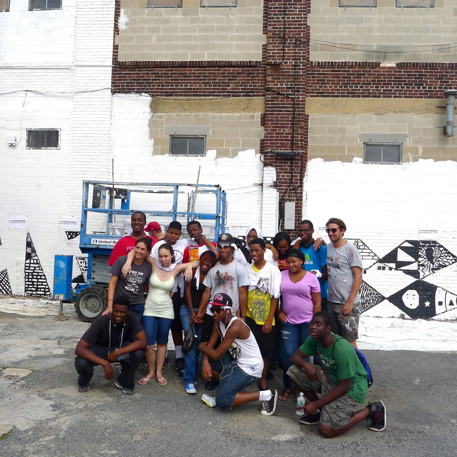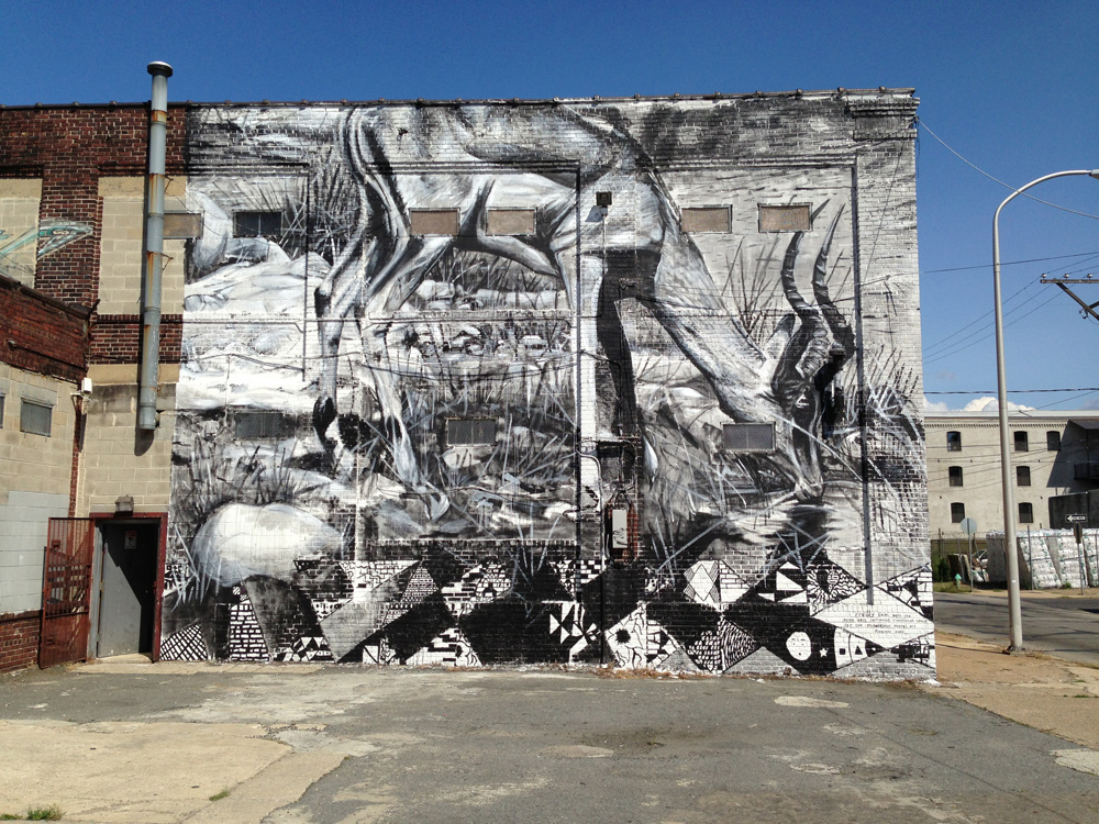“Mural Arts is pleased to announce our new mural by South African artist Ricky Lee Gordon (aka Freddy Sam) at 161 Cecil B. Moore, in Kensington. The mural, titled Together Moving Mountains, was completed with the help of one of our art education classes, made up primarily of students from Sayre High School. Freddy Sam spent one day in the classroom with students, and took them out to the mural the next day for some painting.”