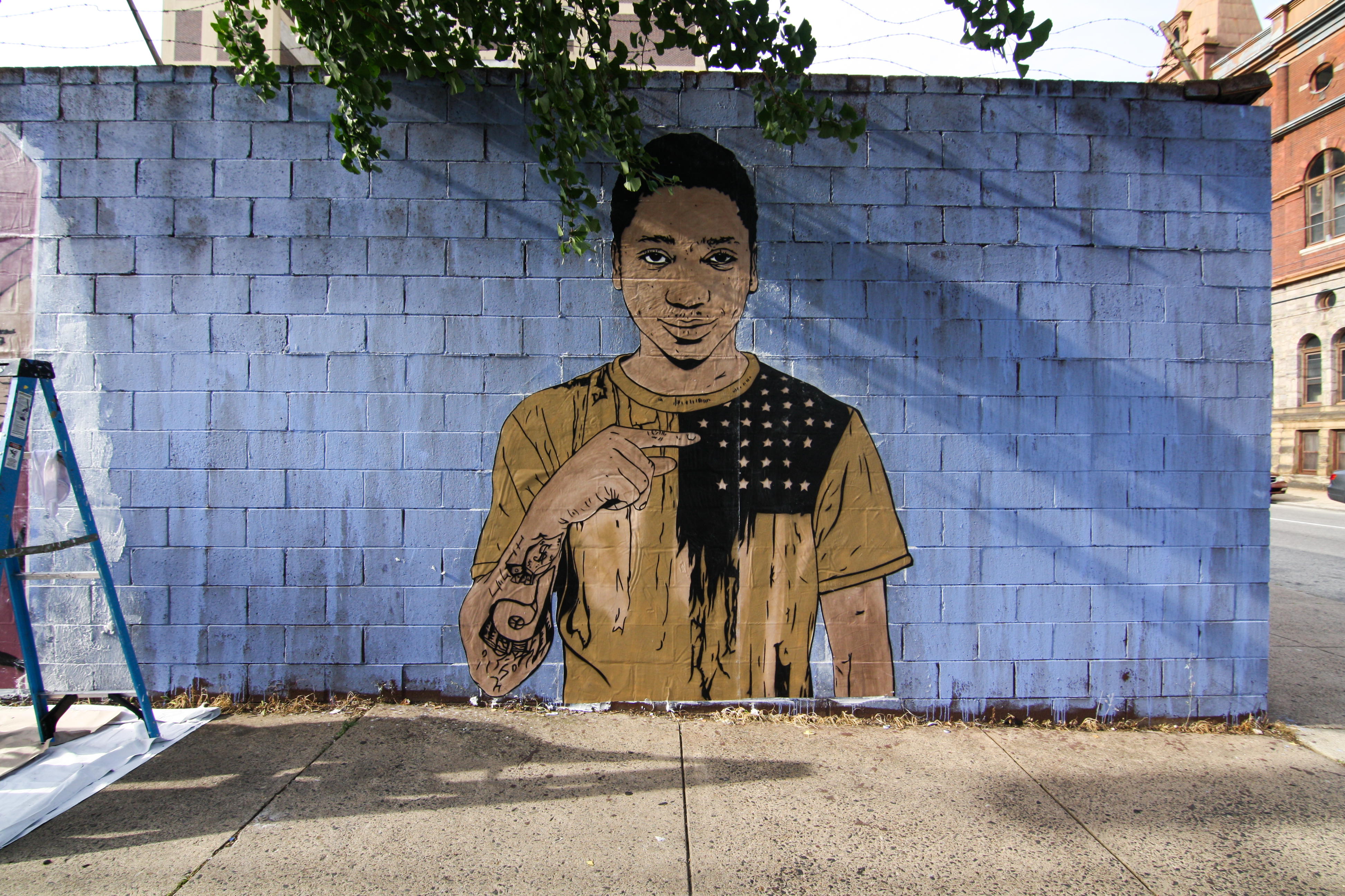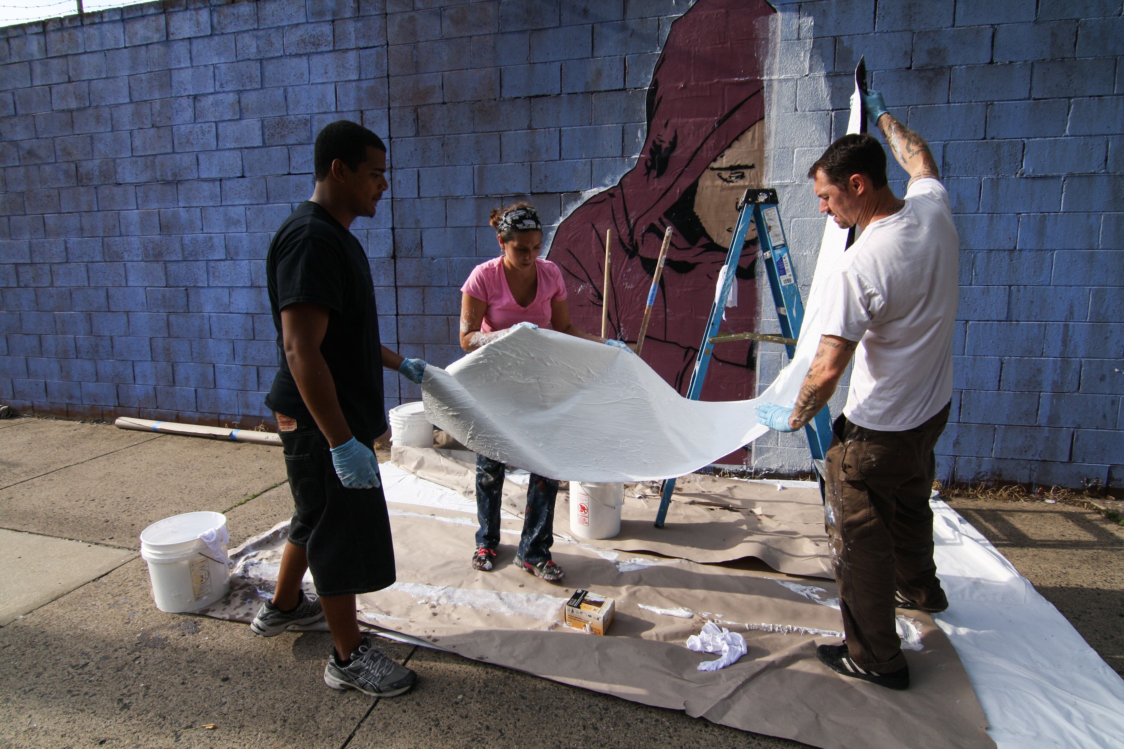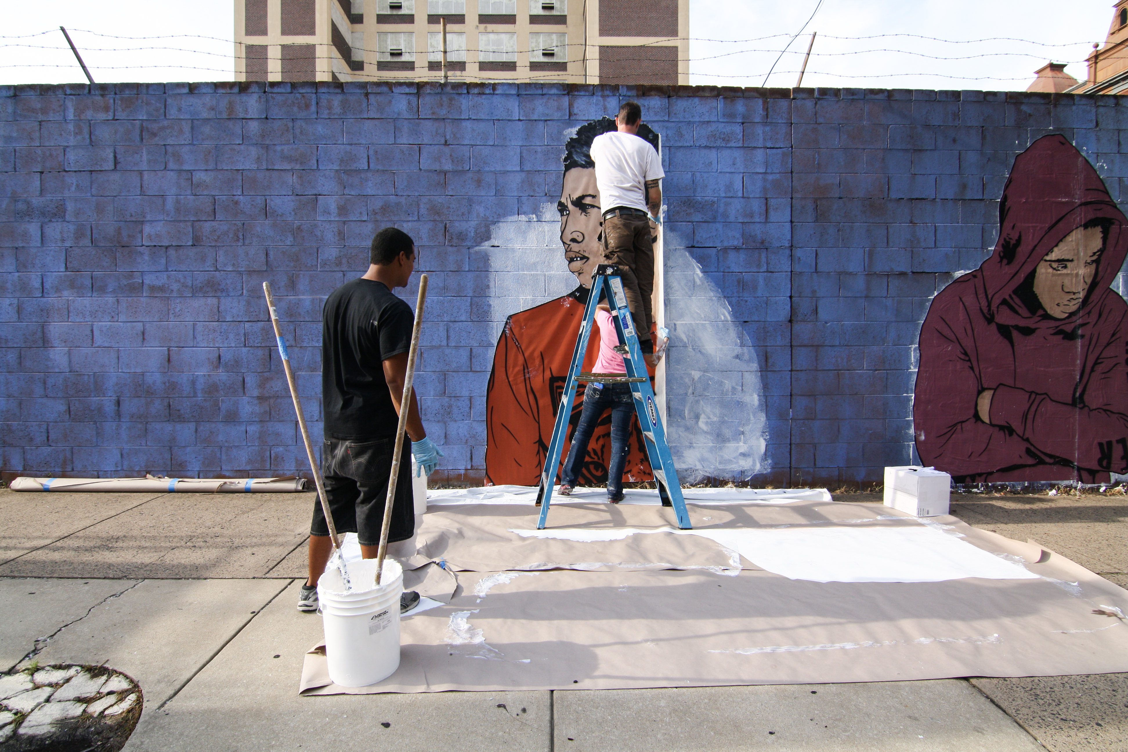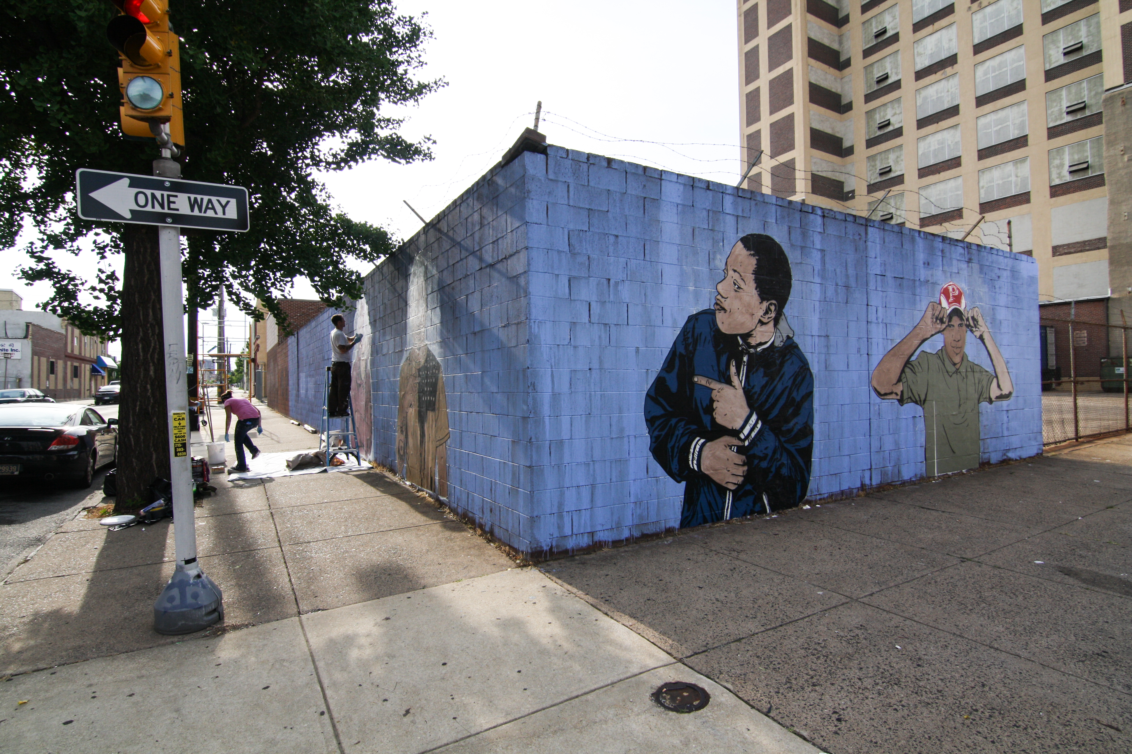 “AÂ New York-based artist, Chris Stain worked with Mural Arts youth at the NET Center at 2nd and Norris Streets, encouraging them to share their stories with one another. Stain and students then created a zine that documents their stories and includes their photo portraits. He has selected series of portraits to create a whimsical stenciled mural depicting NET students as they want to be seen.”