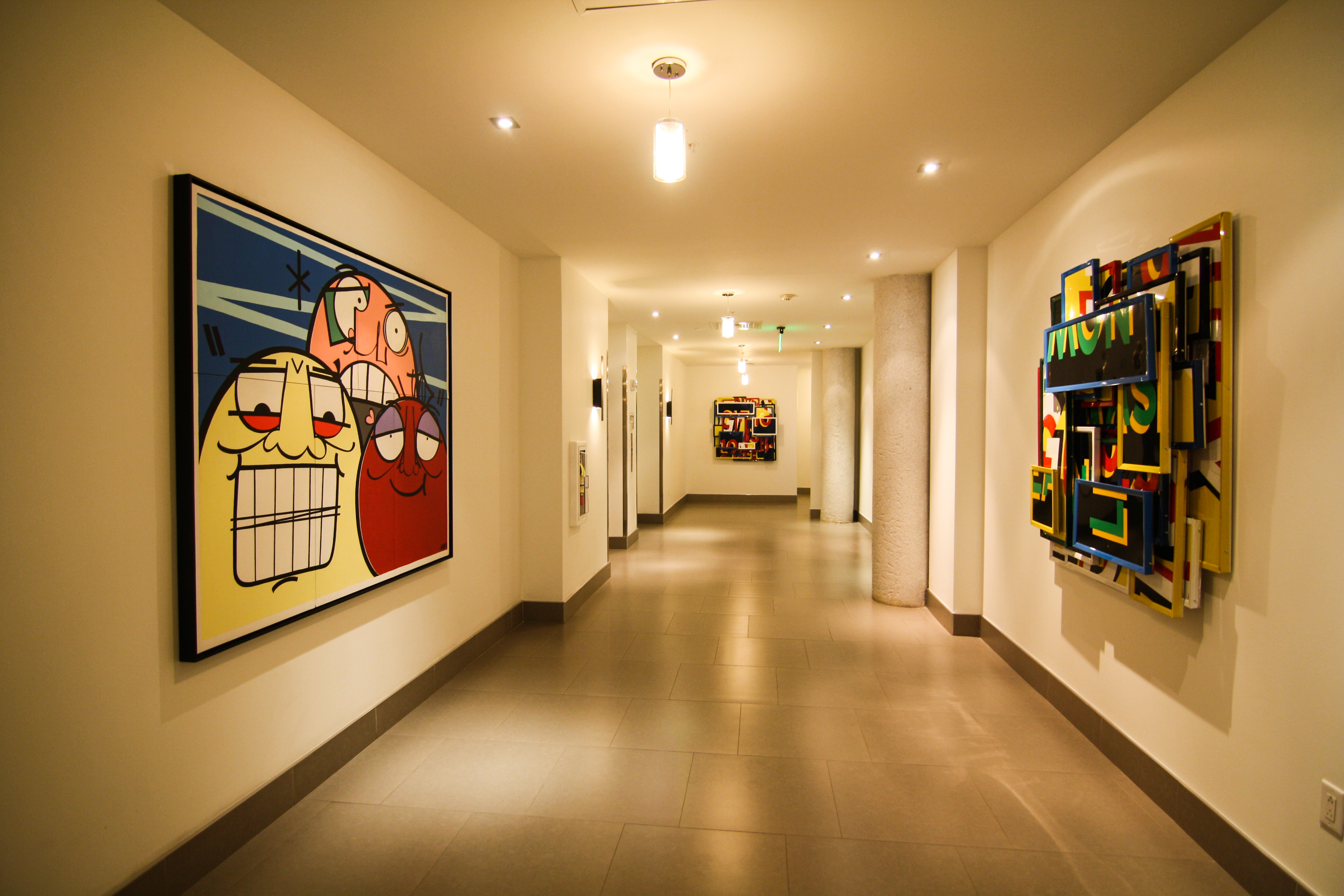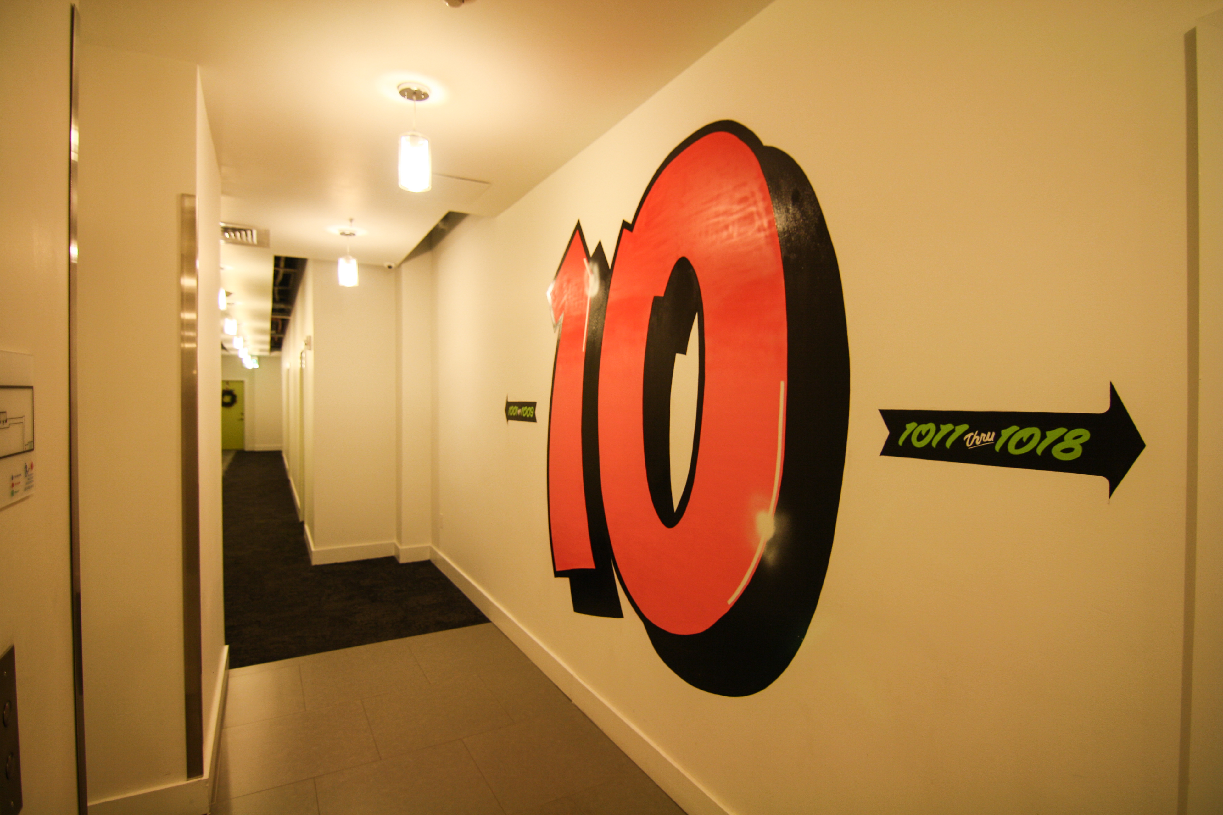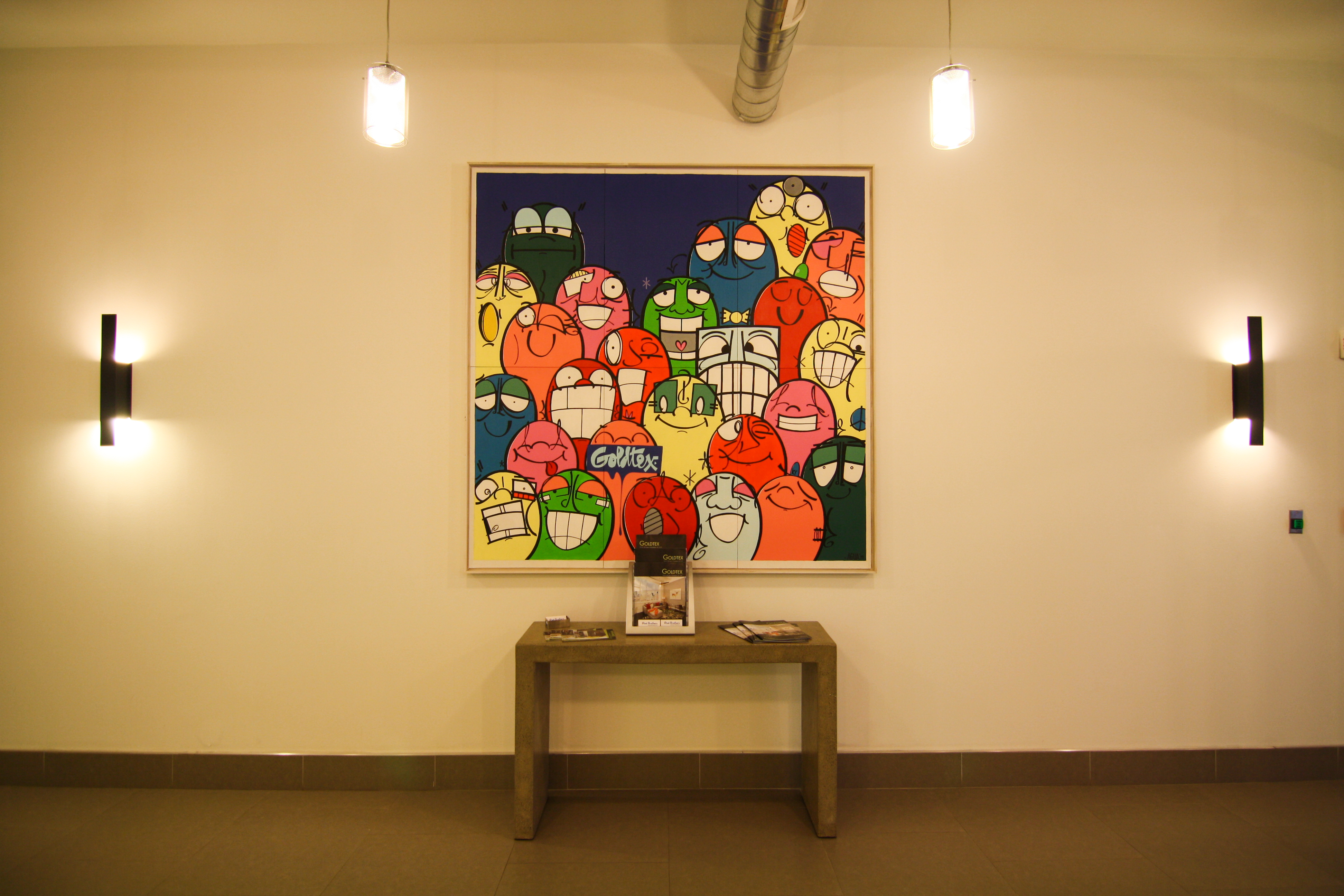 One of the more particularly interesting/exciting things about Goldtex is that throughout the building they pay homage to its past and to the graffiti artists who were among the few to use the space while it was left abandoned, leaving exposed pillars and beams to show some of the original graffiti. As well, the developers hired Philly’s own ESPO (Steve Powers) to paint murals throughout the building. Other street artists/graff writers works are on rotating display on the first floor.