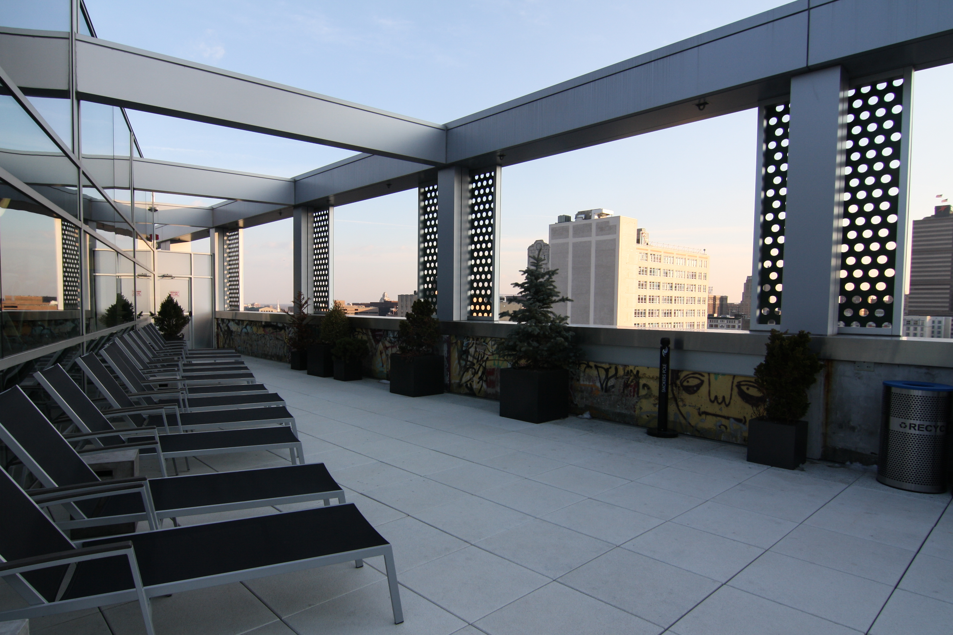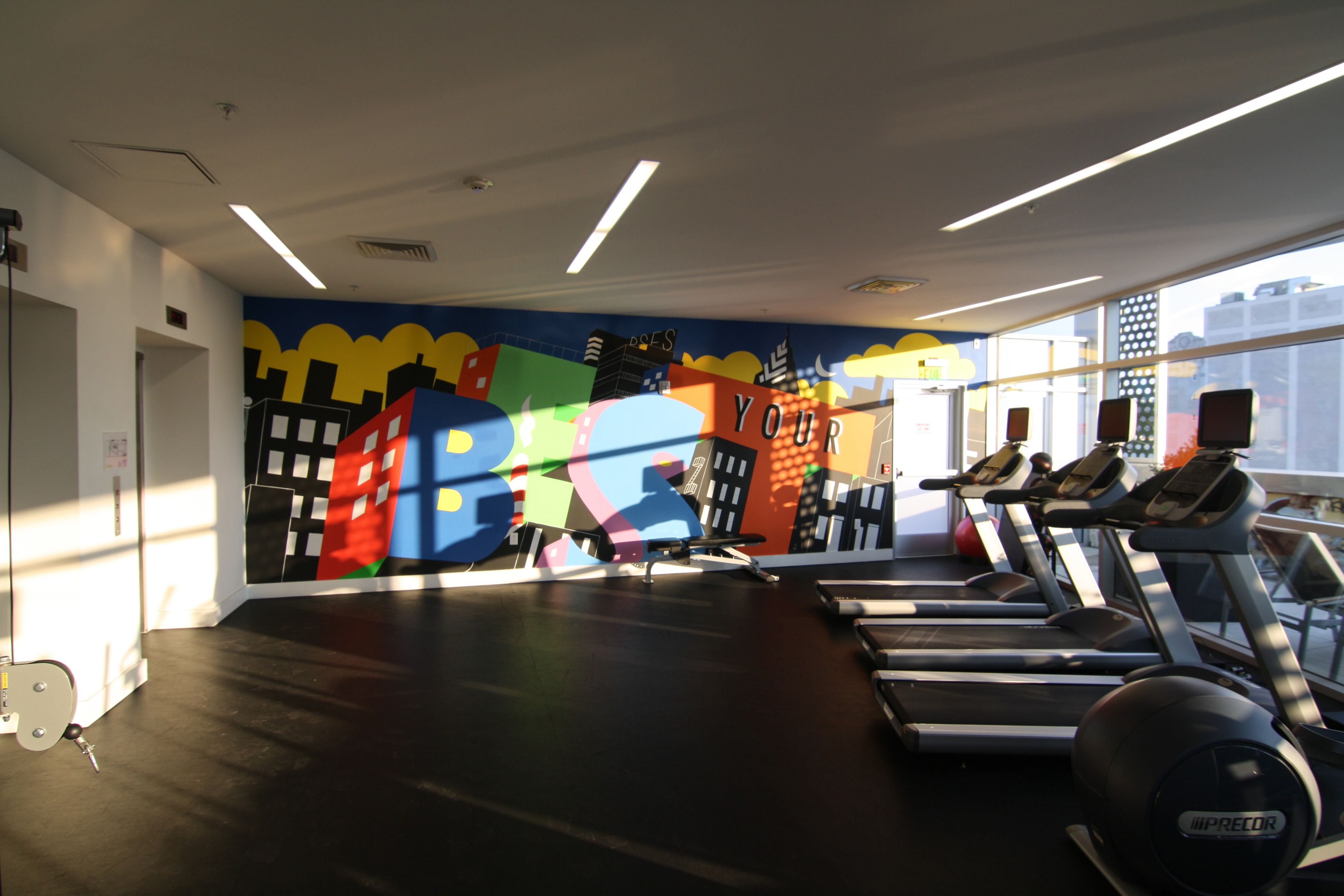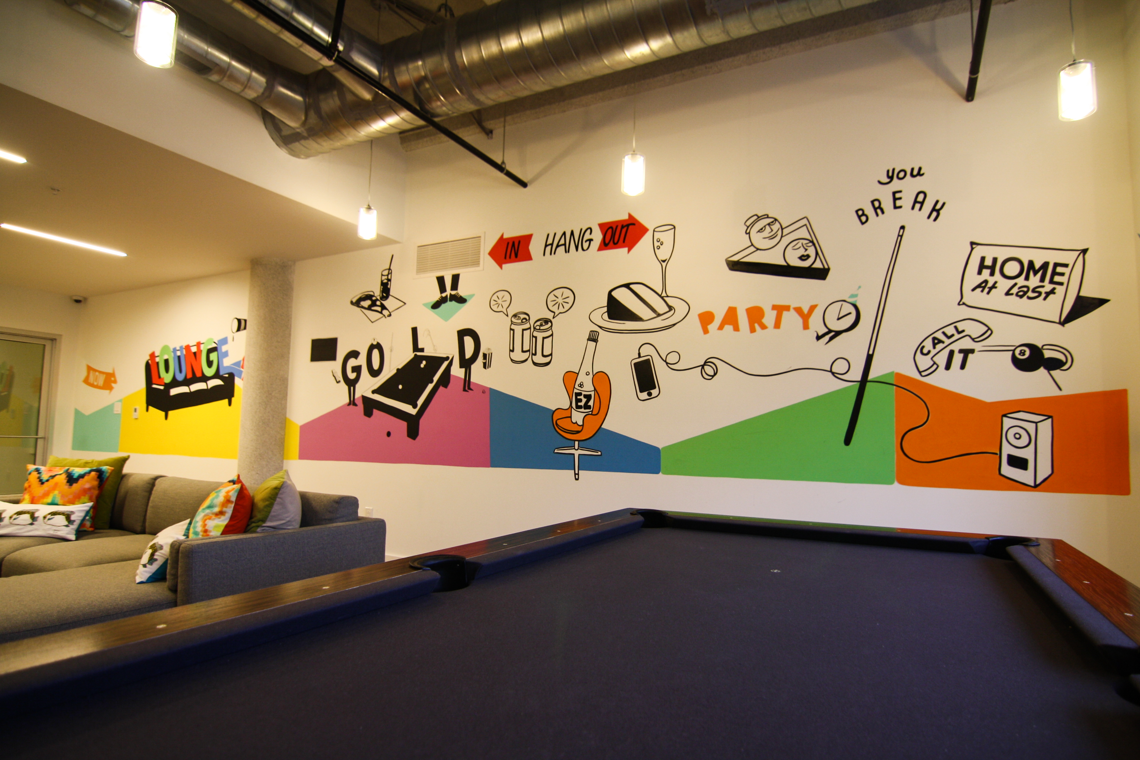 One of the more particularly interesting/exciting things about Goldtex is that throughout the building they pay homage to its past and to the graffiti artists who were among the few to use the space while it was left abandoned, leaving exposed pillars and beams to show some of the original graffiti. As well, the developers hired Philly’s own ESPO (Steve Powers) to paint murals throughout the building. Other street artists/graff writers works are on rotating display on the first floor.