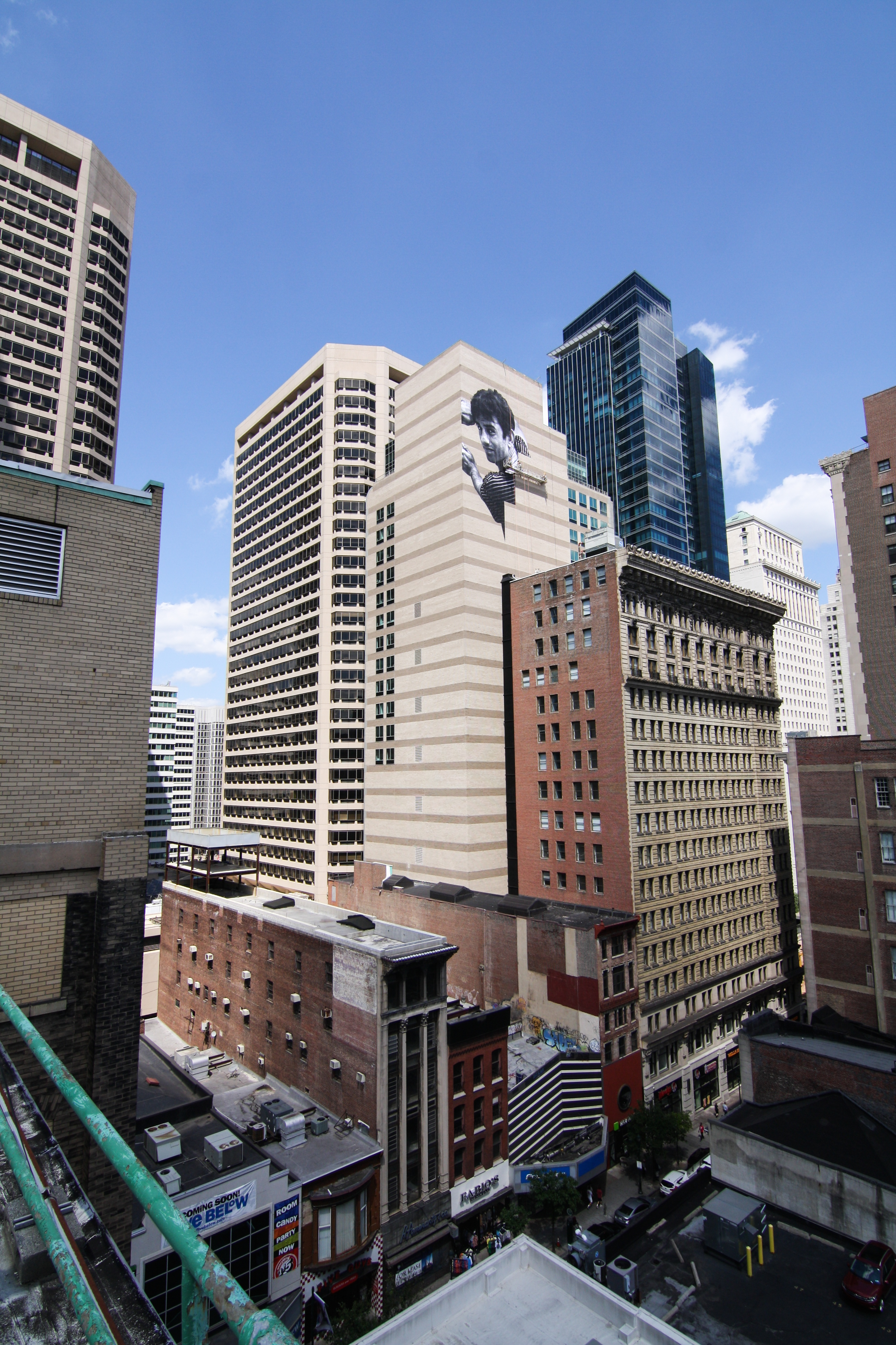 Next time you walk down Chestnut street, between 15th and 16th streets look up to discover this FANTASTIC new piece – currently being installed – by internationally renowned French artist JR.