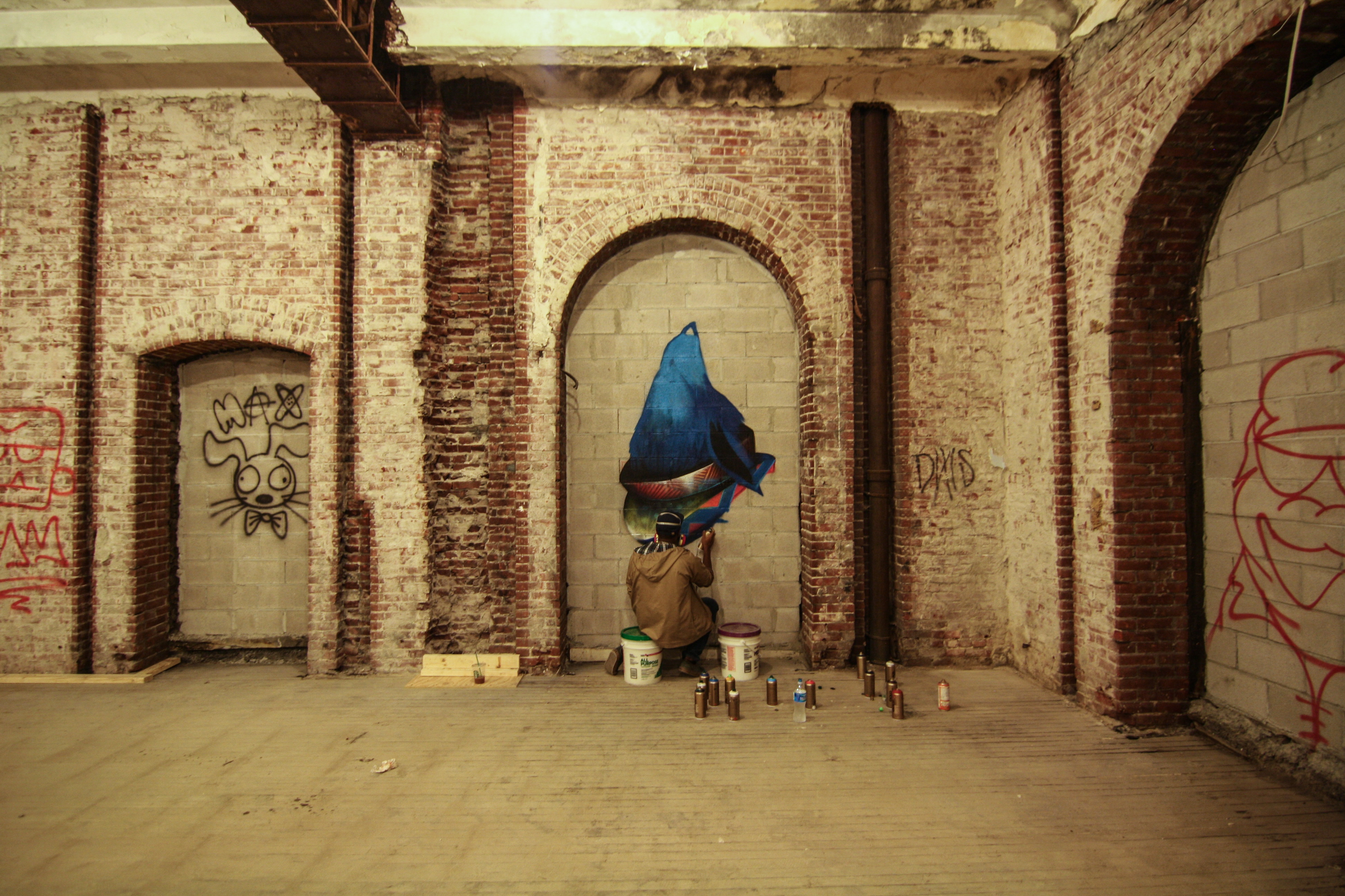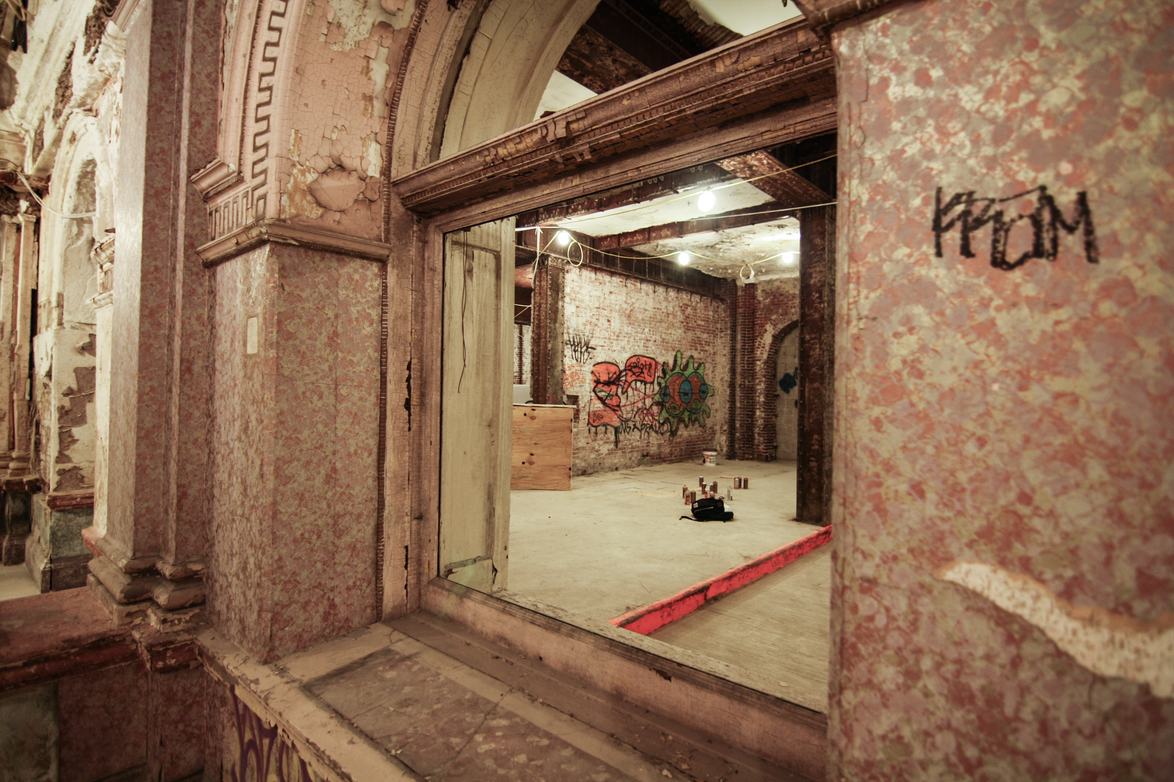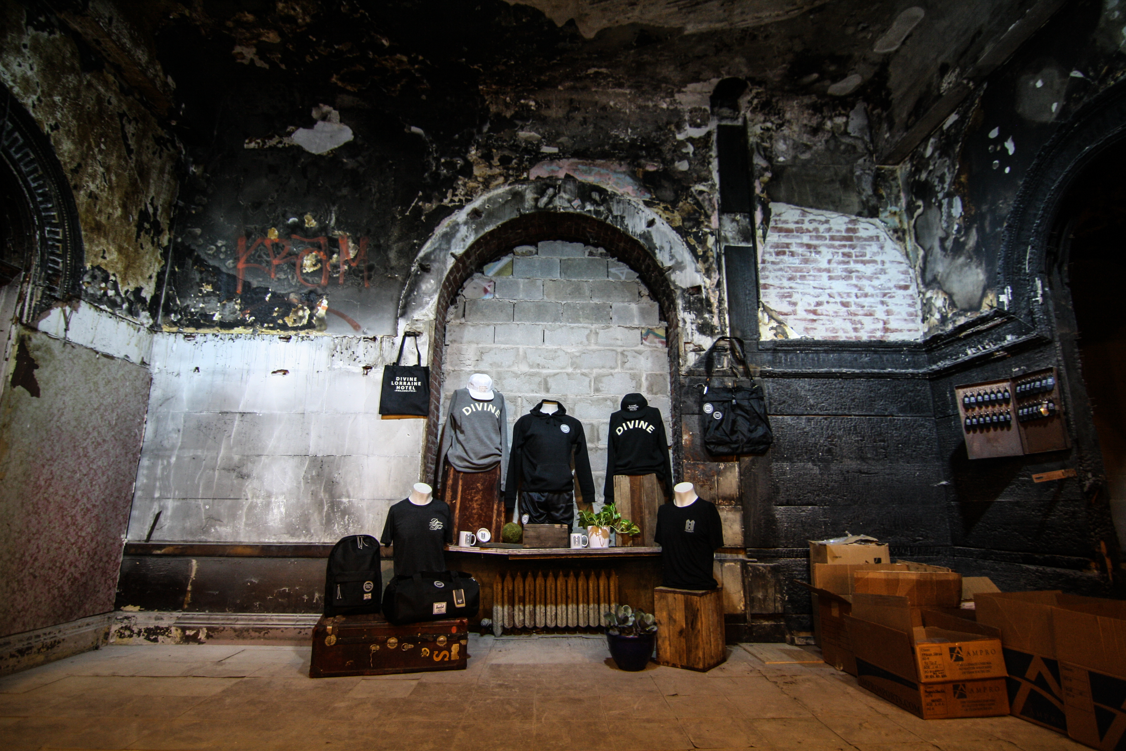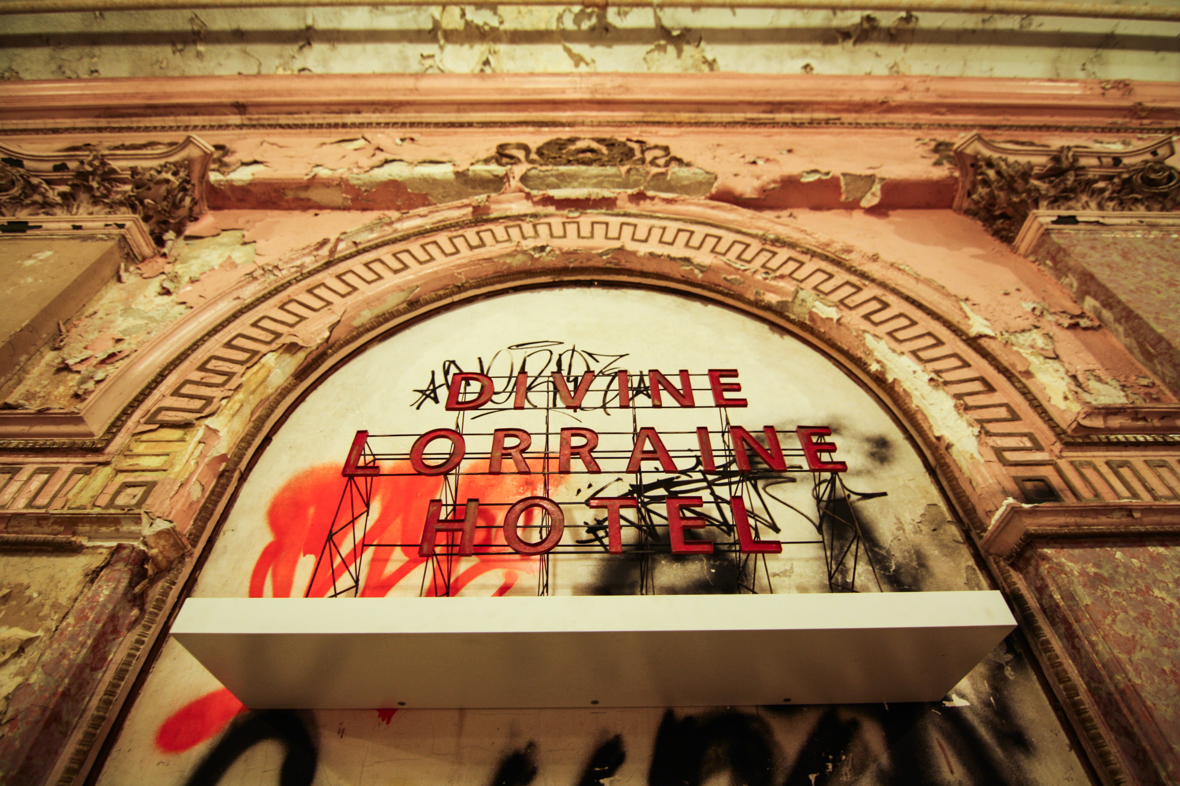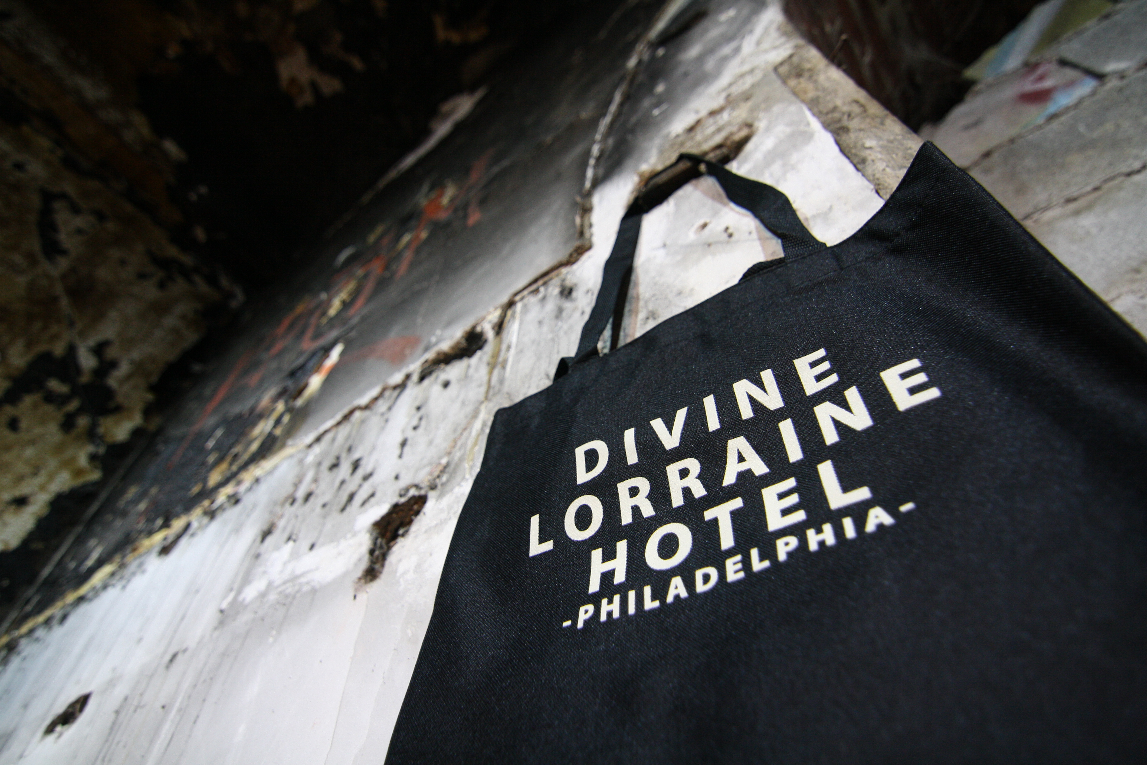 Got a sneak preview of the Divine Lorraine Hotel Collection II pop-up last night (thanks to Najeeb Sheikh and Brooks Bell) opening TODAY ONLY in the Divine Lorraine’s lobby from 3-7:30pm, and featuring – SURPRISE – a new mural by the one-and-only NoseGo, as well as an incredible “Divine Lorraine” sign installation by Drew Leshko!