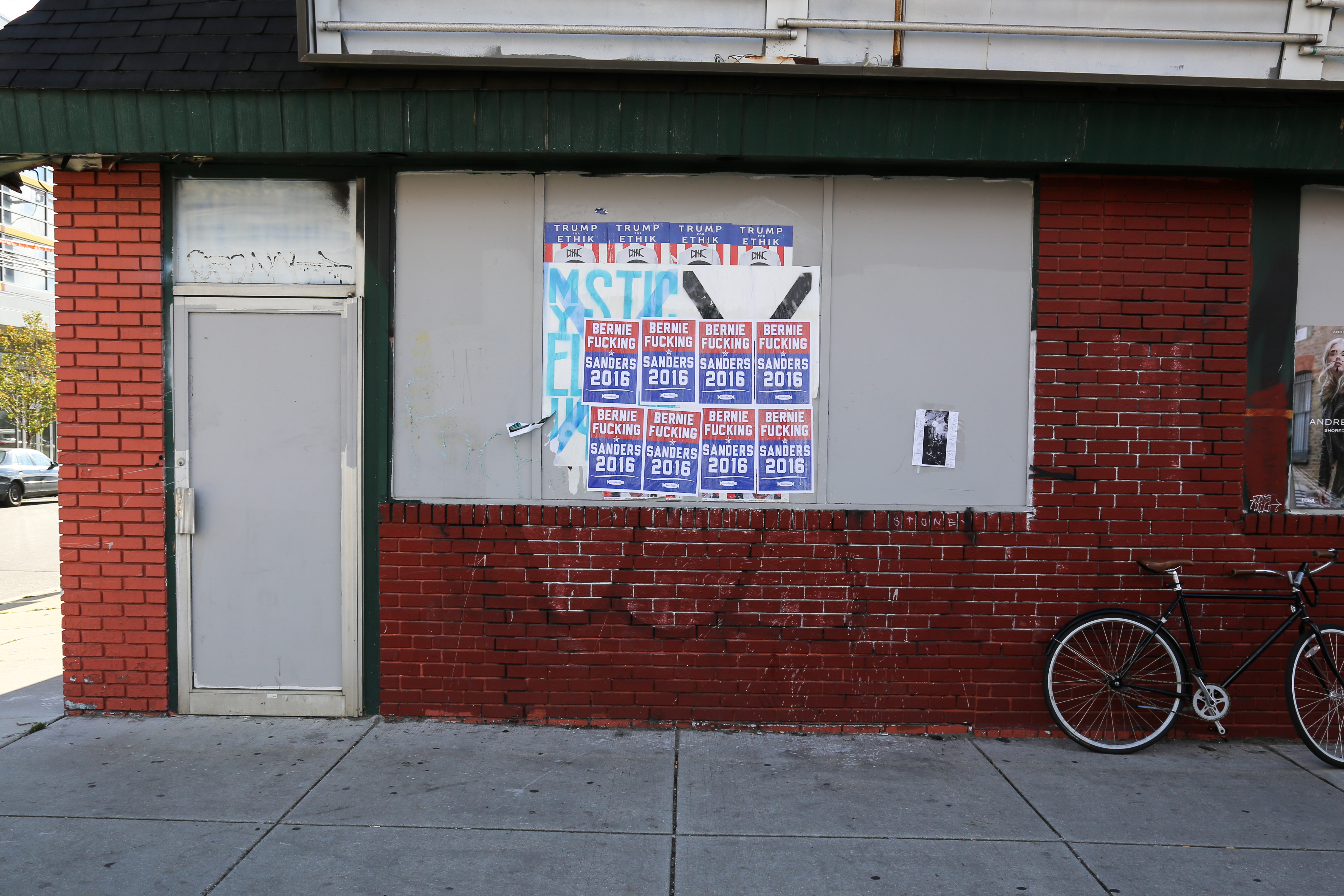 “As many people know, I recently covered a bunch of Donald Trump posters in Philly with my own Bernie Sanders posters. To give a back story, the Trump posters were advertisements for a store on South Street. They maintain that because they added gold teeth and their logo to his hat that the posters read as an ad for their shop not Trump. I disagree with this. We live in a dumbed-down, monkey see monkey do society and pasting a pop culture icon (and overall shithead’s) face all over our city appropriated to promote your store or not sends the wrong message. As young free thinking creatives we have a responsibility to be aware of our powers of influence and use it to our advantage to better society whenever possible. This store questioned why with a city full of walls why we would cover their posters. TO BE CLEAR THAT WAS THE POINT. Living in arguably the most progressive and liberal area of a swing state the last thing I want to see or have be seen is Donald Trump’s racist face staring back at me when I’m walking around my neighborhood… BERNIE FUCKING SANDERS FOR PRESIDENT. Stand for something or fall for anything.“
