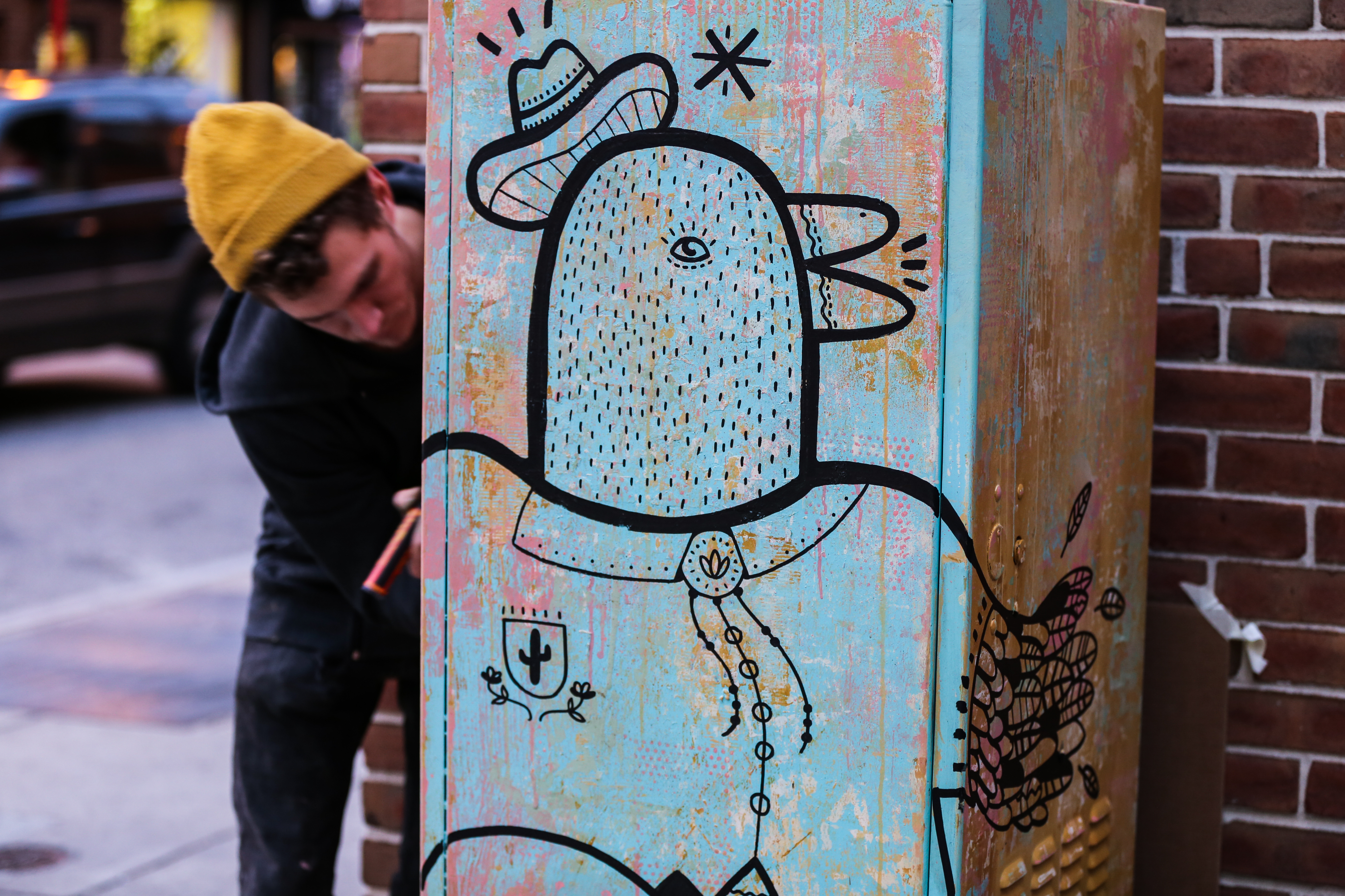 Ryan Psota, yesterday, joined a growing list of artists creating box murals for the INCREDIBLE, going on three-year-strong #HahaxPara community arts program!