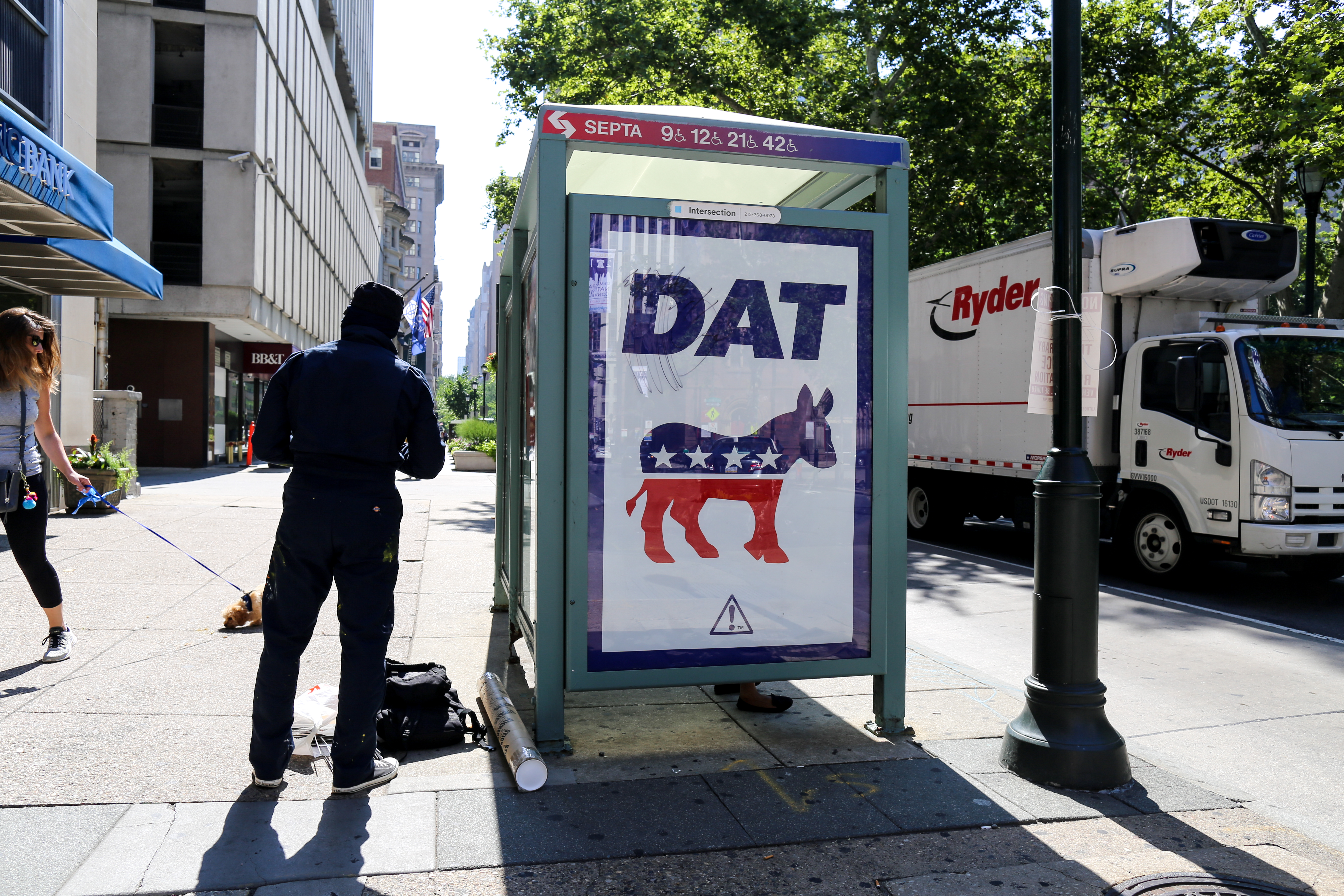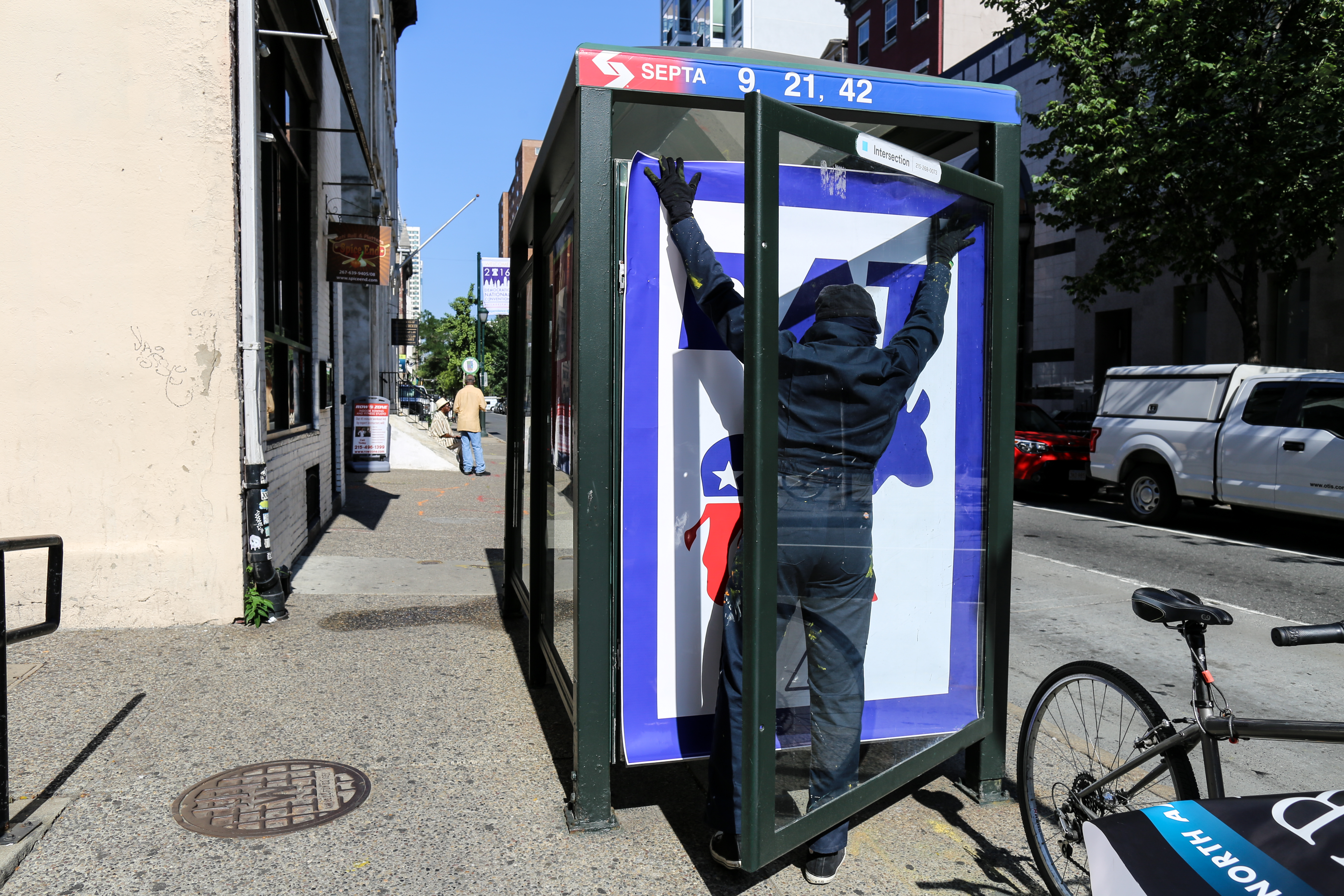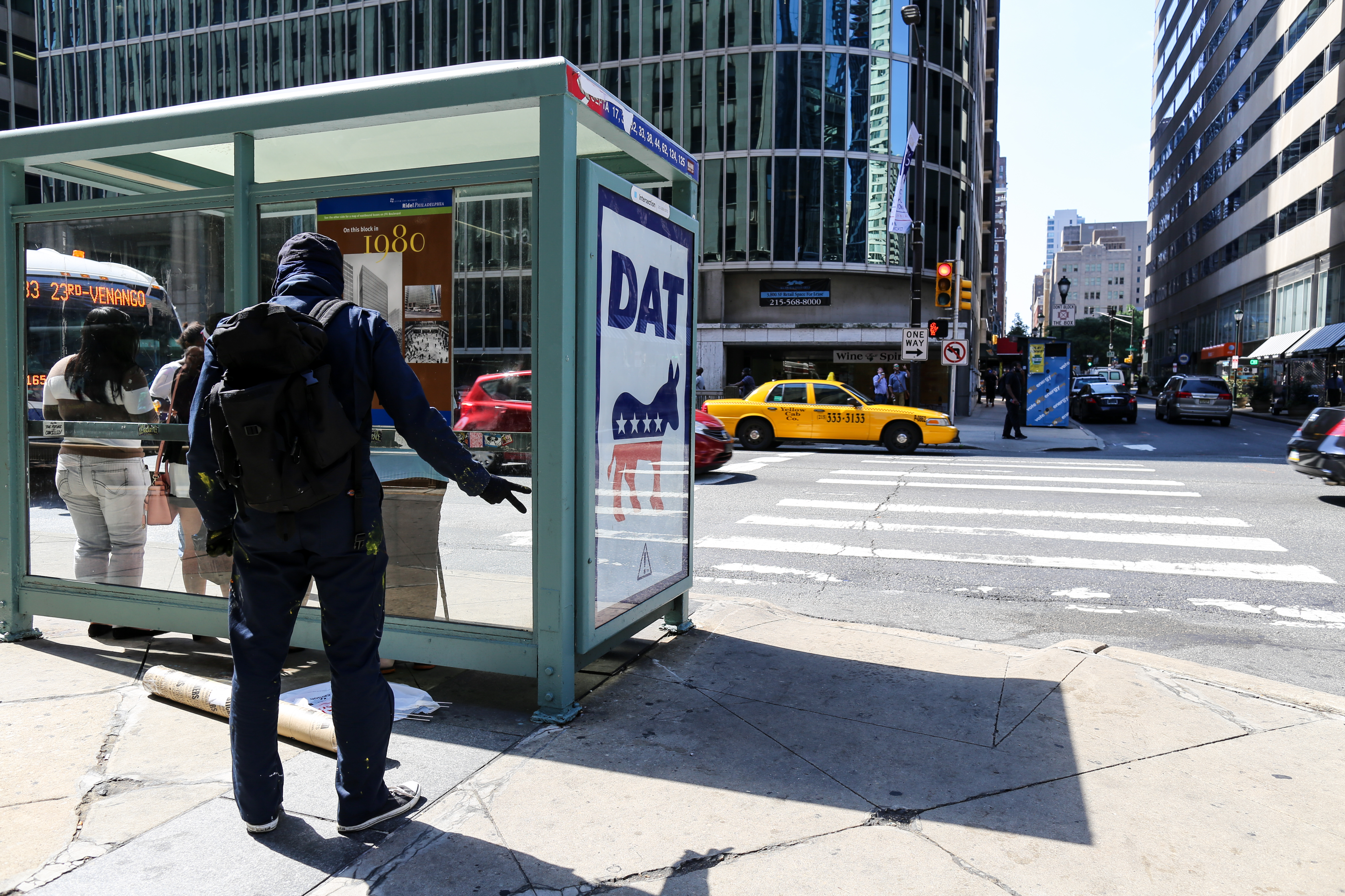 In a (likely impossible) effort to keep these bus shelter Ad Takeovers up through the DNC next week, I will not say where these installations took place, and if you know please feel free not to comment or put it on blast.