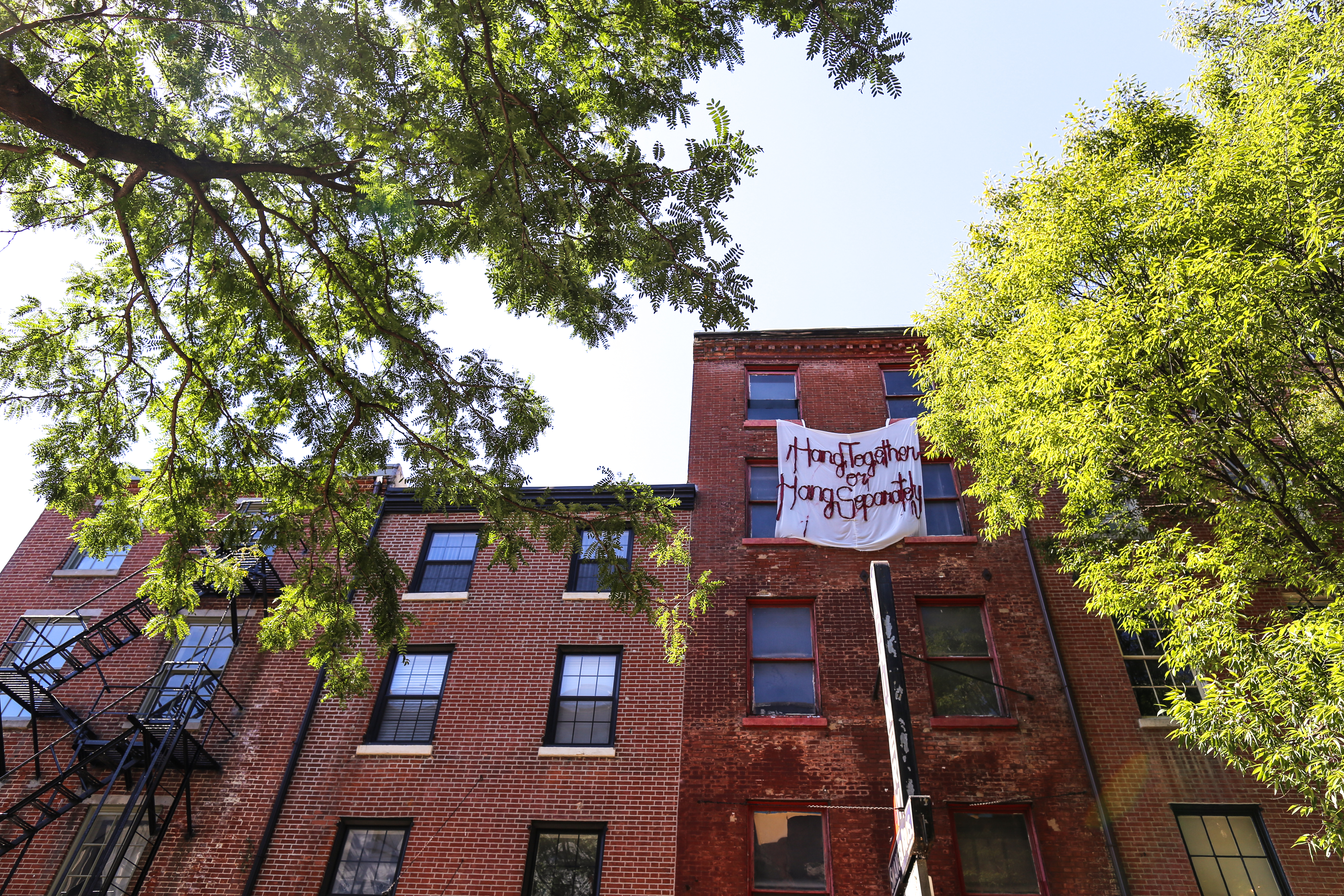 Aubrie’s latest installation reads, “Hang Together or Hang Separately”, referencing the famous Benjamin Franklin quote, “We must, indeed, all hang together or, most assuredly, we shall all hang separately.” Perfect for Old City!