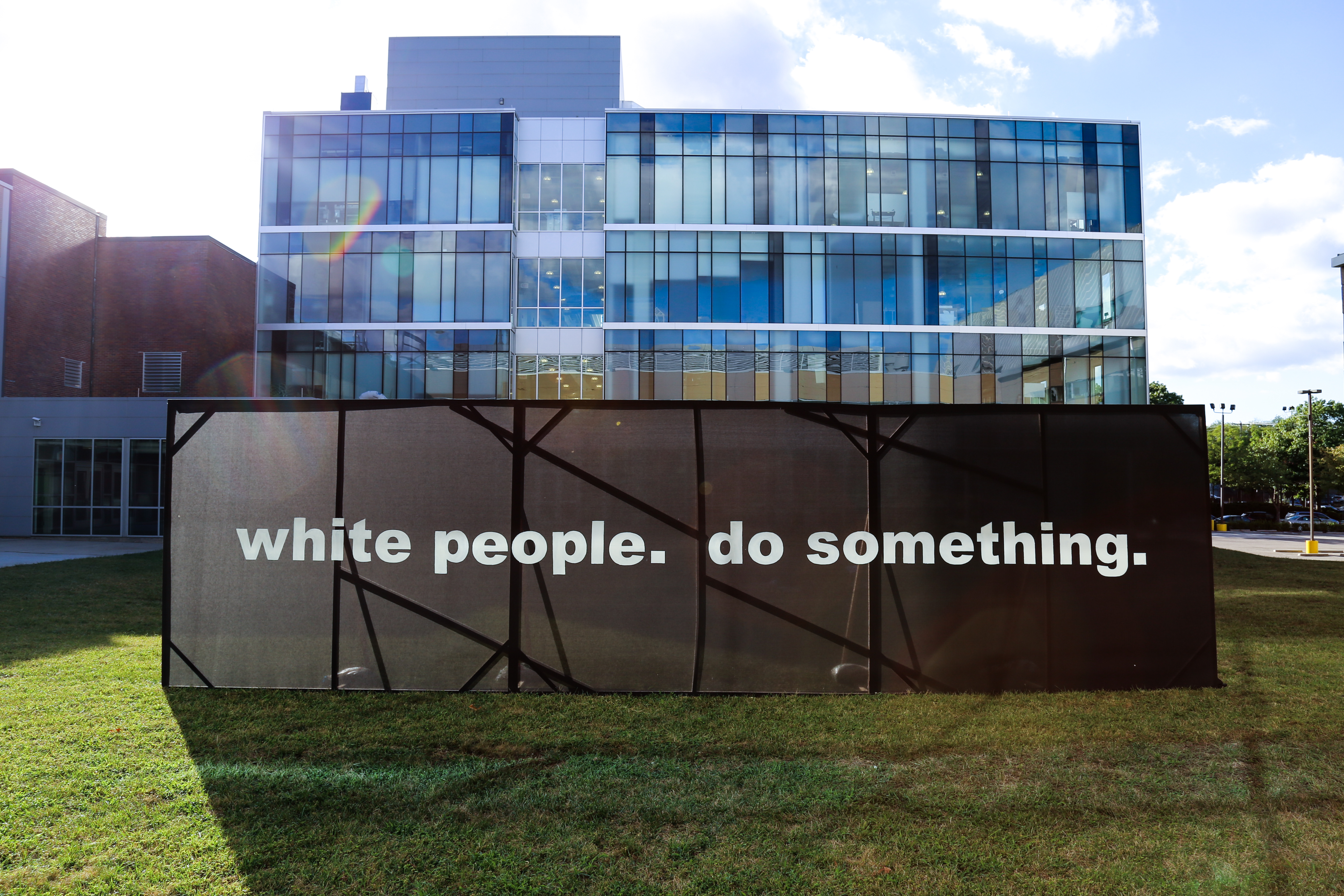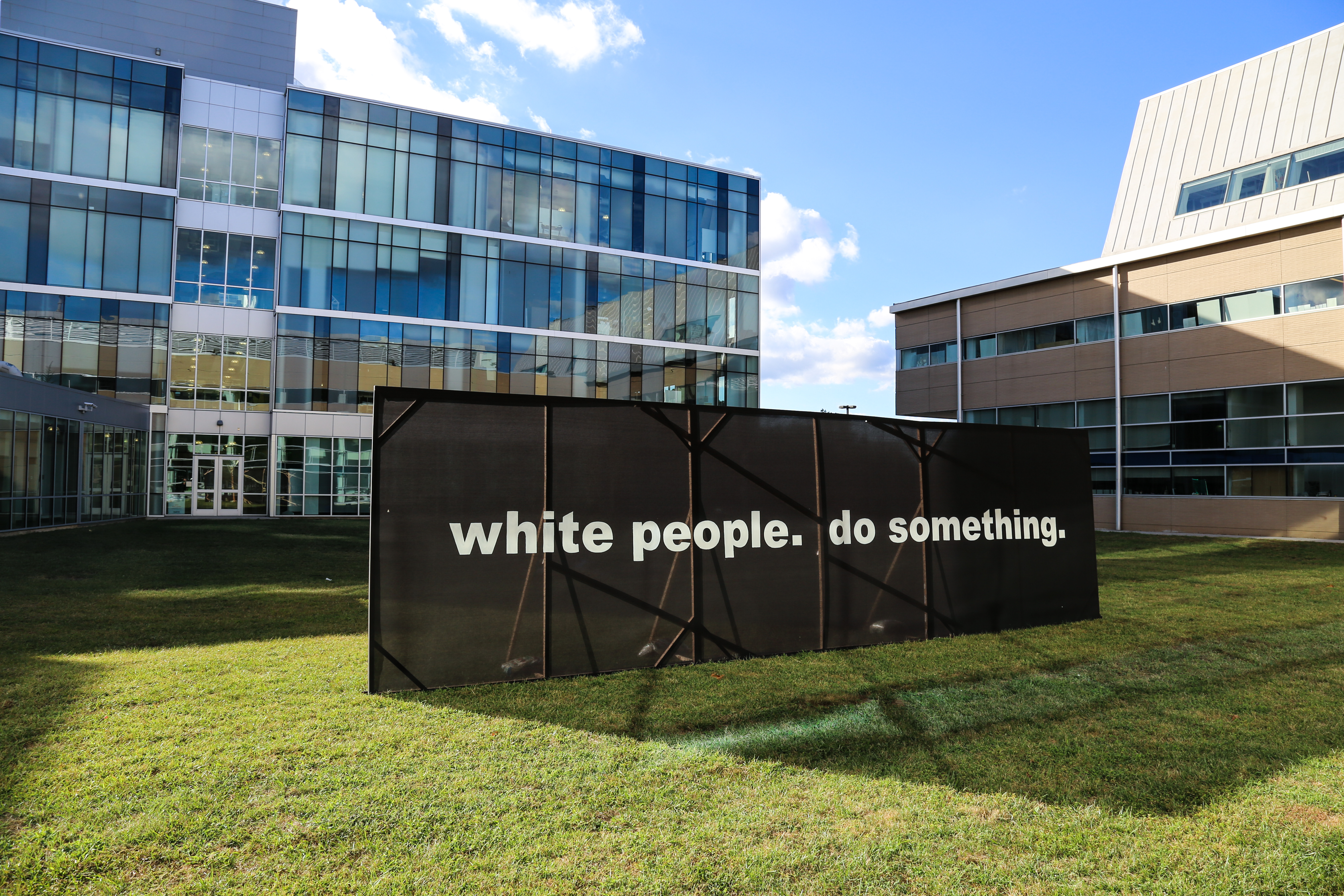 A new installation popped up Thursday on the campus of Temple University‘s Tyler School of Art. Created by Kara Springer, a Tyler Sculpture graduate student, the piece is to the point: “White people. Do something.”