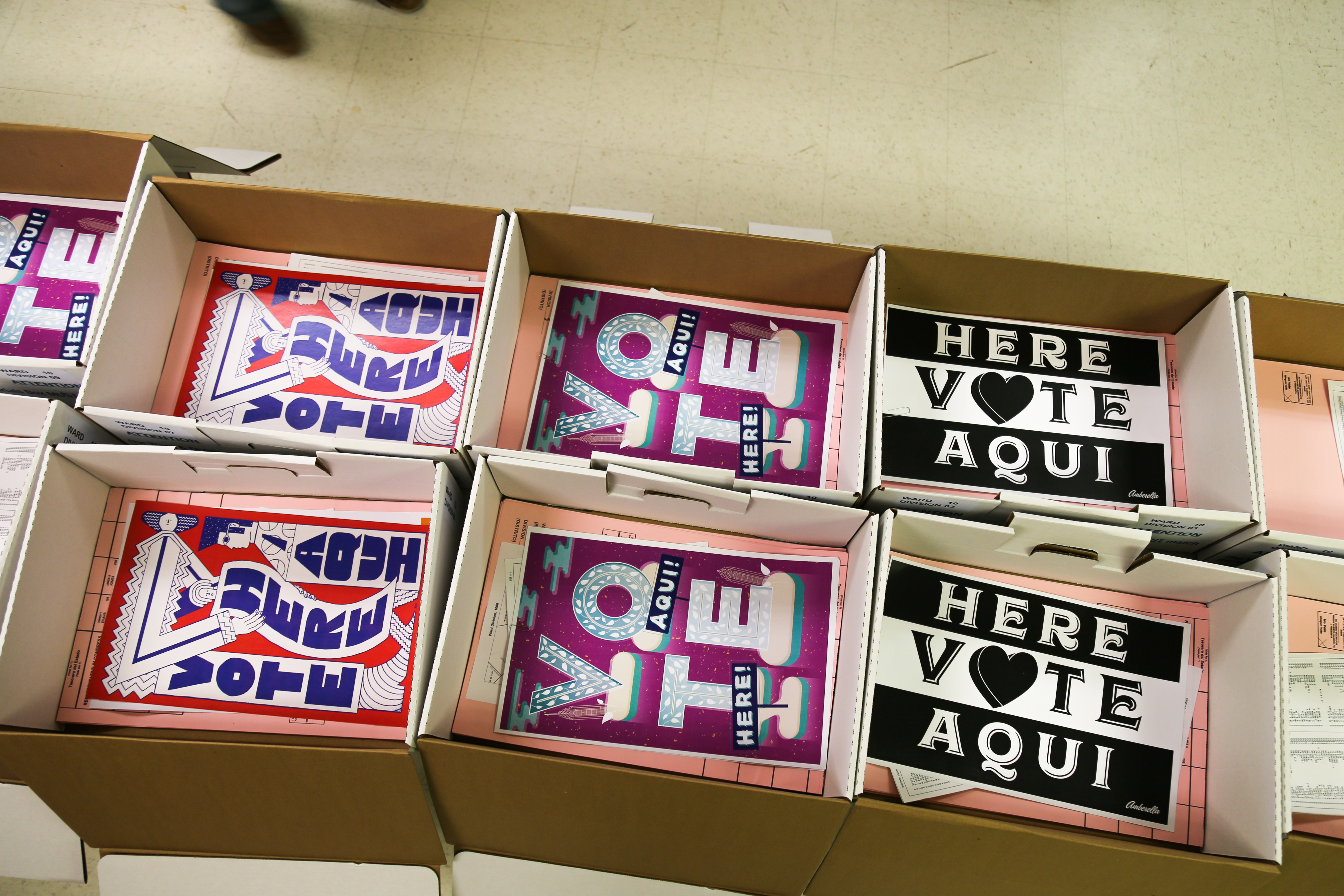 City Commissioners Lisa Deeley and Al Schmidt packing our artist-created “Vote Here/Aqui” posters into Philadelphia’s official voting boxes!