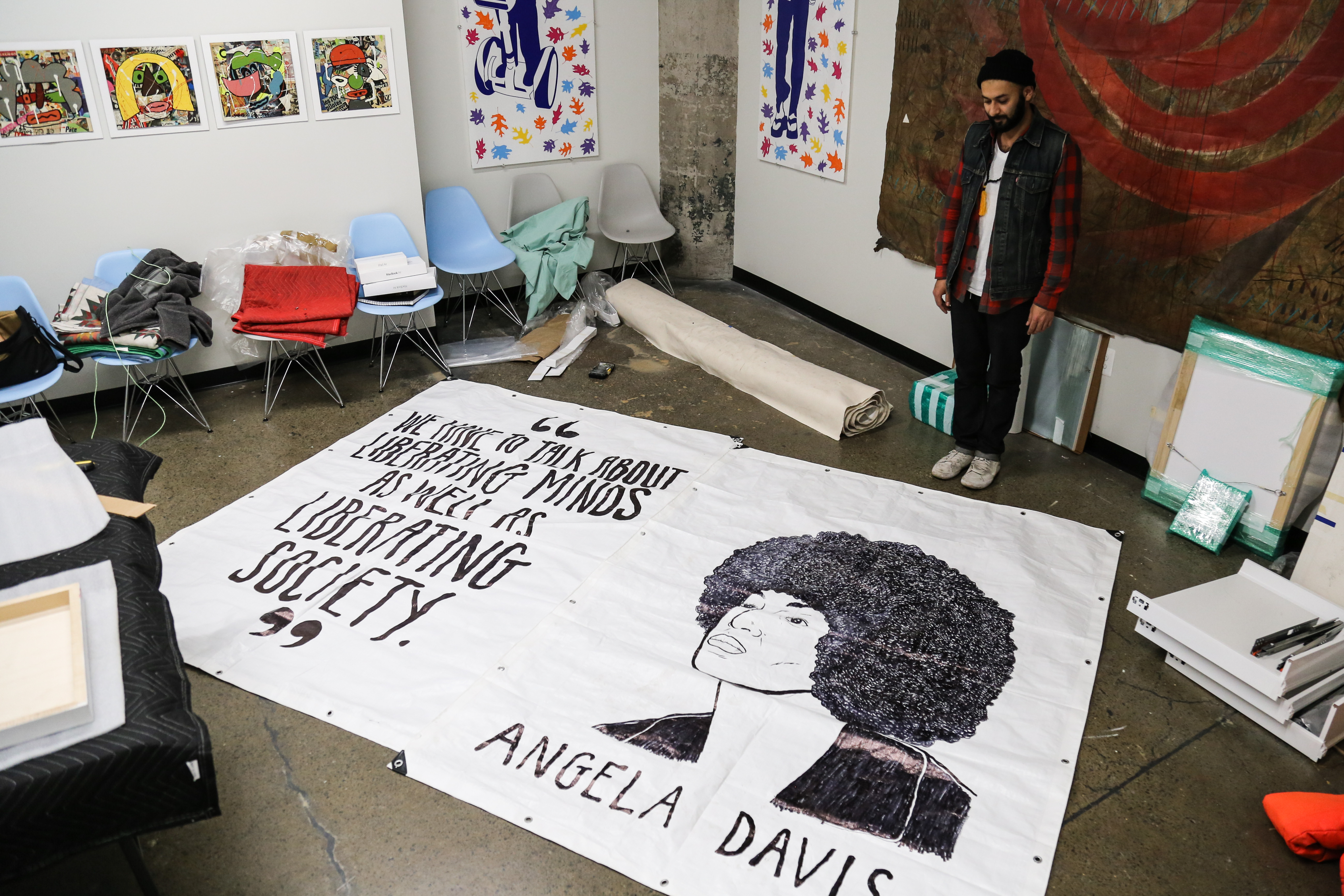 Organized in Philadelphia by curator Eric Preisendanz, artist Aubrie Costello, photographer Conor Gray, and StreetsDept.com Founder/Editor Conrad Benner, Signs Of Solidarity began with the idea a couple of weeks after the election to hang a few banners from a few private homes, but quickly evolved into a massive citywide effort combining the passion and drive of over 30 Philly-area artists, writers, poets, and creatives with the permission and coordination of dozens of local building and business owners. And in late December the project grew to include 30 more artists and buildings in Atlanta after a group of Atlanta Arts organizations heard about the project through one of the Philadelphia participating artist, Michelle Angela Ortiz!