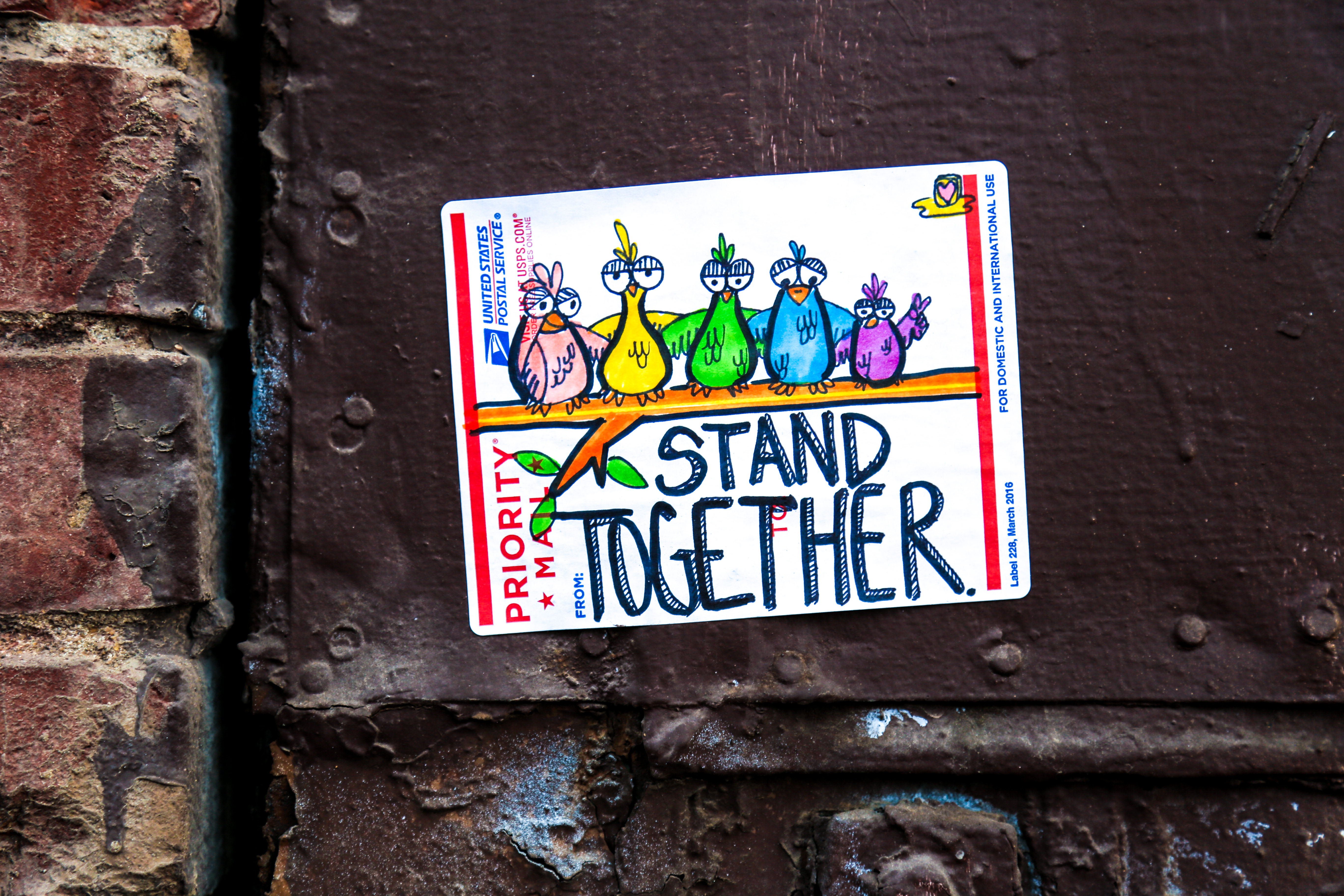 Philly artist Alex Sayer has created little series of stickers encouraging people to “Stand Together.” In a recent Instagram post, the artist comments: