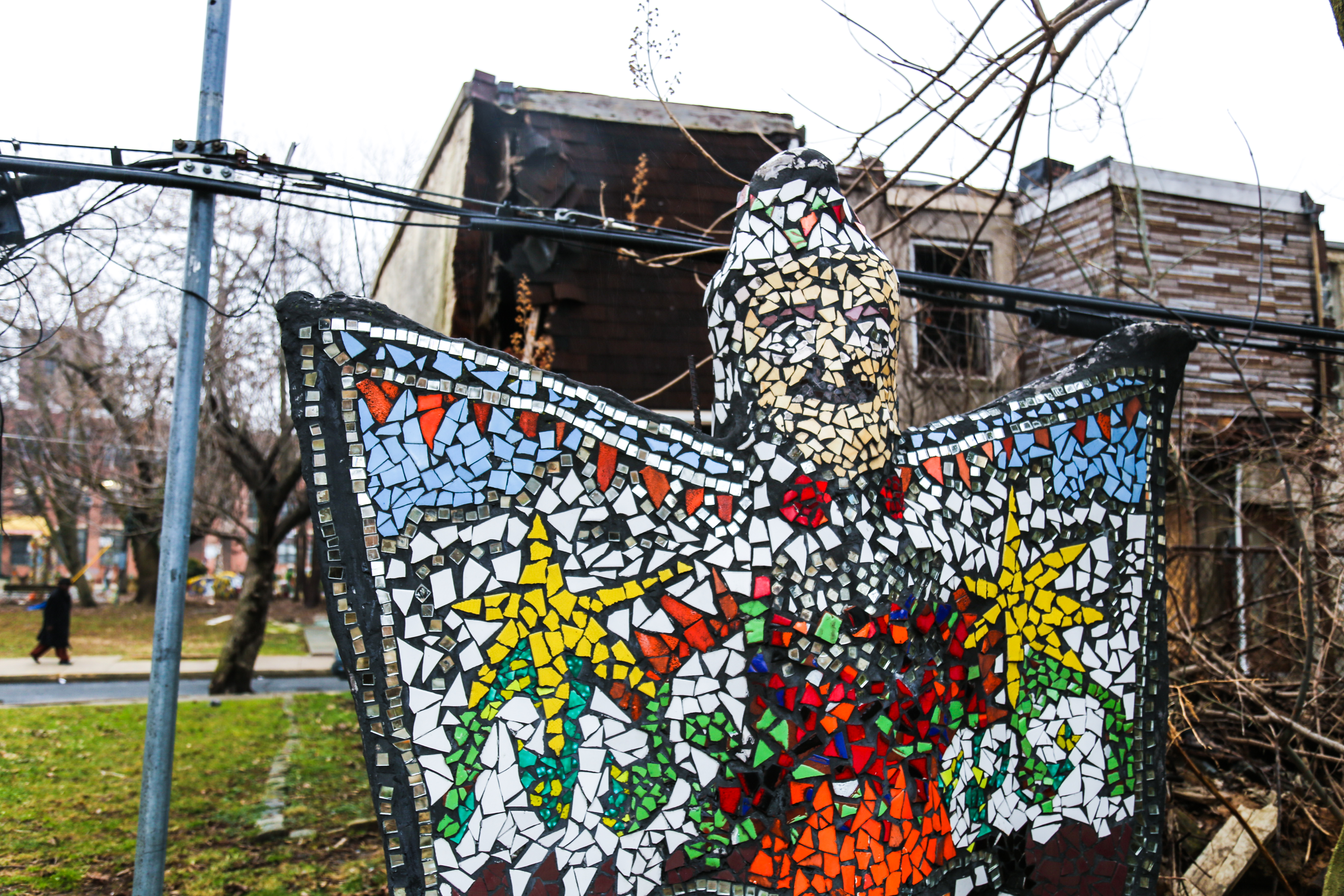 Olanrewaju (aka Lanre) is a painter, sculptor, and performance artist from Abeokuta, Nigeria who works in discarded materials. When he arrived in North Philly, Lanre surveyed the streets for materials and inspiration. He often came across candles, bottles, and teddy bears — the remnants of temporary memorials created by community members grieving a death in the neighborhood. In conversation with Village staff and community members, Lanre decided to respond to the community’s need to remember its loved ones through art.