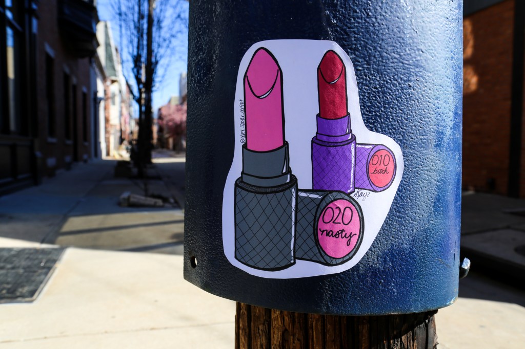 Relatively new Philly street artist Alex Sayer has just put up a new series of stickers and wheatpastes, titled the ‘Lipstick Series’, which addresses the many countless insulting and sexists labels there are for women.