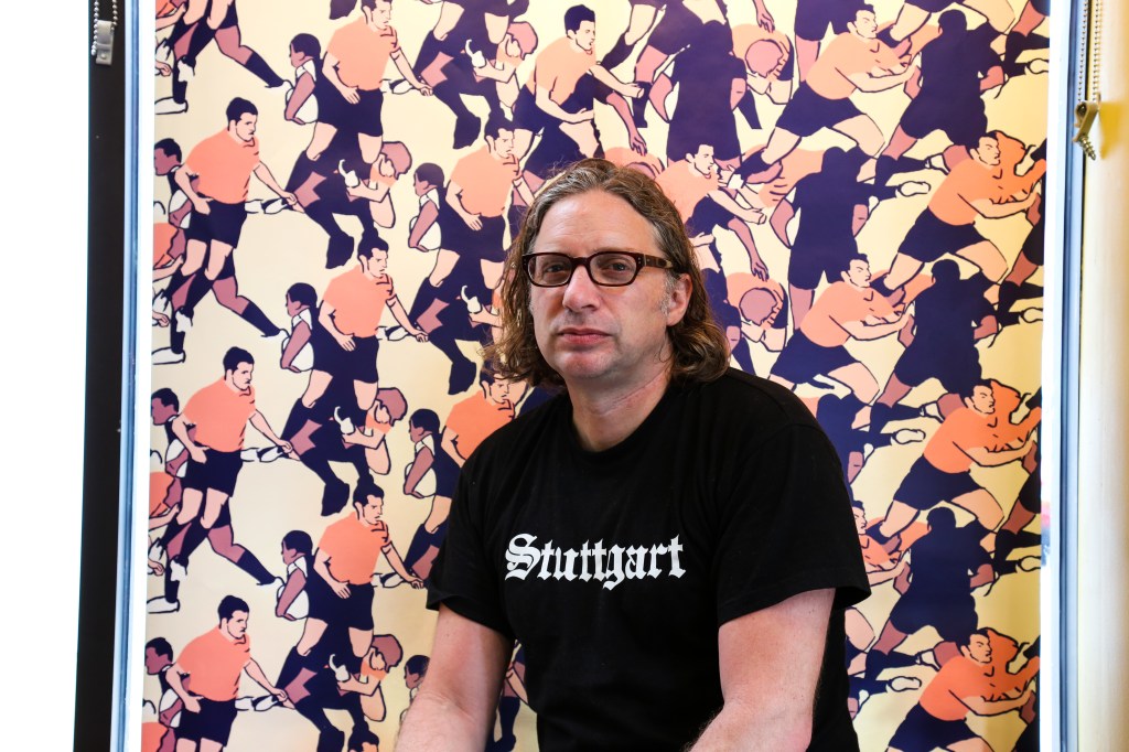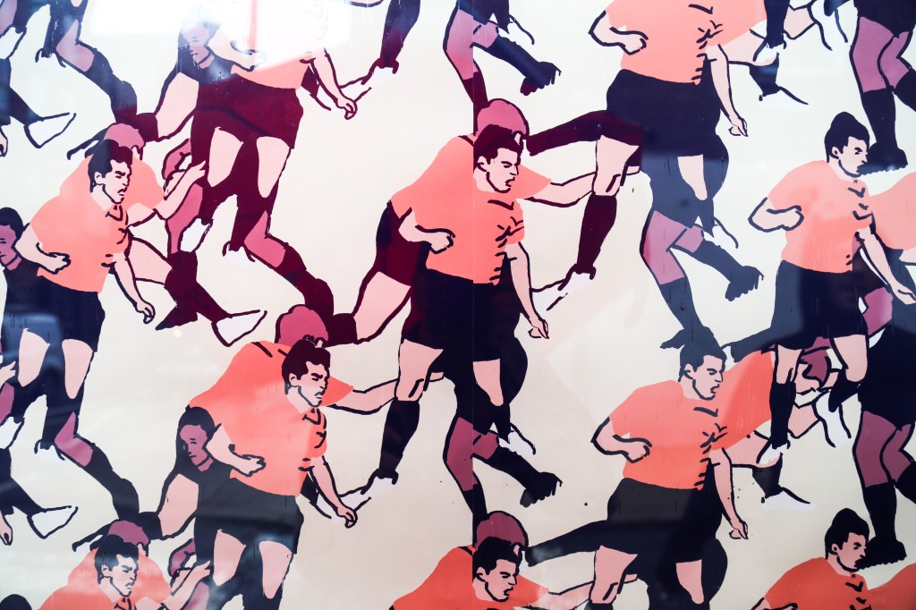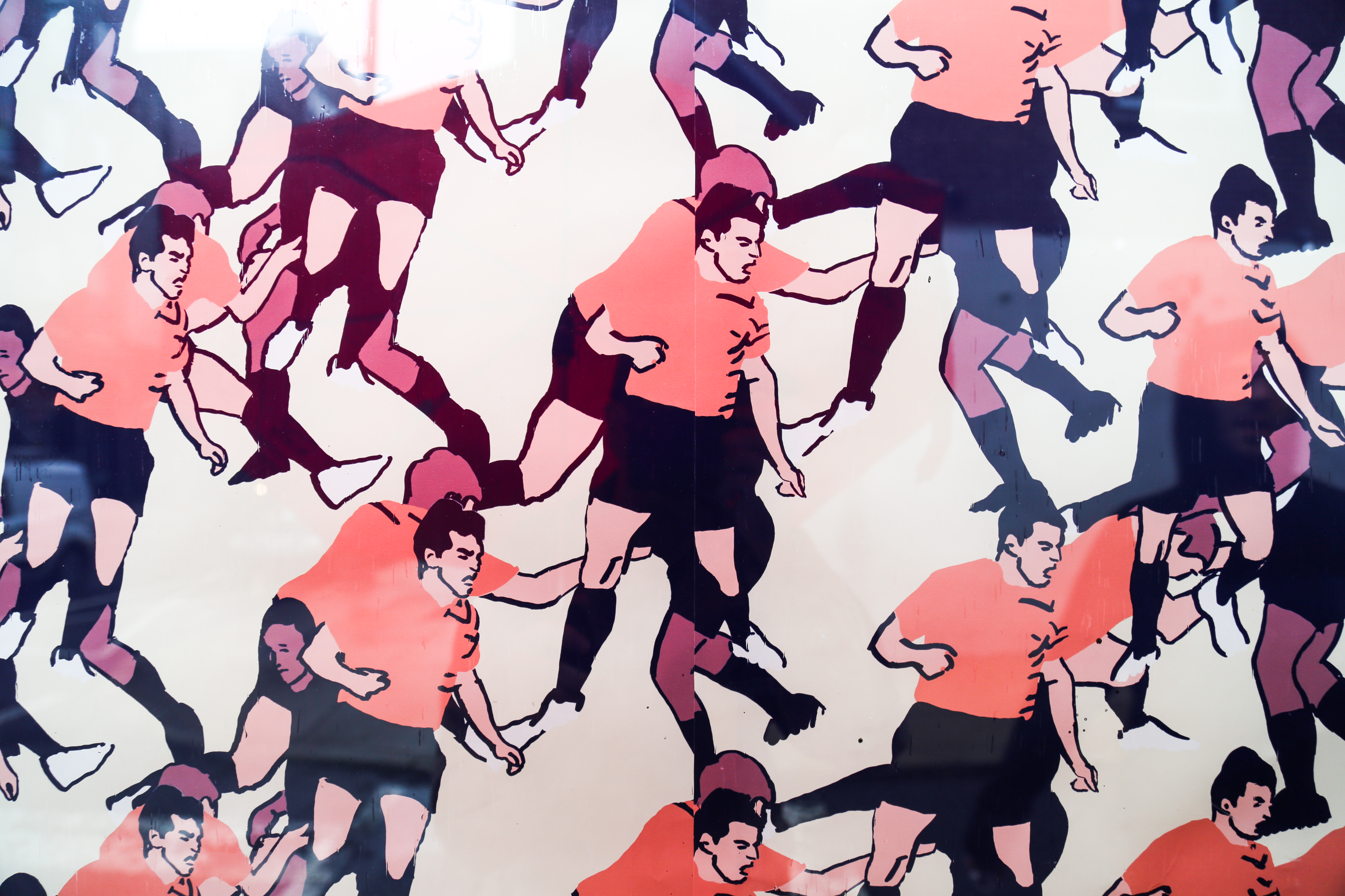 This installation is a sketch for TRIPARTITE, an immersive room-sized installation using a custom wallpaper pattern involving 80 to 100 sequential drawings. The custom wallpaper is designed to fit the entirety of four walls using a rendered narrative that progresses and ultimately repeats; the story ends where it begins. In the final narrative-based wallcovering, three illustrated figures distinguished from one another by race, gender and costume will depict a tumult over the balance of power. (In this sketch actors are not used, instead found footage taken from a rugby match is used to investigate movement and the relationship of three figures) The drawings are set in a simple drop repeat formation akin to traditional surface design i.e. wallpaper and printed textiles.