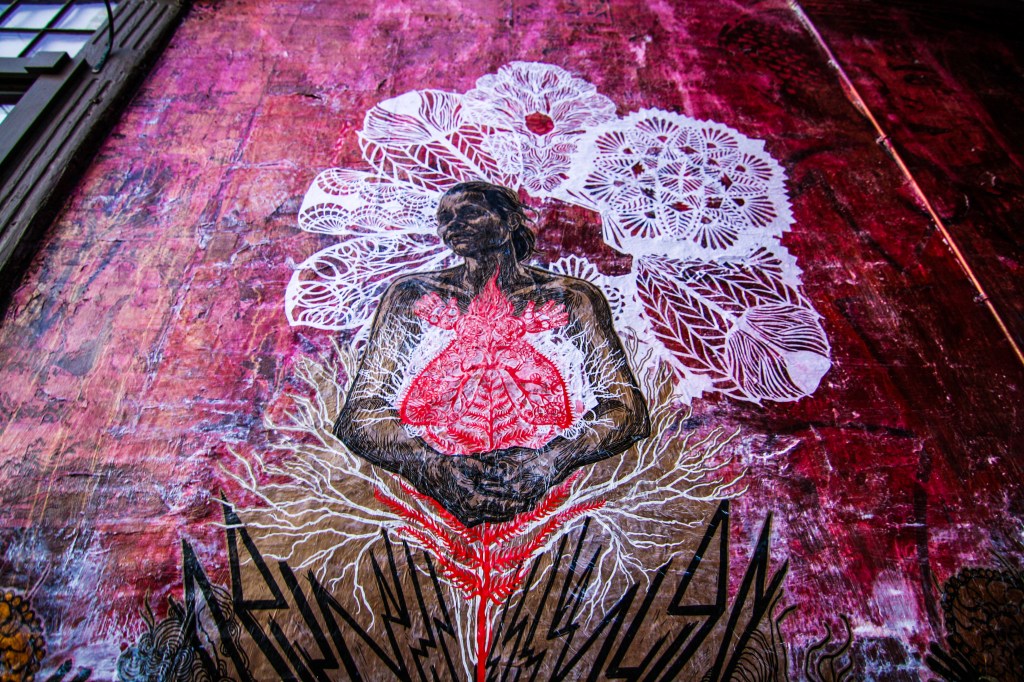 Swoon started putting her artwork on the streets of New York City in 1999, when she was in school there studying at the Pratt Institute. Through hard work, persistence, and incredible talent, her career took off in the 2000s. As the bio reads on her website: “Swoon has spent the last 14 years exploring the relationship between people and their built environments. Her early interventions in the urban landscape took the form of wheat-pasting portraits to the walls of cities around the world, and her public practice has expanded to using art to rebuild communities and humanize today’s most pressing social and environmental issues.”