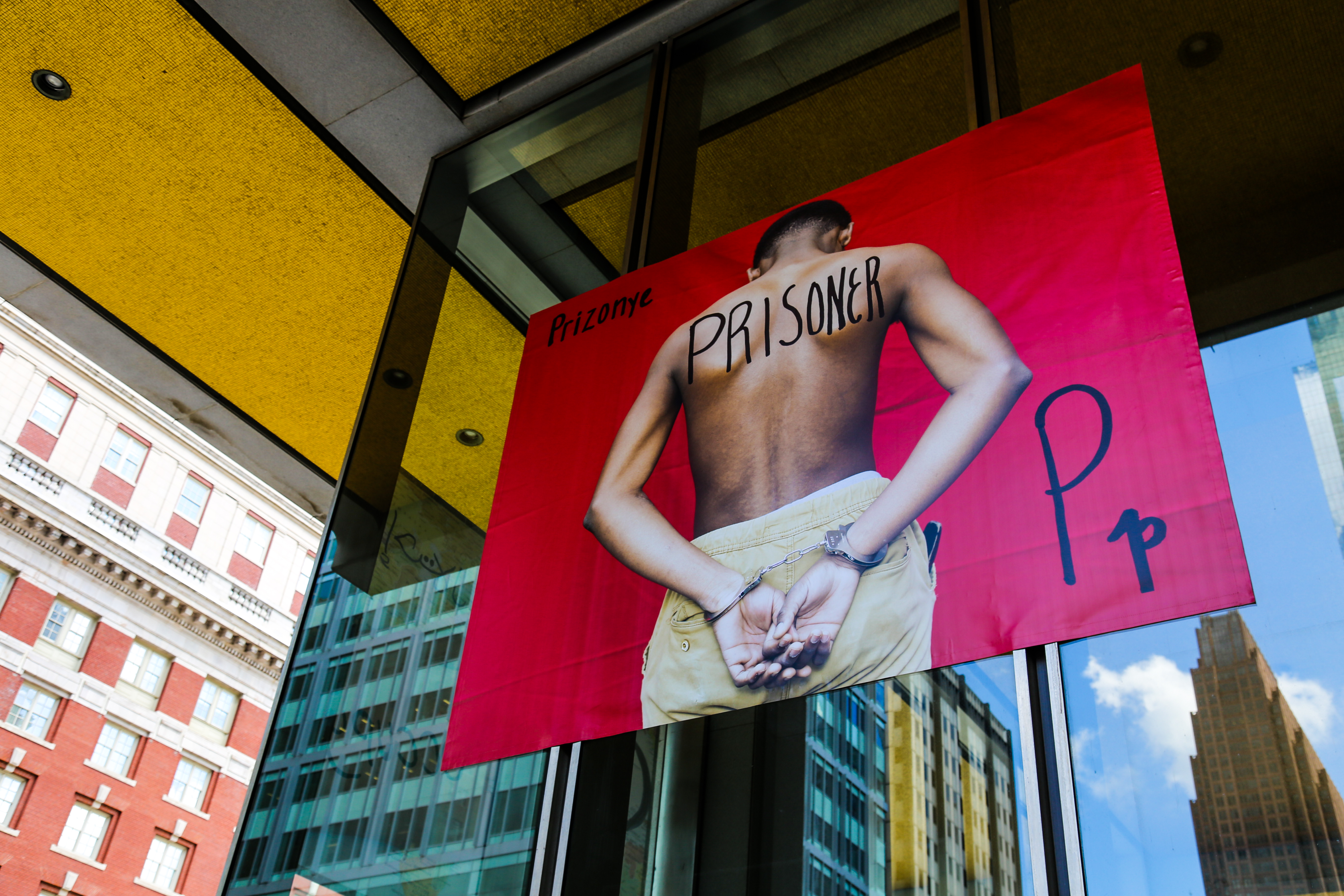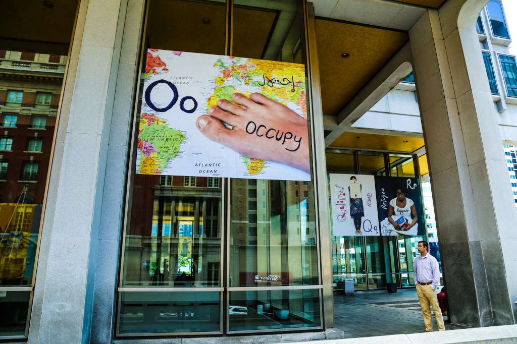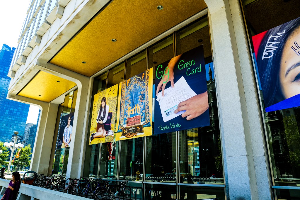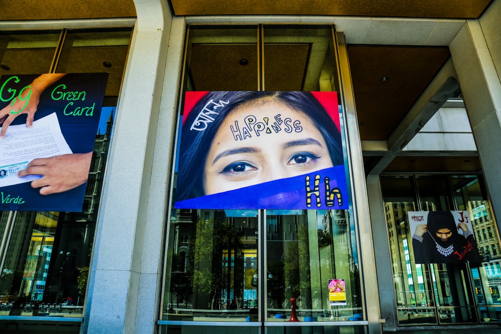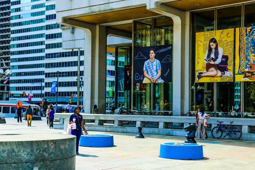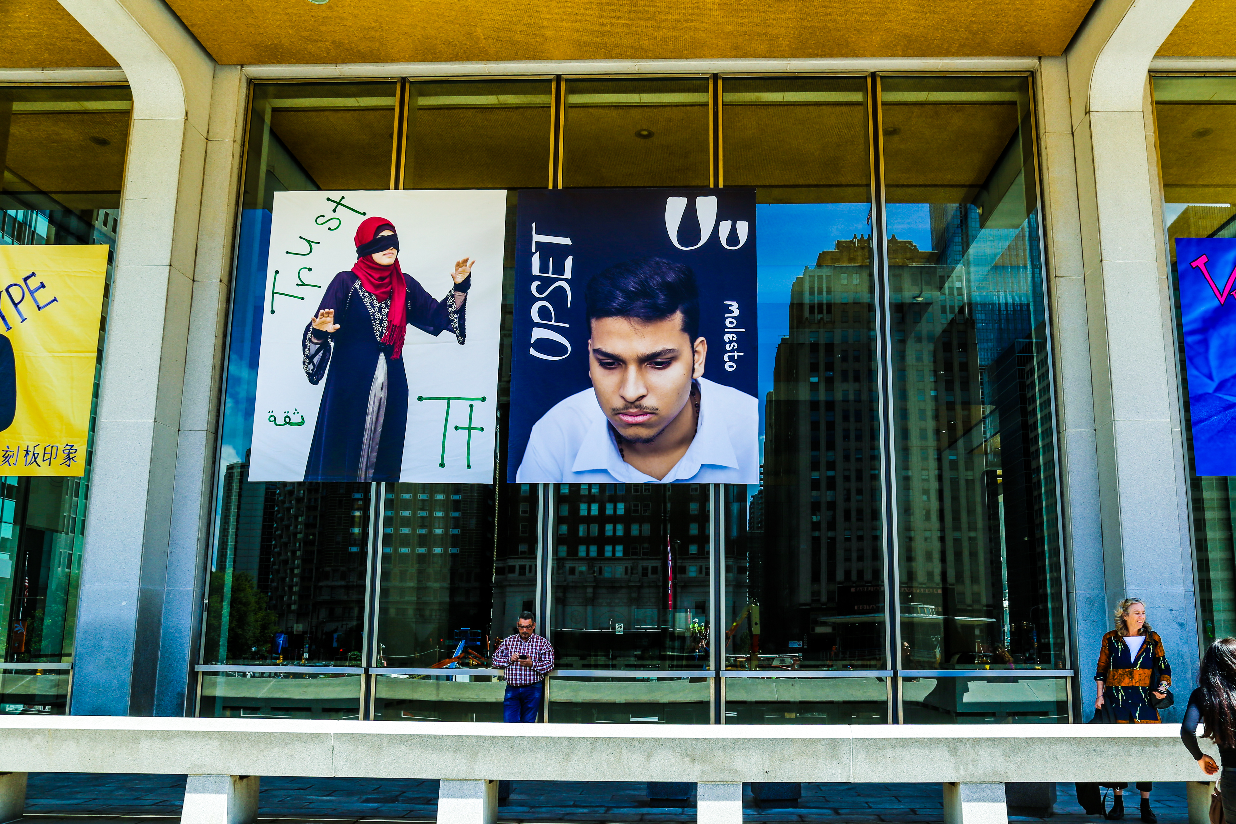 In early Septmeber, Al-Bustan Seeds of Culture installed large banners all around the Municipal Services Building in Thomas Paine Plaza (at 15th street and JFK boulevard) that explore and honor the immigrant experiences of many young Philadelphians. The public art installation, titled An Immigrant Alphabet, features the work of artist Wendy Ewald (photographed above) in collaboration with Northeast High School students, and it will remain up through December 2017!