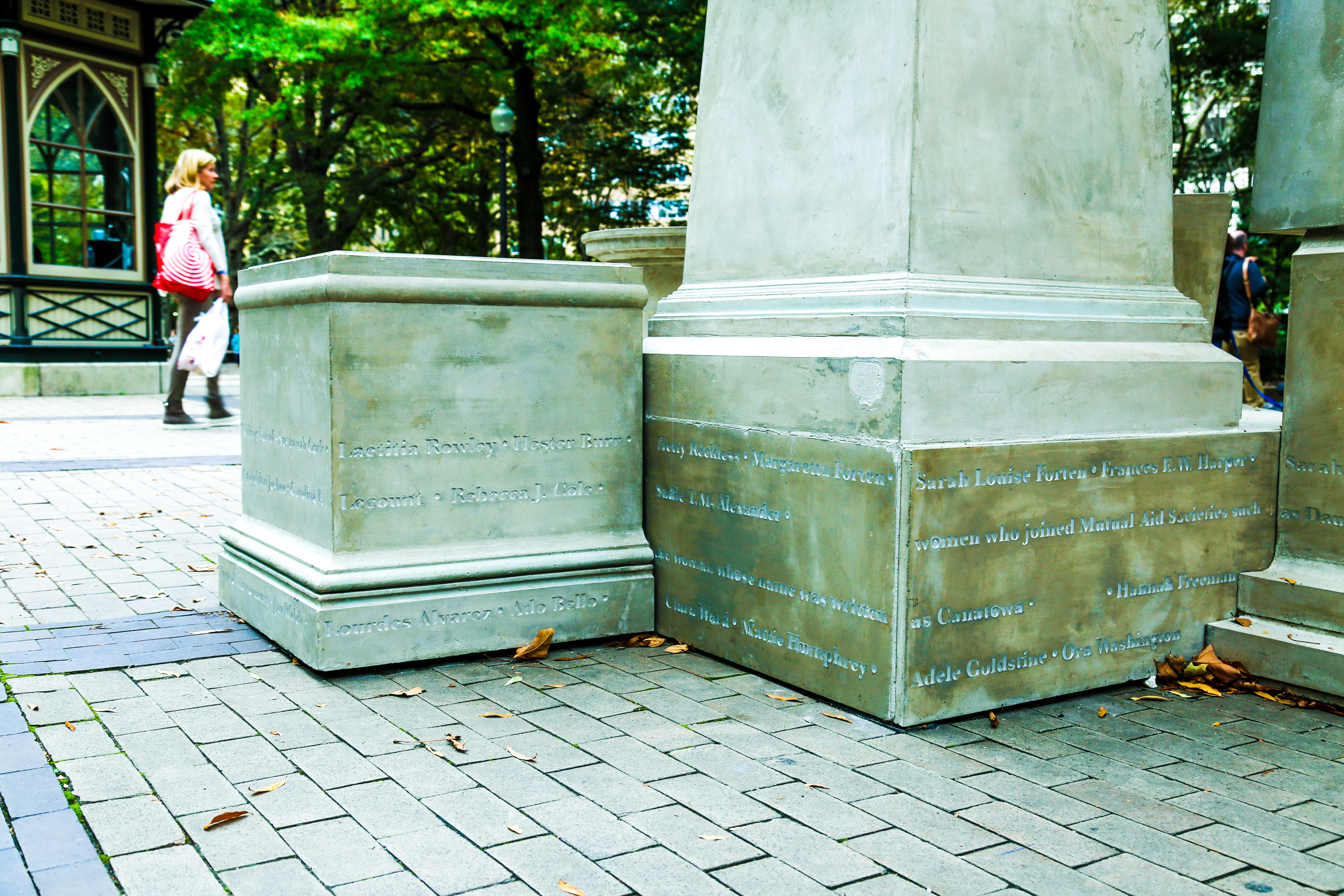 “Although the city of Philadelphia is home to over 1,500 public sculptures, there are only two that celebrate the life of a real, historic woman – Joan of Arc and Mary Dyer, neither of whom were Philadelphia residents.” Sharon writes in her Artist Statement. “If They Should Ask is a temporary monument located in Rittenhouse Square that addresses the absence of monuments to women in the city of Philadelphia. The object is a collection of cast concrete pedestals sourced from existing monuments in Philadelphia and materialized at half-scale. Encircled with the names of women who contributed to civic and public life in Philadelphia from early European contact to the present day, If They Should Ask proposes that the persistent and aggressive exclusion of women from this form of public recognition perpetuates historical misunderstandings and reproduces inequality in the city’s economic, social, political, and cultural spheres.”