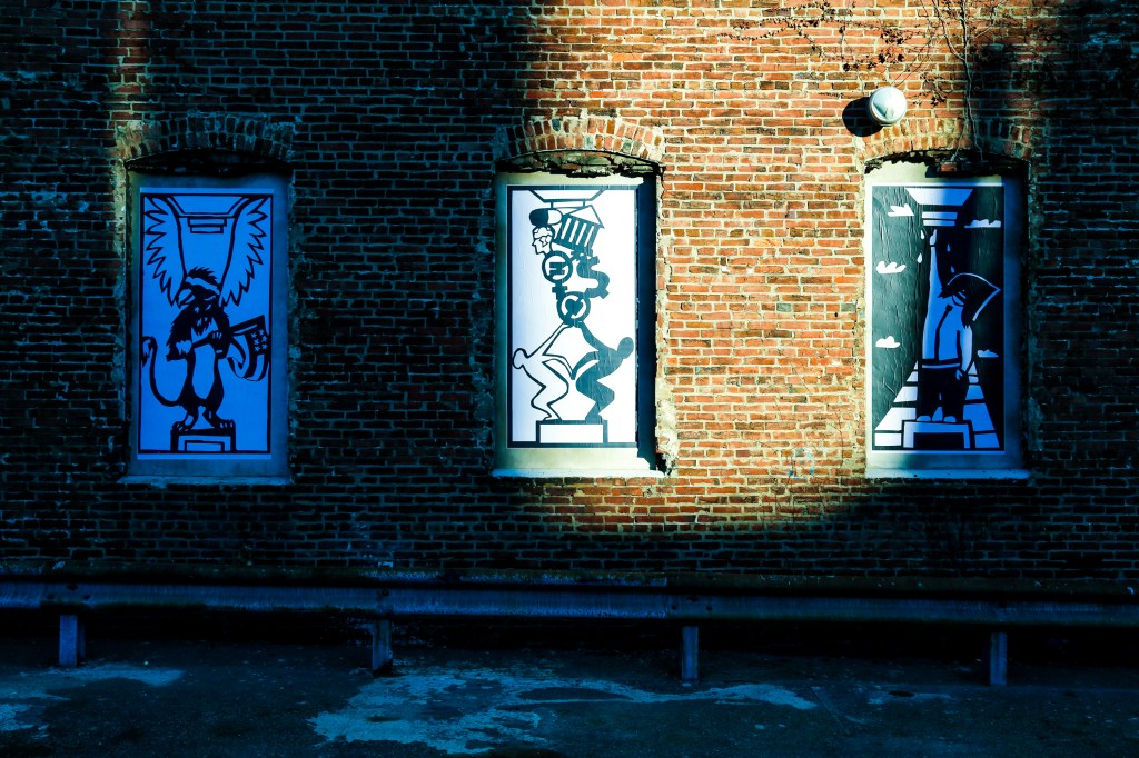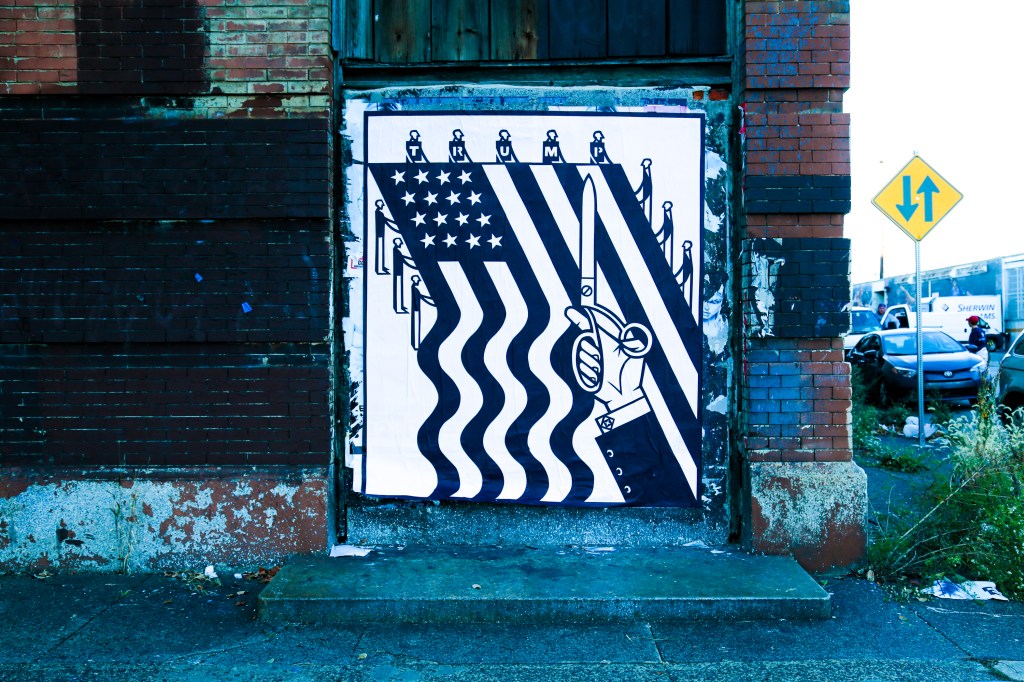 “I intended to make a poster for my front window to rile my Trump supporting neighbors. It started out as only text reading, ‘True patriots reject Trumpism.’ As I worked on it, this image emerged… It’s a response to how Trump prefers jingoistic pageantry to true patriotism and how his supporters enable the desecration of our country.”