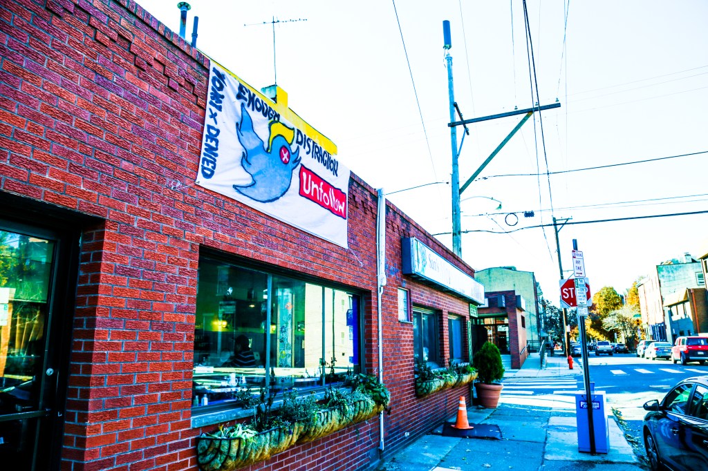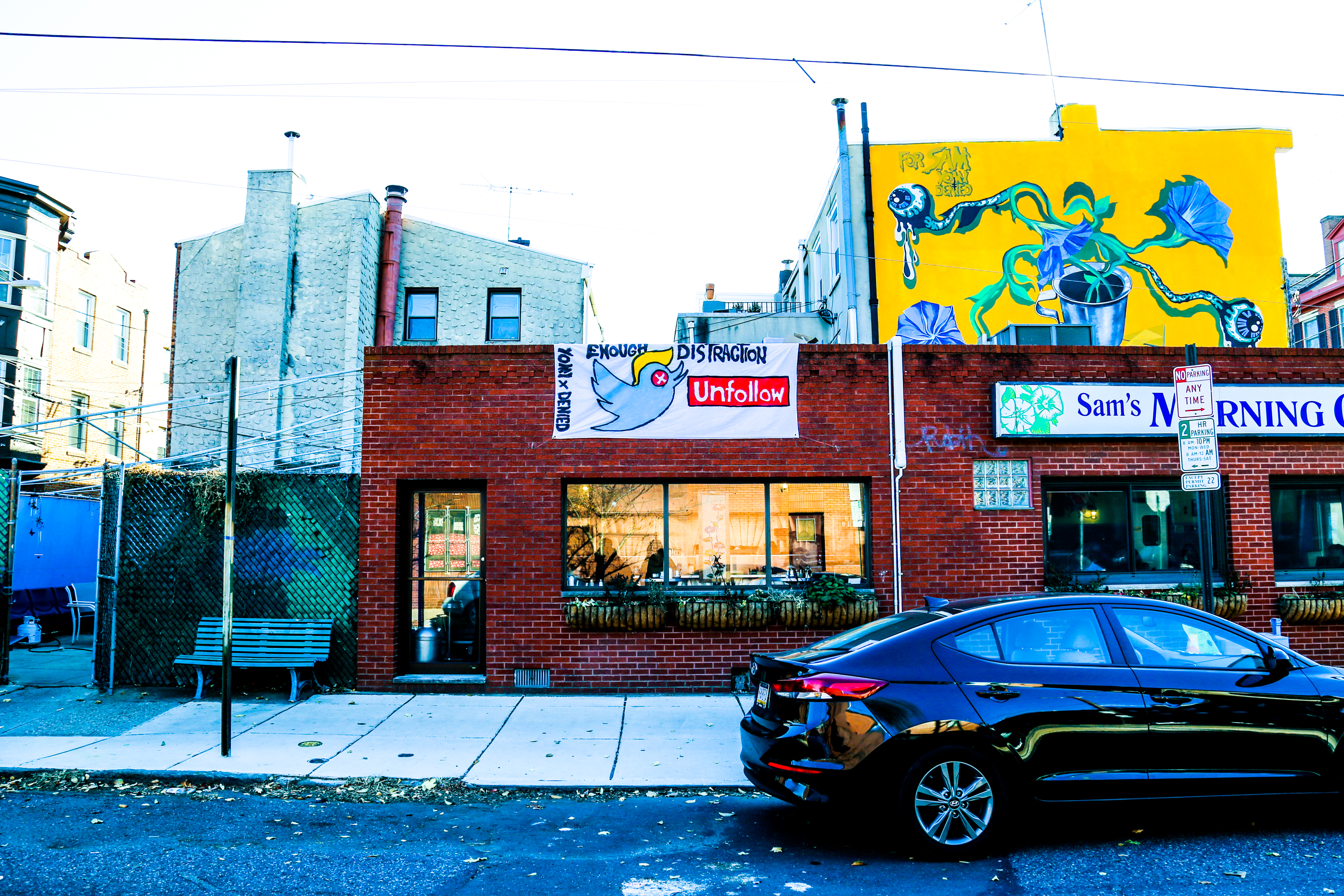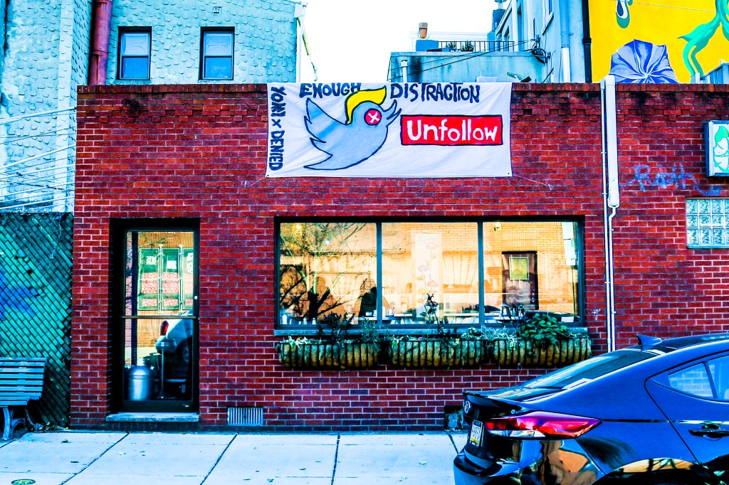 A new installation by a pair of Philly street artists outside a popular Philly brunch spot encourages everyone to unfollow President Trump. The banner is a collaboration by YOMI and DENIED, and it’s been installed with permission outside Bella Vista’s Morning Glory Diner at 10th and Fitzwater streets.
