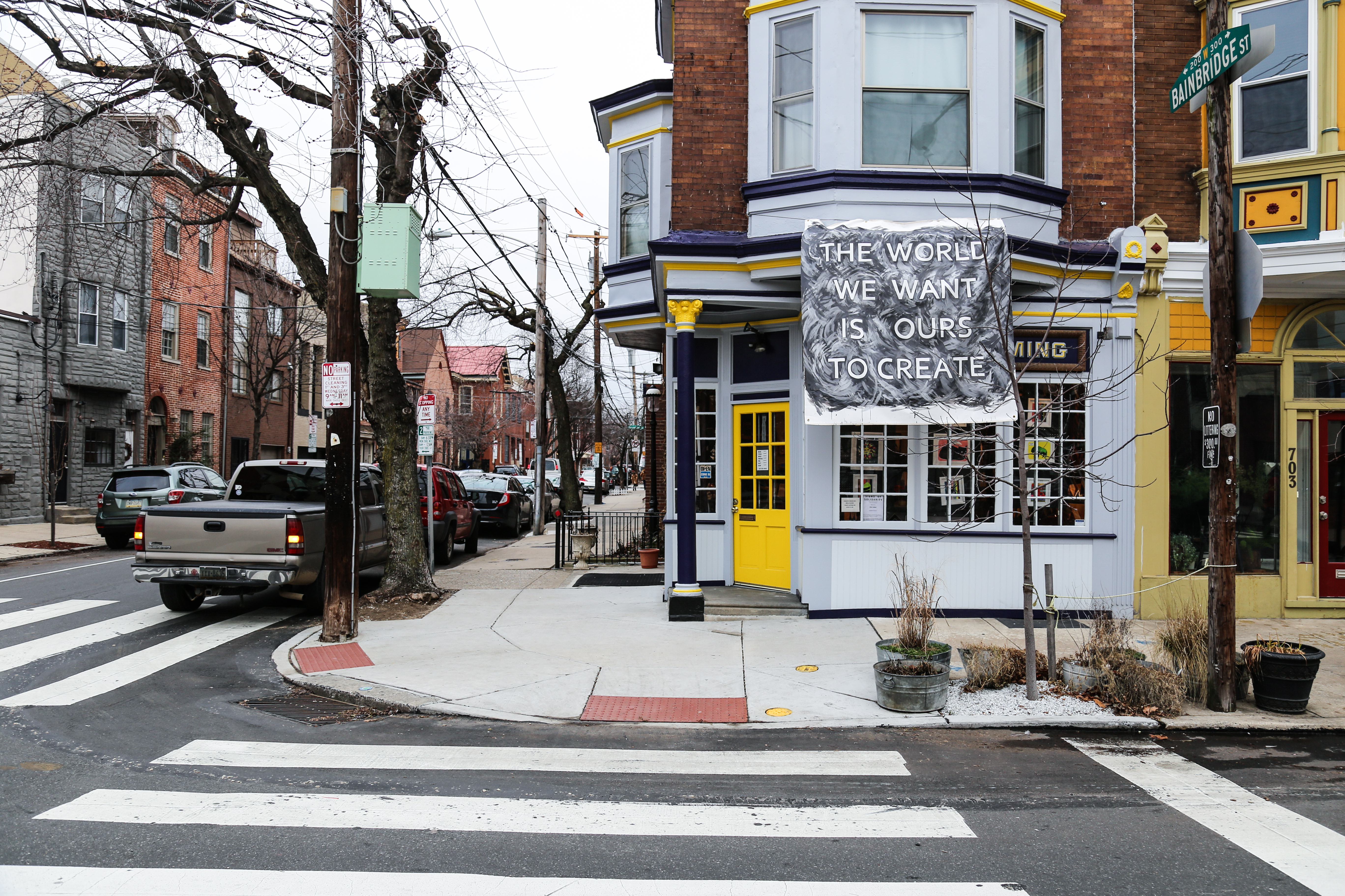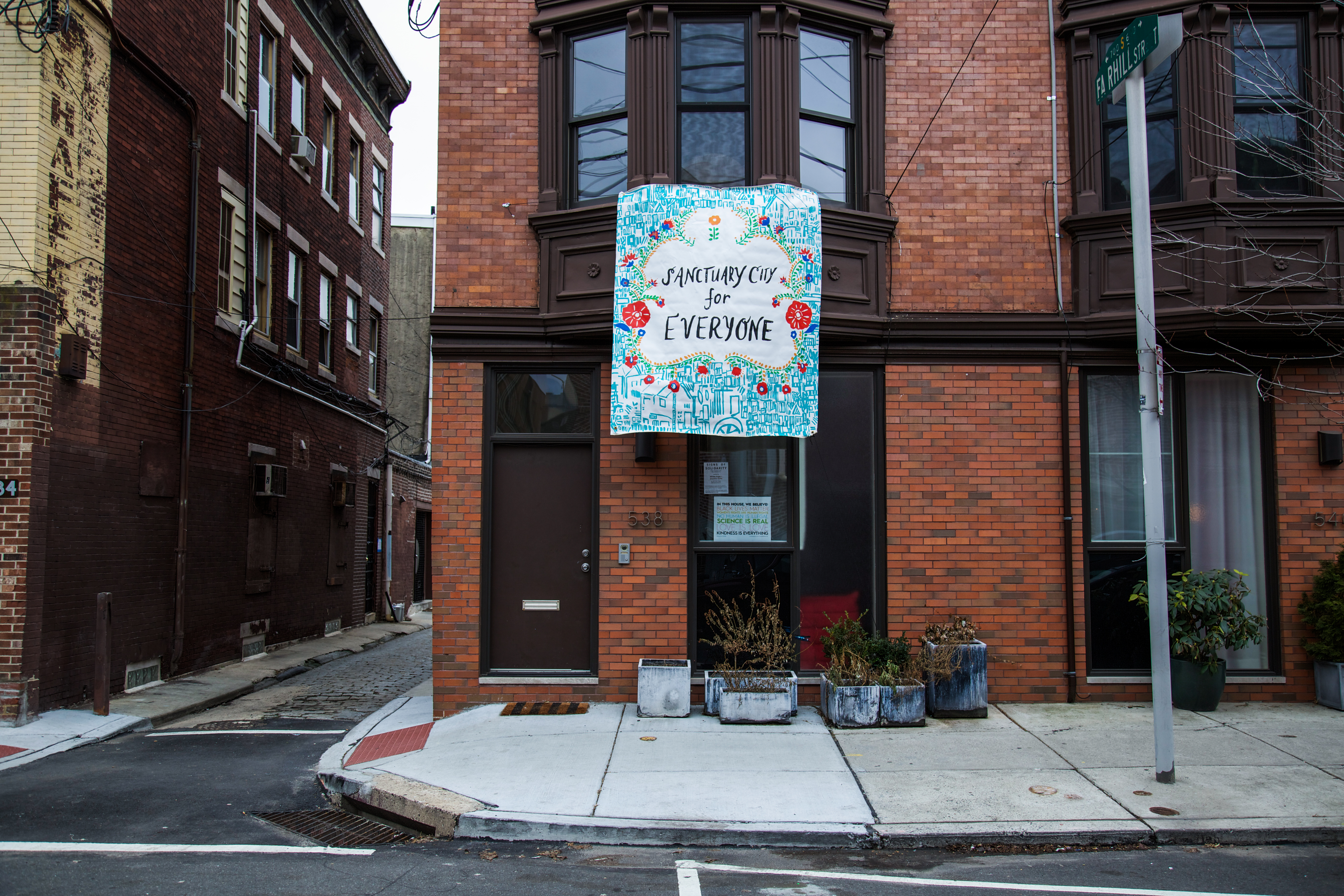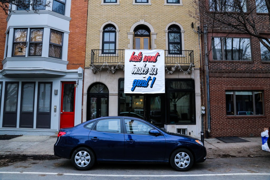 The artist-created signs hung prominently around the city for the entire inauguration weekend (some even longer) and read messages like “hate won’t make us great” by Nero on a private home in Bella Vista, “build bridges not walls” by Alloyius McIlwaine on the La Colombe across from Dilworth Park, and “you can’t take away our resilience, our beauty, our humanity, our strength: aquí me quedo (here I will stay,)” by Michelle Angela Ortiz on Johnny Brenda’s in Fishtown.