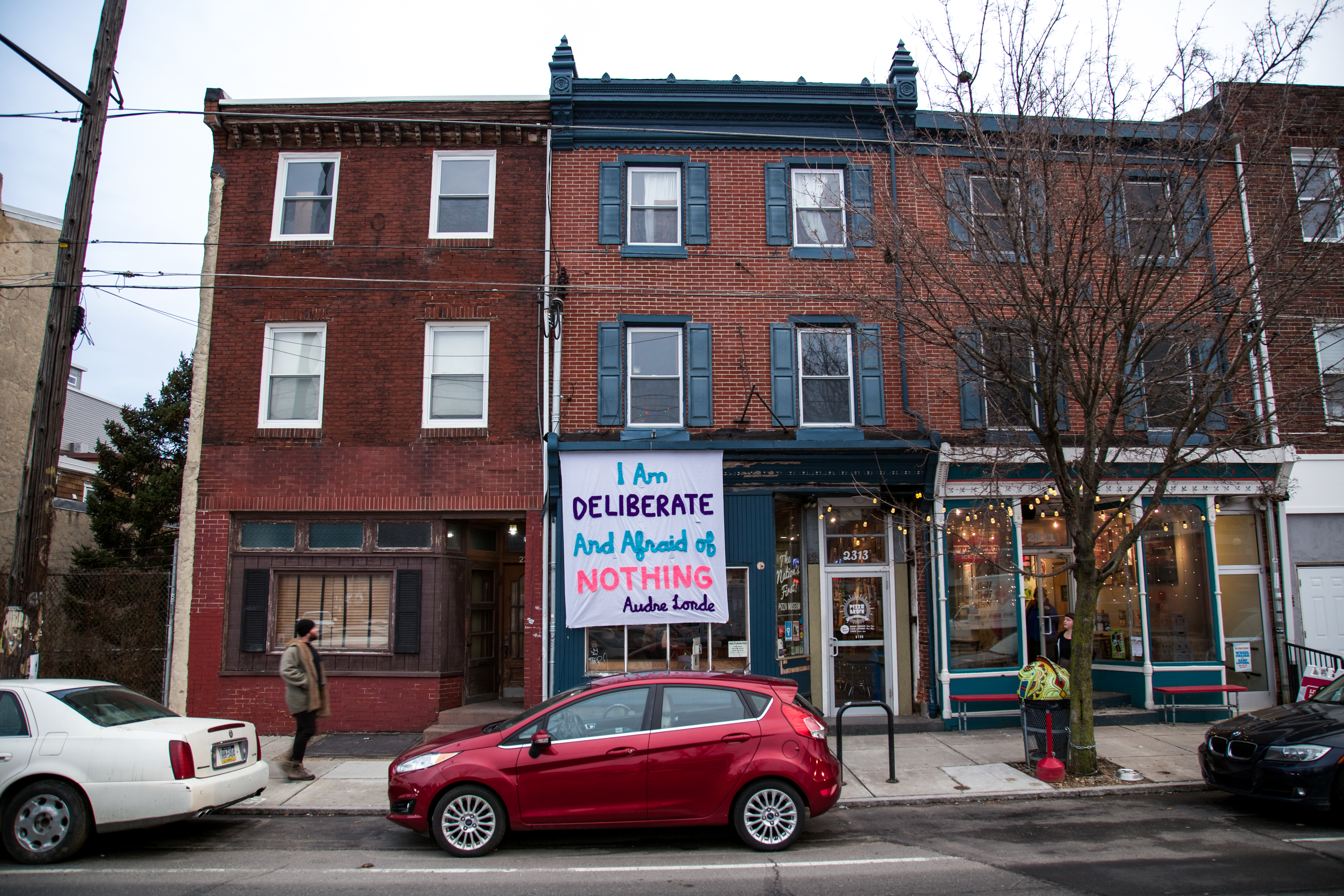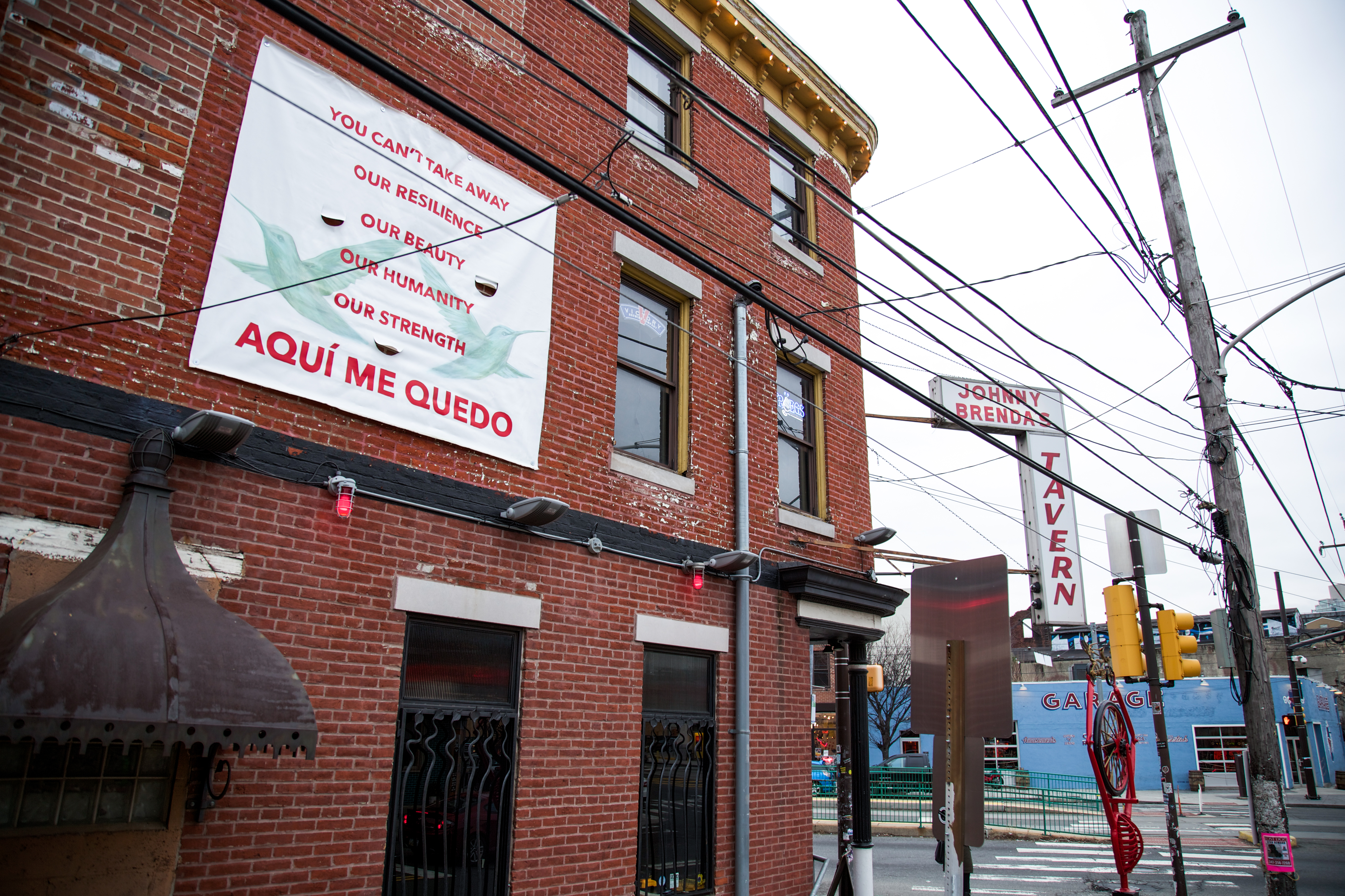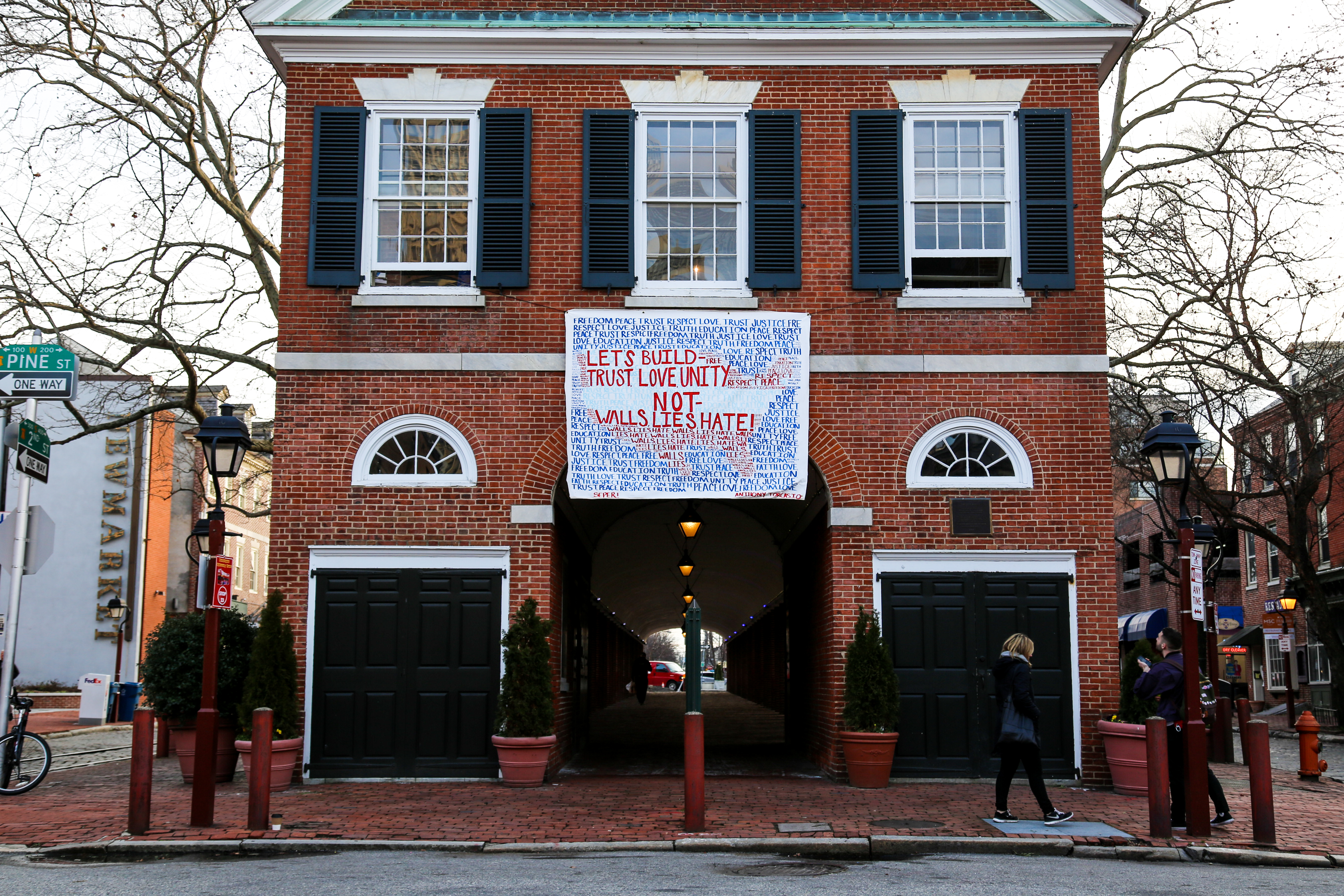 The artist-created signs hung prominently around the city for the entire inauguration weekend (some even longer) and read messages like “hate won’t make us great” by Nero on a private home in Bella Vista, “build bridges not walls” by Alloyius McIlwaine on the La Colombe across from Dilworth Park, and “you can’t take away our resilience, our beauty, our humanity, our strength: aquí me quedo (here I will stay,)” by Michelle Angela Ortiz on Johnny Brenda’s in Fishtown.