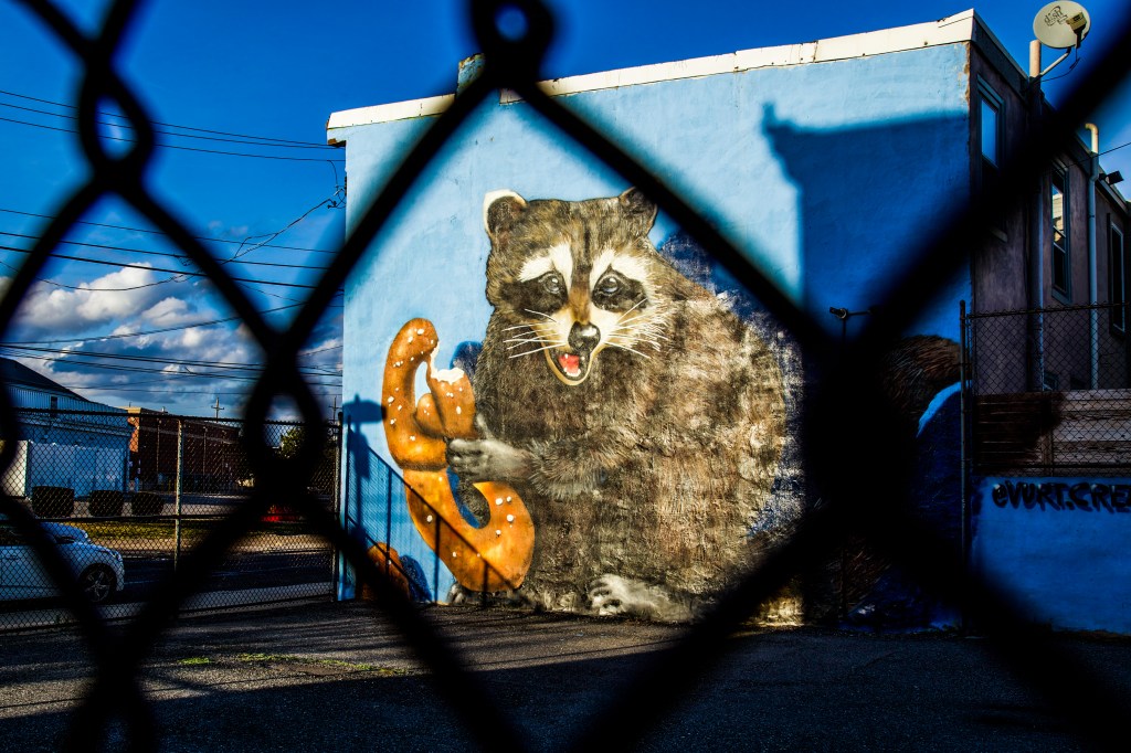 (The world’s happiest raccoon eating the world’s biggest Philly pretzel mural by V.U.R.T. in Port Richmond)