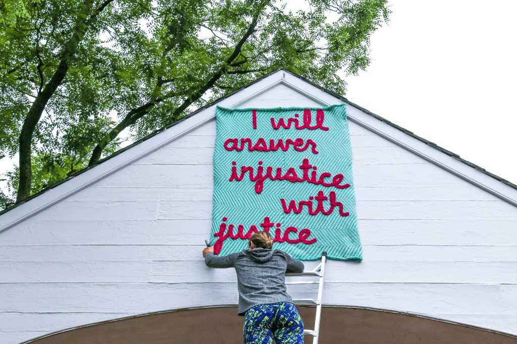 For Revolutionary, I invited Philly-based artists who were using their art to examine the world around us and challenge our current political and social status quo. From Lisa Kelley’s weavings that connect the struggles, the despair, and the stories of hope surrounding addiction and the opioid epidemic installed at the Arch Street Meeting House. To Yasmine Mustafa and Monica O‘s collaborative poster at the African American Museum in Philadelphia about privilege and the Birth Lottery, the the idea that no one can choose the circumstances they’re born into, so why not work to recognize this more and engage each other with more empathy. To Shawn Theodore‘s installation on Elfreth’s Alley that serves as A Reminder that for those in this nation with ancestors who persevered under the tyranny of slavery before and after colonial independence, that change, that revolution, has truly yet to arrive.