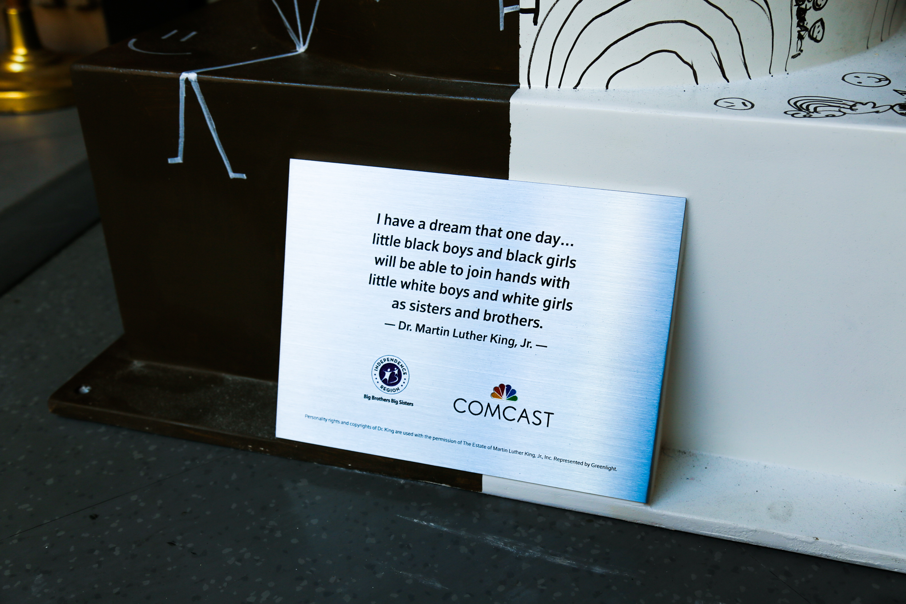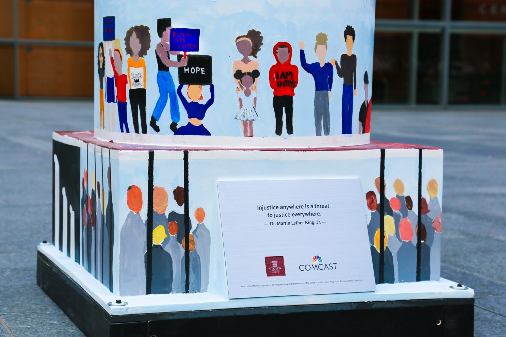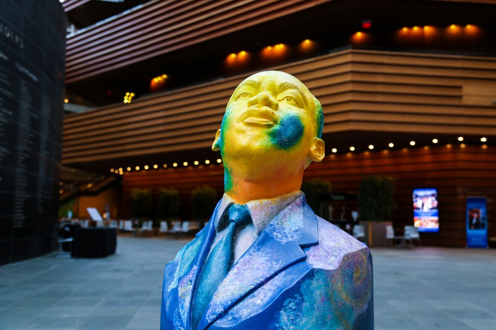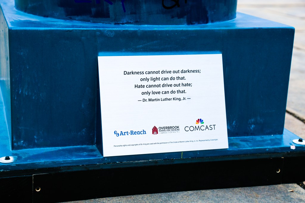 These temporary additions to Philadelphia’s public art and monument landscape are a part of a community art project titled  Keep Marching that saw over 50 Philadelphia students from Art-Reach in partnership with the Overbrook School for the Blind, Big Brothers Big Sisters Independence Region, Philadelphia High School for the Creative and Performing Arts, and Girard College paint nine six-foot-tall busts of MLK inspired by some of the civil rights leader’s most influential and enduring quotes.