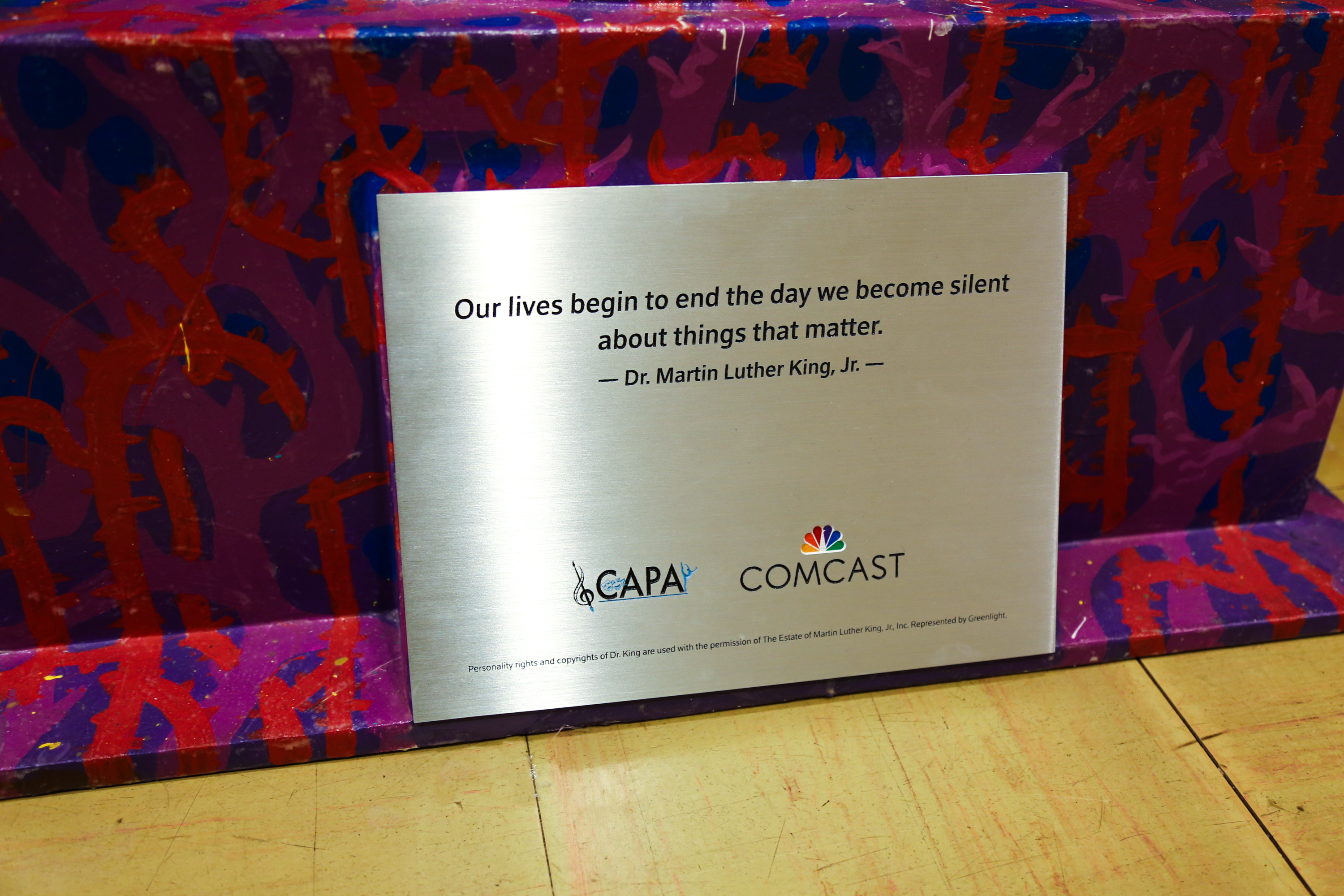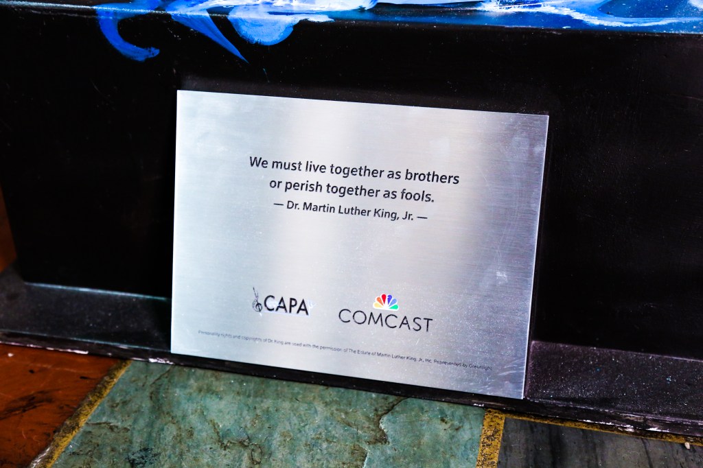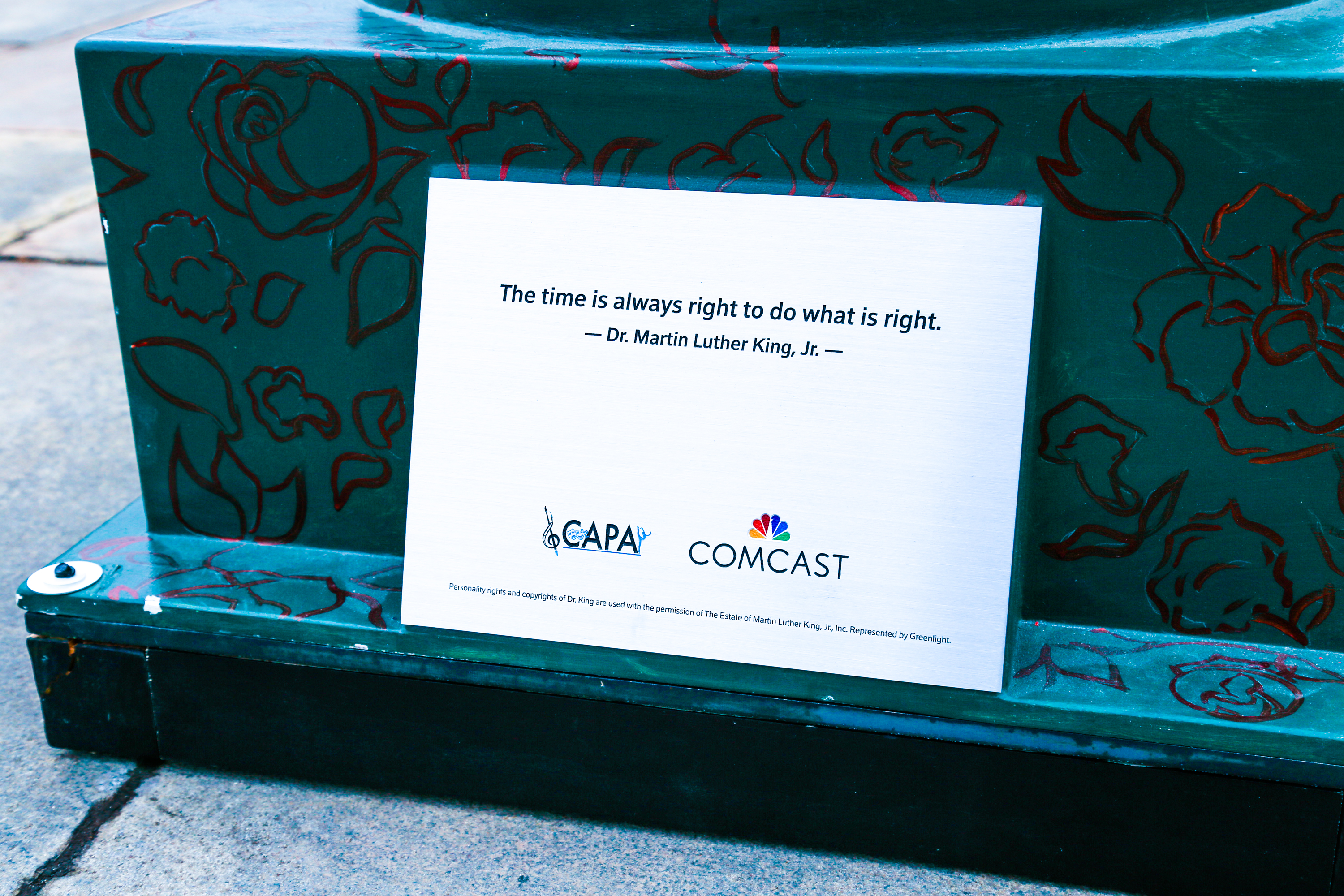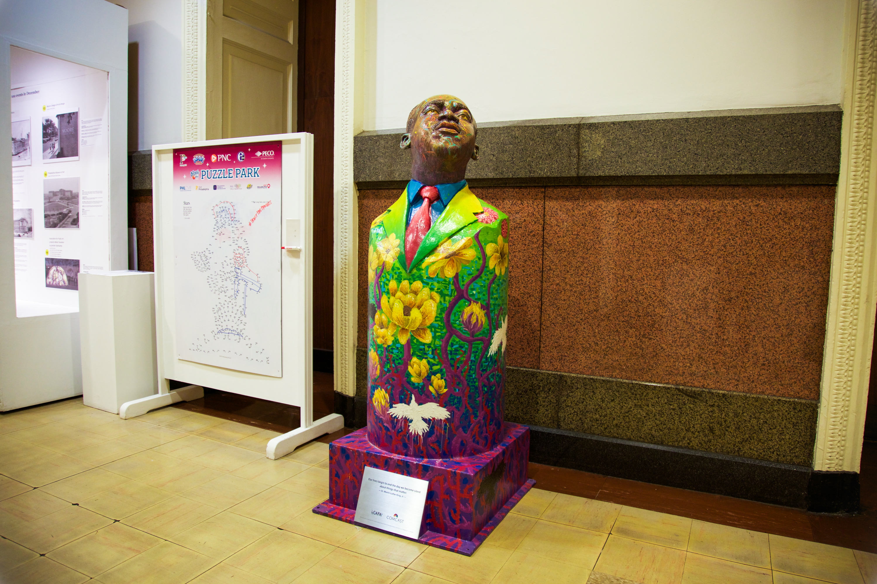 These temporary additions to Philadelphia’s public art and monument landscape are a part of a community art project titled  Keep Marching that saw over 50 Philadelphia students from Art-Reach in partnership with the Overbrook School for the Blind, Big Brothers Big Sisters Independence Region, Philadelphia High School for the Creative and Performing Arts, and Girard College paint nine six-foot-tall busts of MLK inspired by some of the civil rights leader’s most influential and enduring quotes.