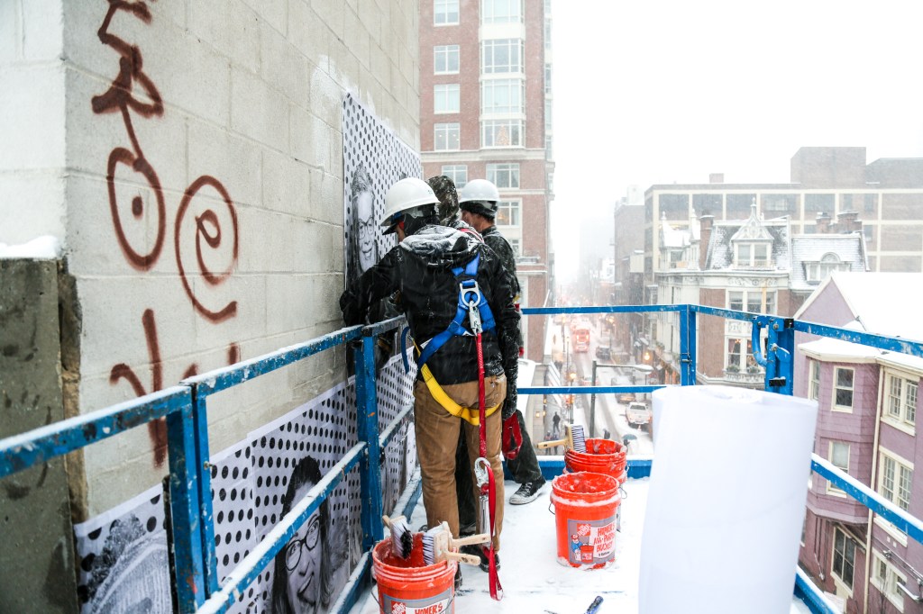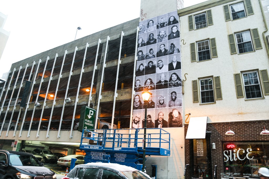 In December, internationally renowned street artist and activist JR‘s Inside Out Project rolled in to Philly and with the help of the Emerson Collective and Mural Arts Philadelphia installed a temporary wheatpaste mural at 18th and Sansom streets using photo portraits of hundreds of Philadelphians who support protecting undocumented Dreamers living here in Philadelphia and around the U.S. (Read more here.)