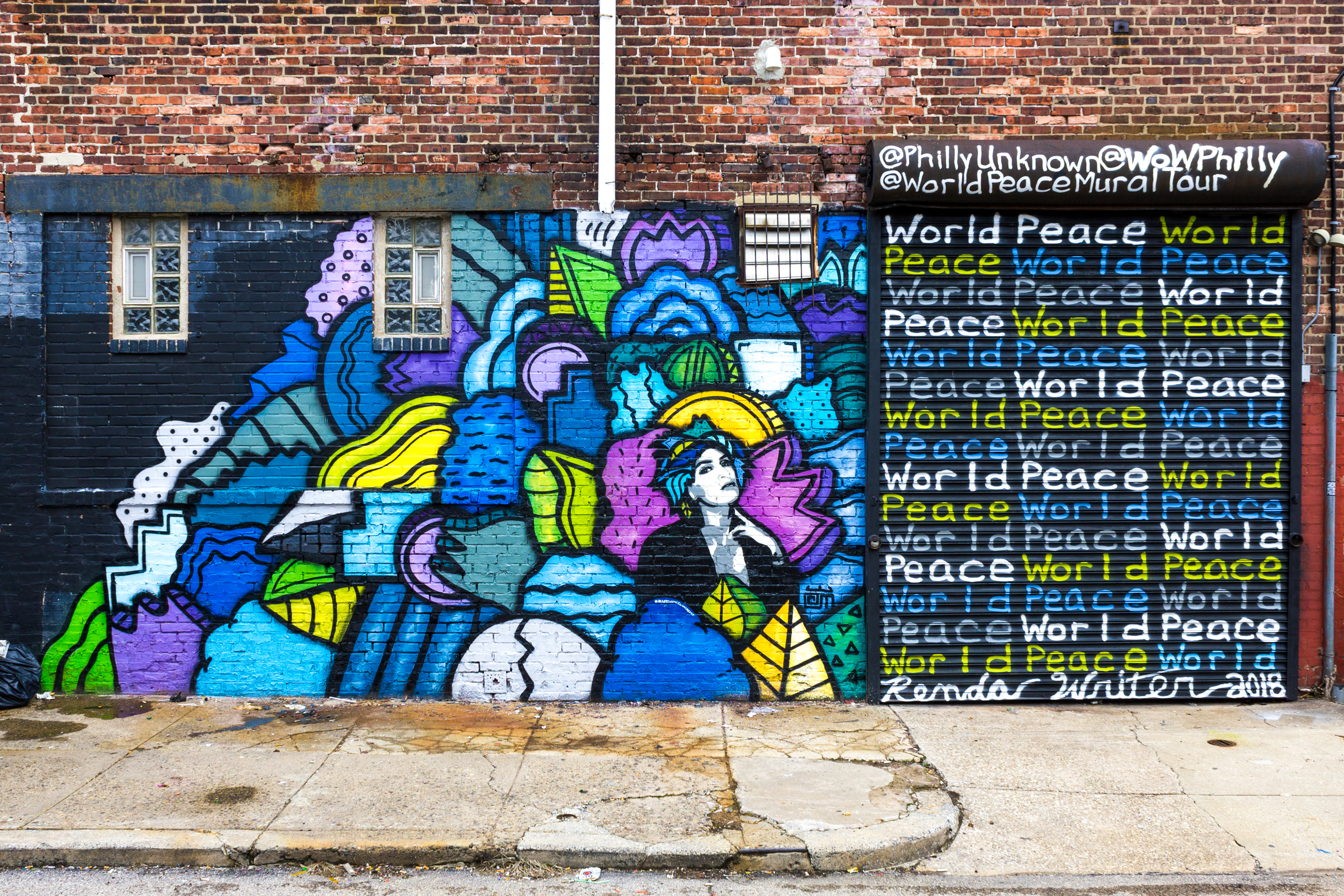 This collaboration is the latest creation of Renda’s World Peace Mural Tour, which has seen the making of over 50 (and counting) murals around the world that read “World Peace” in simple handwritten text, sometimes accompanied by the work of a local artist. Renda’s mission with the tour, as his website reads, is to “help to enact change through the power of the written word and the influence of public art.”