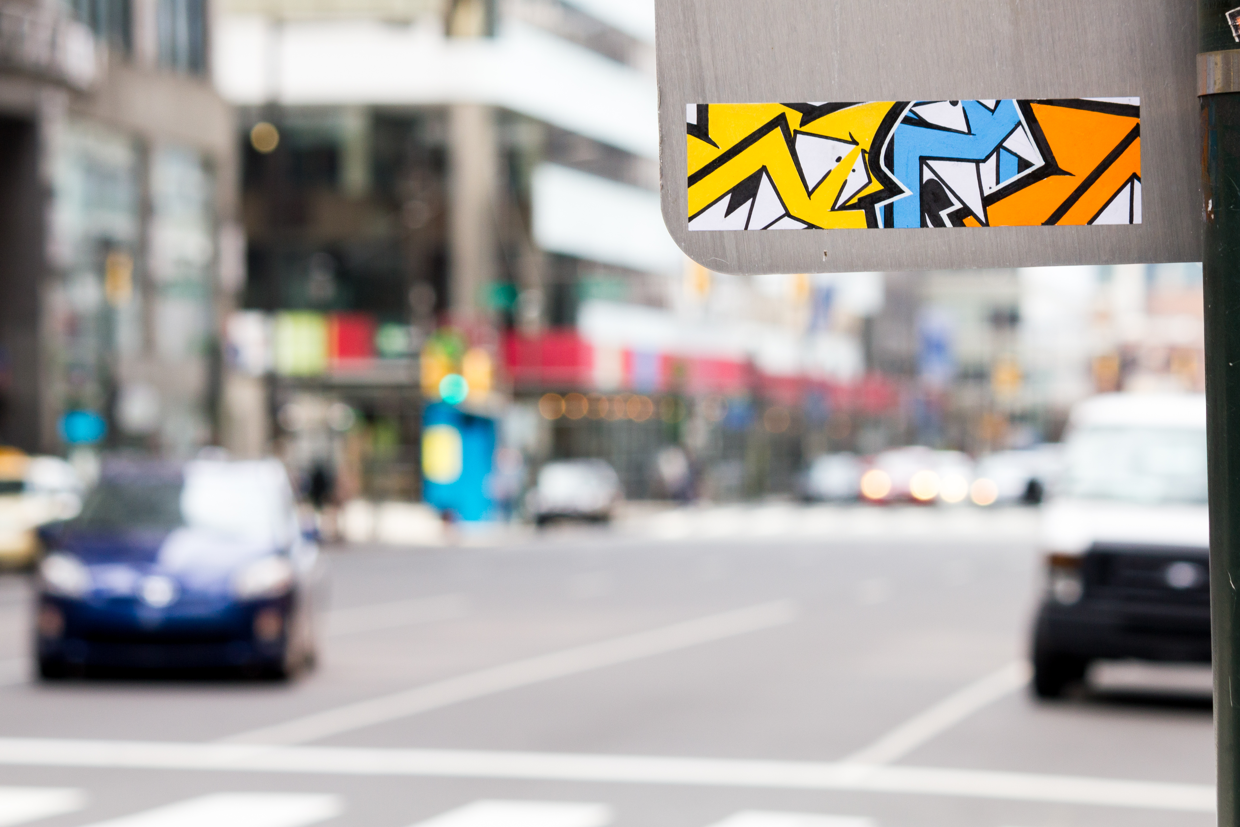AV: It depends. For the ones that I really want to last, I look for a really smooth surface. I definitely won’t put them on a bumpy surface. I usually try to find a nice clean sign that doesn’t have any old stickers on it; if you put a sticker on top of that, it’s more prone to fall off. Same thing for bins, but the bins are starting to get really buffed. The buff is a lot harder than it was back then. The city is changing so much and so quickly.