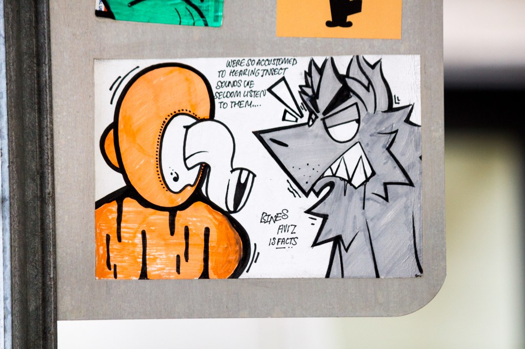 Few street artists in Philly are quite as prolific as Philadelphia sticker artist Avizzle, or Aviz. Center City street signs and newspaper boxes are filled with his work, but you can also find his character on less-trafficked residential streets throughout the city. His stickers are so abundant because his goal over the four years he’s been putting them up has been to perpetuate Philly’s unique, hand-drawn sticker tradition – and maybe bring it back from the brink.
