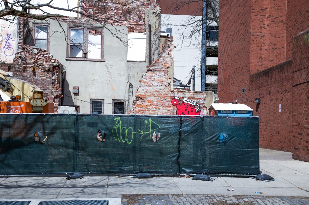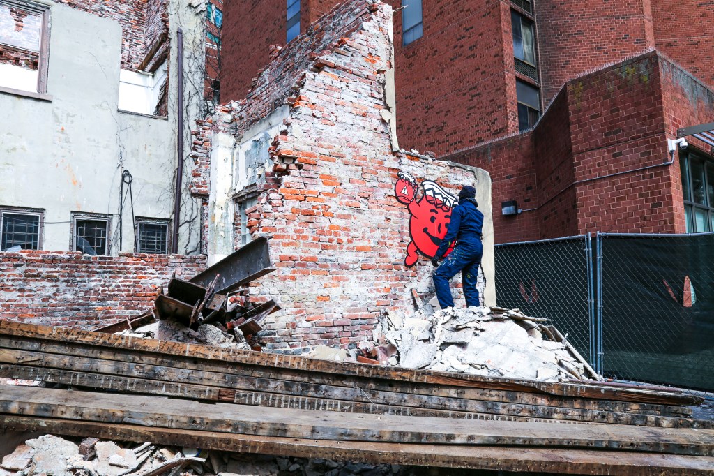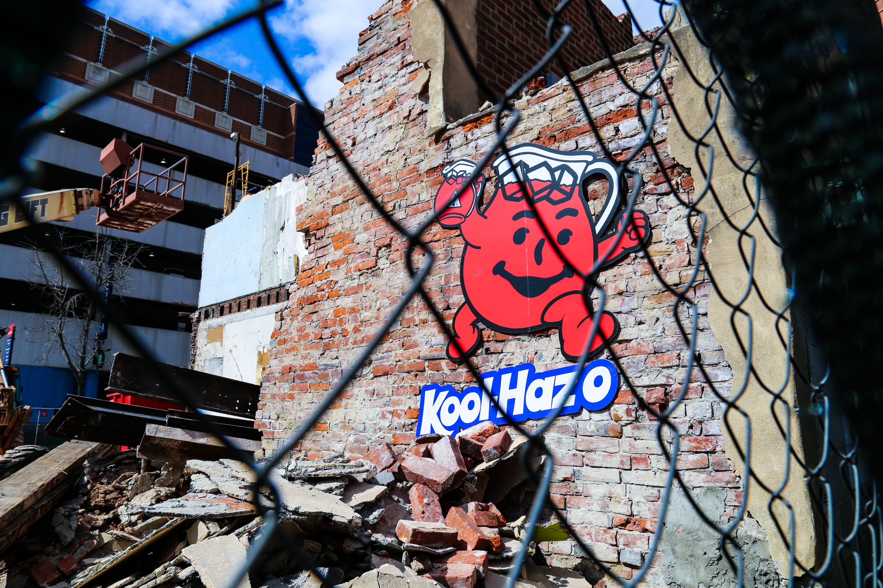 LOVE this new Kool-Aid Man, sorry, Kool-Hazo Man piece from Philly’s own parody street artist Kid Hazo, installed this weekend at the site of a demolition at the intersection of 9th and Locust streets in Center City!
