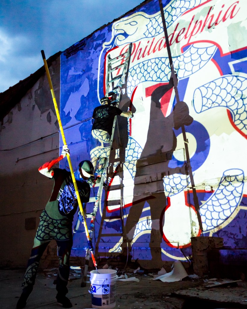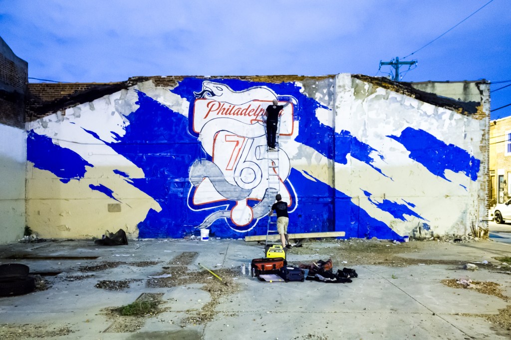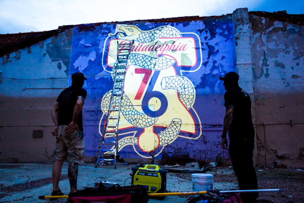 GB: A few weeks prior to painting the first mural, we were already planning out how to approach things. The 76ers obviously wanted to keep things a secret, so I just reached out to my followers to see if anyone had a wall they’d like to donate, for a ‘mural campaign’. I probably received about two dozen solid leads; some walls were great locations (the ones painted), some were in a less prominent location, some were too small, etc etc. So I made a list of the walls that were offered and luckily the top 7 were fairly spread out. The 76ers wanted to represent each area of the city in order to bring all the neighborhoods together, so we went with our initial walls.