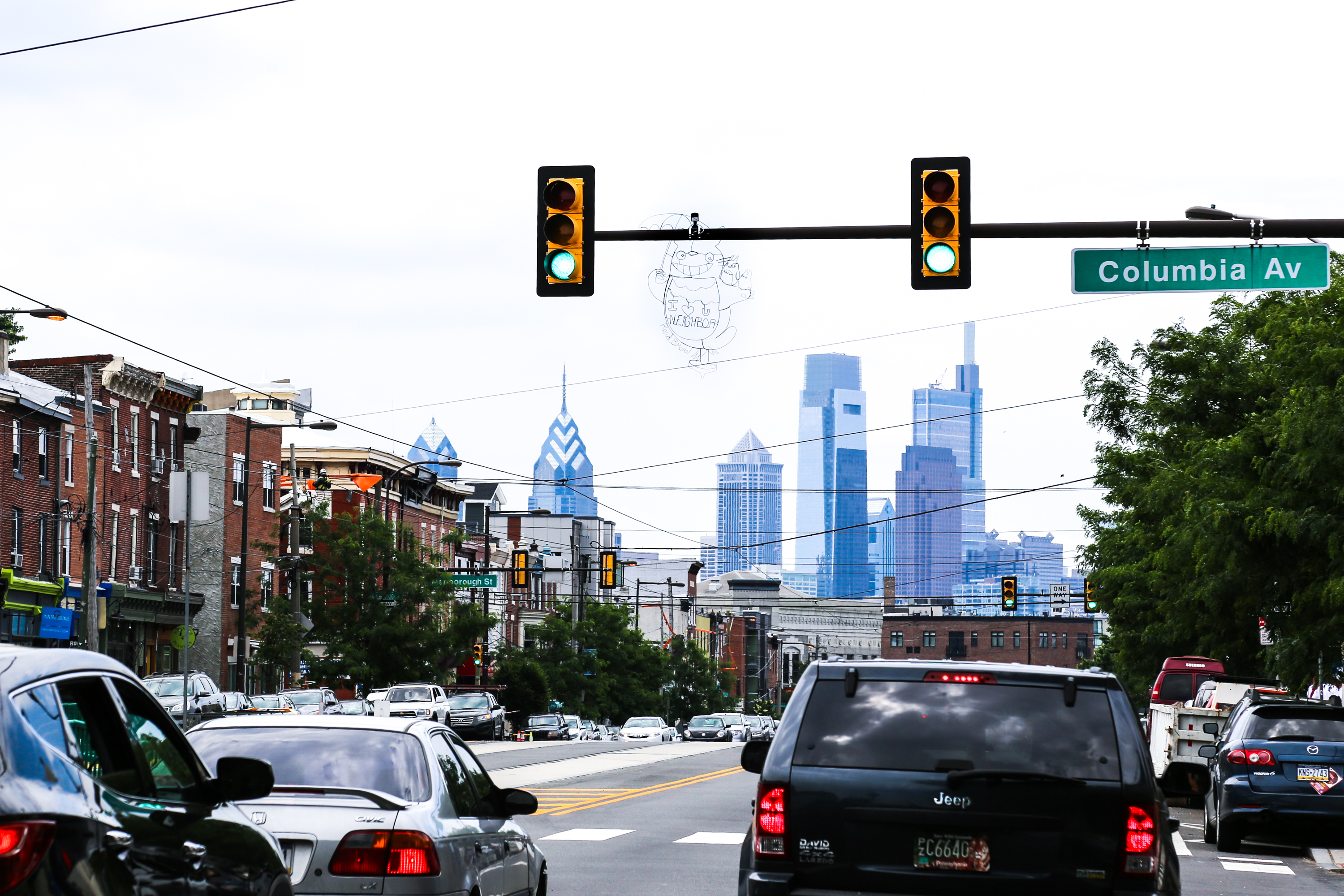 You can find the new piece that reads “I <3 U Neighbor,” hovering above the intersection of Girard and Columbia avenues… See past wire installations from REED around Philly here, here, and here!