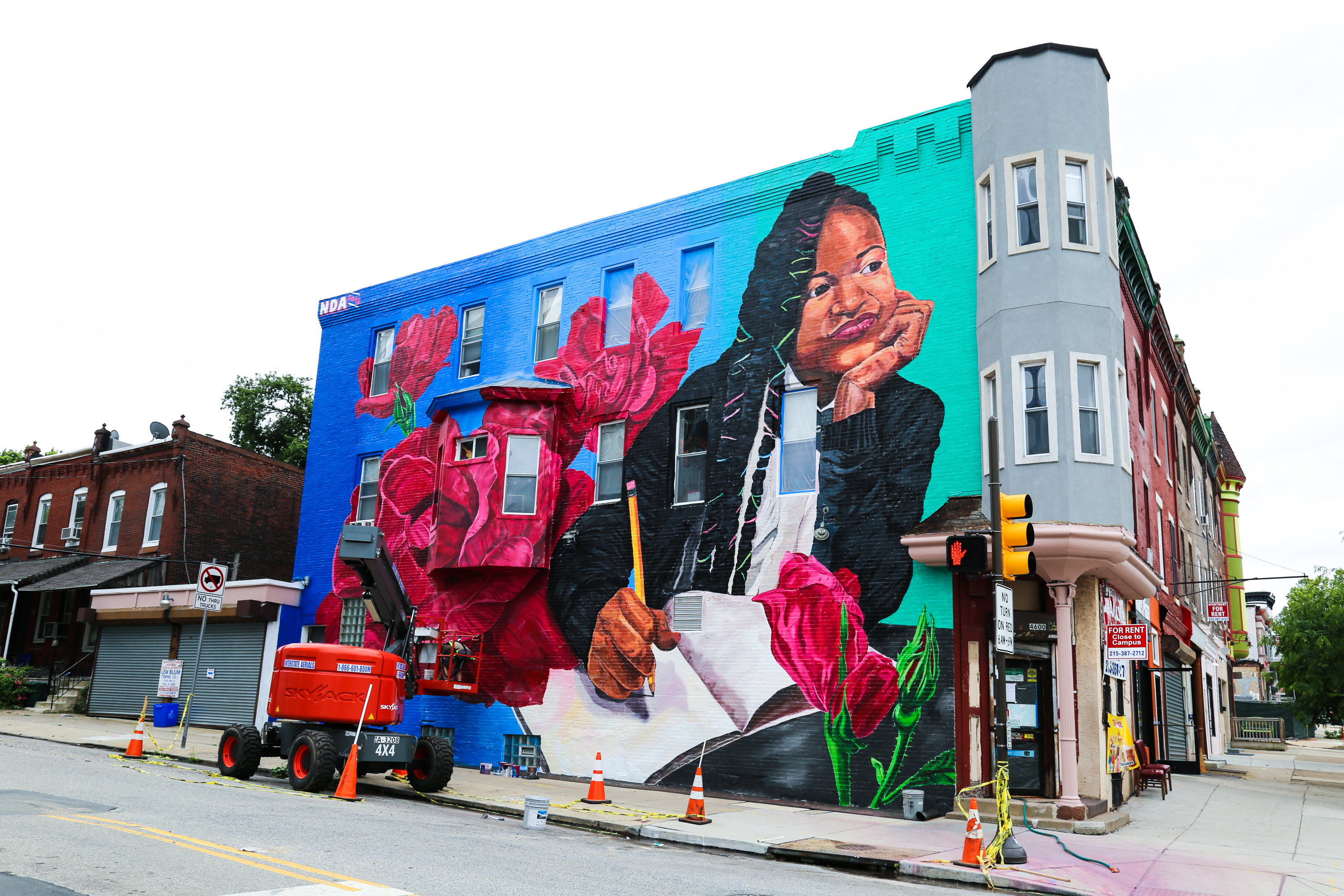 Located at the intersection of 46th street and Woodland avenue, facing the site of the former Alexander Wilson elementary school, NDA’s new mural is a portrait of his young neighbor Diamond. He wrote the following on his Instagram about the mural’s inspiration: