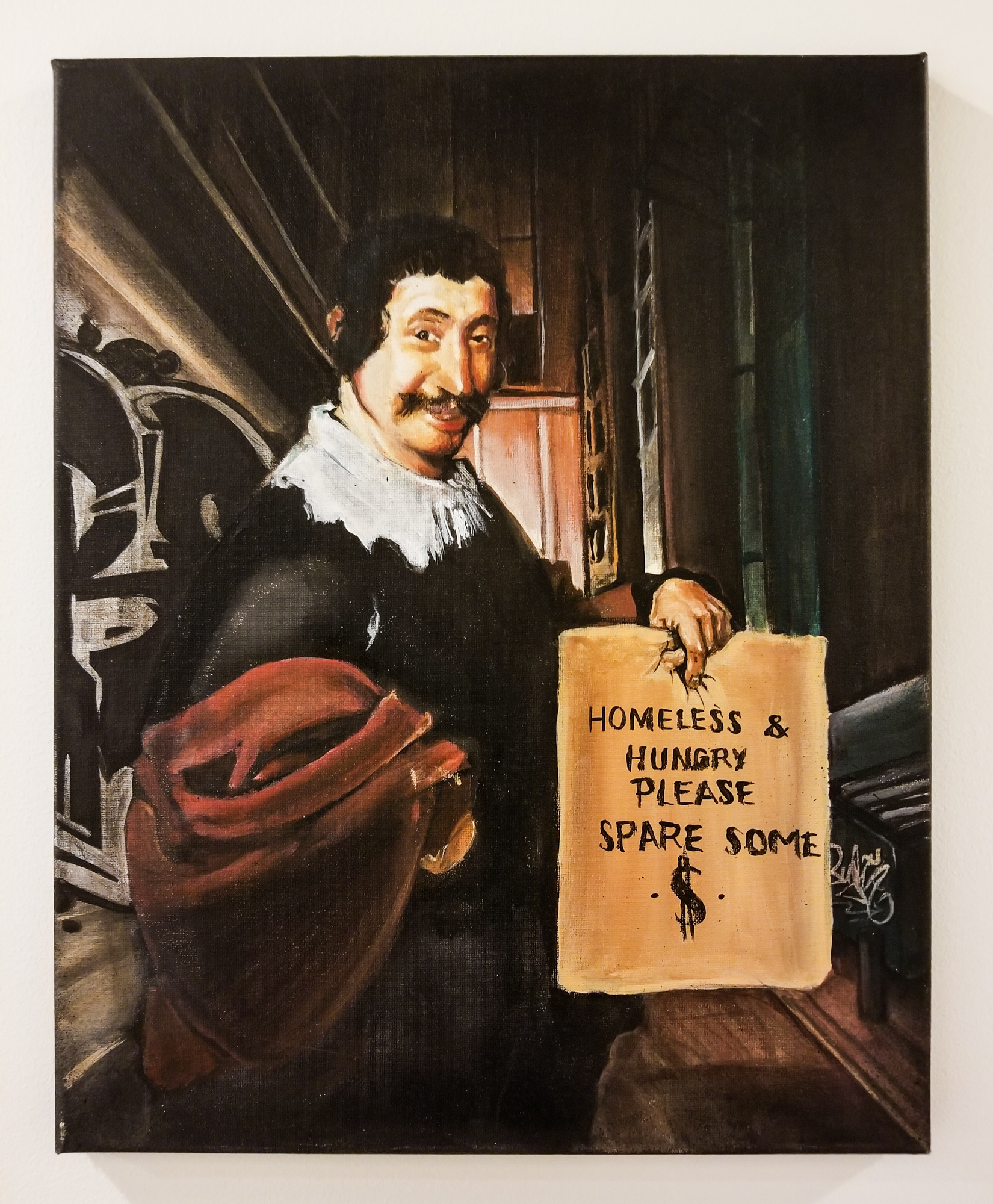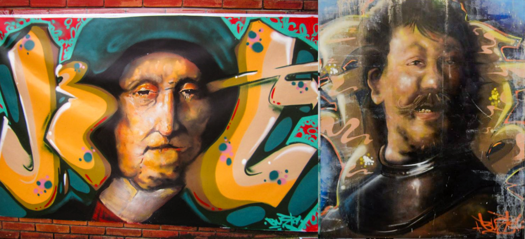 I do portraits because the definition of portraits, in classical art, was to kind of immortalize or give power to somebody. If you look at it in the past, the artists were only painters for the king. The king was the one who commissioned the artists to paint whatever the king wants, so that’s the reason portraits were important, and then Velzaquez and Rembrandt helped break down that stigma. That’s why I love them, because they started painting regular people. They were painters for the king, but then they started painting regular people. Velazquez put like a drunk geographer (that is one of the paintings I have in a Philly alleyway) and he was a fucked up dude with a crazy history and all crazy and drunk everyday, and Velazquez put him at the king’s palace, like a big-ass portrait of him. And the king was mad and they kicked him out from the kingdom. So they kind of did what the graffiti artists are doing. They took the art to their own interpretation and went against the rules, for the art.