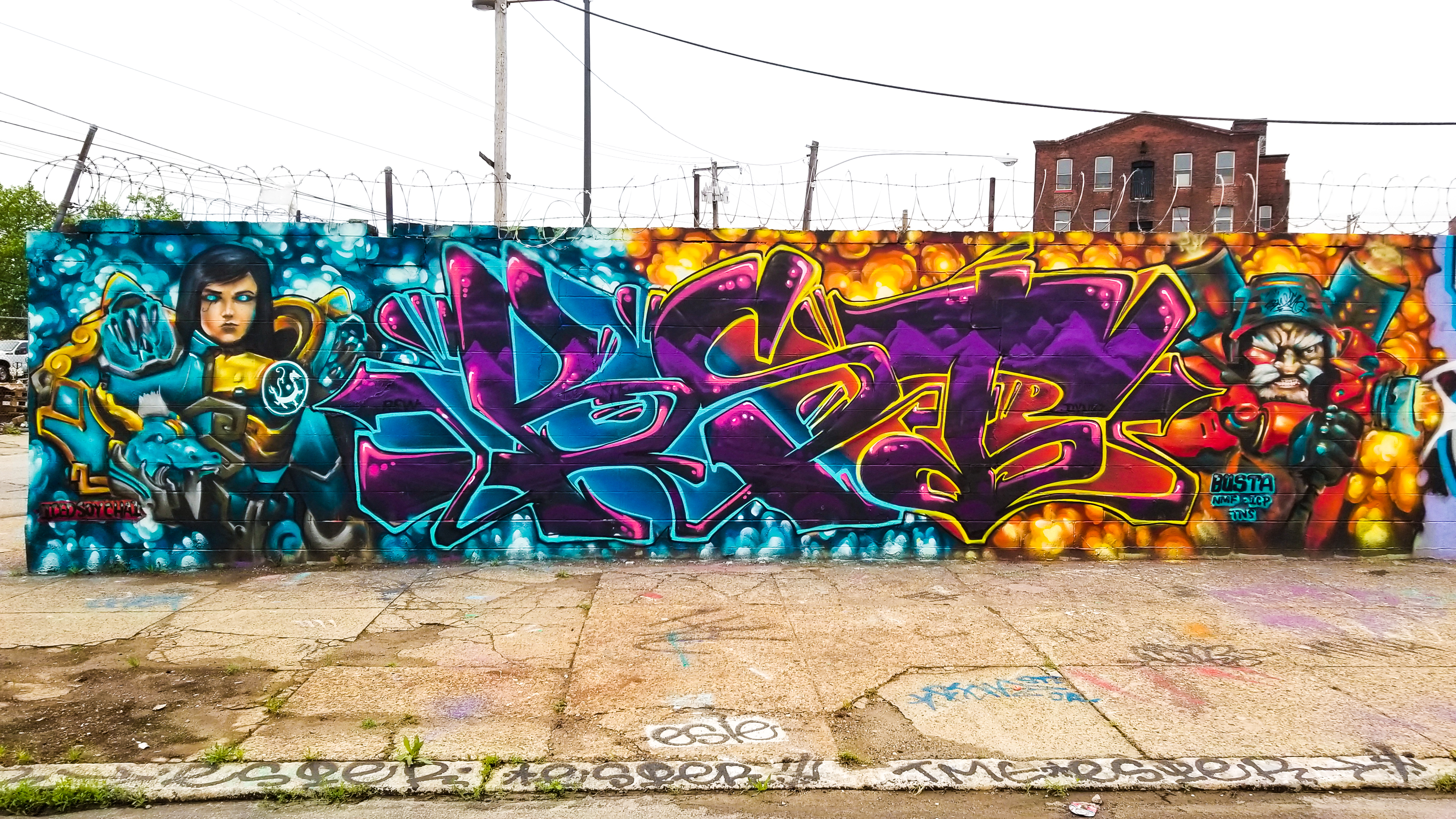 As I was doing my research I came across Mural Arts, and I wasn’t sure what was Mural Arts because when I read about it, I was like, Oh it’s a corporation trying to take graffiti artists and put them into doing murals in the city, and blah blah, and I was like, Oh! Sounds really cool. It’s probably an organization helping graffiti writers from the city to get better, to find like a way to make money or like show themselves and their work throughout the city. So I messaged them and they were like, Yeah, we got like a training program. So you can come and apply. I applied for it, and it was like three-hundred dollars, I paid for that. It was a couple months that they kind of teach you their techniques of doing murals. I kind of started doing that, but I wasn’t too happy with it because everything was indoor. Everything was like, Oh, painting in the panels, and then we take the panels and then wheatpaste in the wall. And I was like, uhhhh–I prefer the action on the wall. Y’know what I mean? And they were doing a lot of, like, you gotta do work for other artists instead of doing your own thing. I was like, No. I came here to do my thing. Y’know? Like I’m not gonna work for free for them. So I started to work in restaurants, in bars, in everything. I did like everything and kept going to every corner in Philly, asking for like, Yo, you want me to do a mural? Can I do a piece? Can I—y’know, whatever. And I started getting a lot of jobs out of it, painting 5th & Cecil, a lot of people asked, Yo, you got a card? You do murals?
