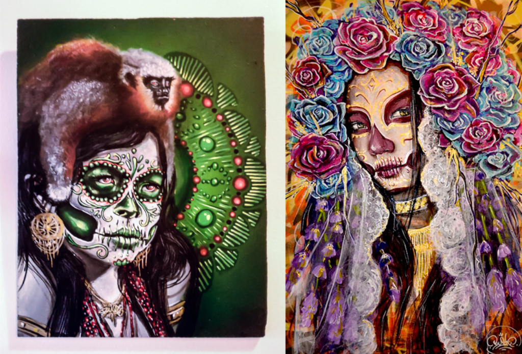 With the themes in my work, I usually go through phases. So sometimes it’s like, Oh, let’s try these people—everything depending on the mood and different inspirations, moments, stuff. I have a couple series. I’ve been working in the indigenous series for like two years now. I started that series by doing the Day of the Dead girls. I was looking through why they do the Day of the Dead, and actually it’s funny, because when the French went to Mexico, kind of like at the beginning of the 20th century, all the french were like white. White, white, white, and had like all the fancy hats and all the fancy silk and all this stuff and lots of makeup. All the indigenous started looking at that and they started getting discriminated by the white people. So they were like, Oh, we’re ashamed of being brown and indigenous, let’s paint our faces white. And then they started painting their face white and doing those kinds of things, because they were ashamed of their culture. Then in the 1910’s a dude, an illustrator named José Guadalupe Posada did the first Day of the Dead illustration of a skull. That’s how everything started, because this illustrator did kind of like a bust of a woman in the skull-looking mask, with a fancy hat and clothes, trying to represent the shame of their culture, that they were killing their culture. That’s part of why every year the people dressed up like that and party, because of the dead–it’s funny, it’s funny. So, because of that, I took like all the indigenous girls from Colombia, from the Amazonas, and like dressed them as Day of the Dead, kind of showing that they also are being made to be ashamed of their culture, and we are all killing them. So this was at the beginning of the series, and then I started switching them up. I did more of like a realistic portrait without the Day of the Dead stuff, and now I’m doing more like calligraphy on the faces.