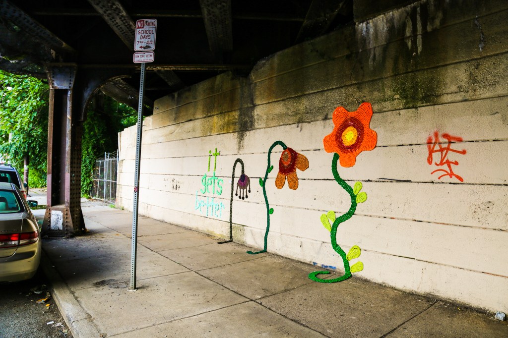 A new yarnbomb installation on 11th street between Callowhill and Nobel streets by Nicole Nikolich (aka Lace in the Moon) promotes mental health awareness and hopes to help make people feel less alone. Over email, I chatted with the artist who said the installation actually started out quite differently: