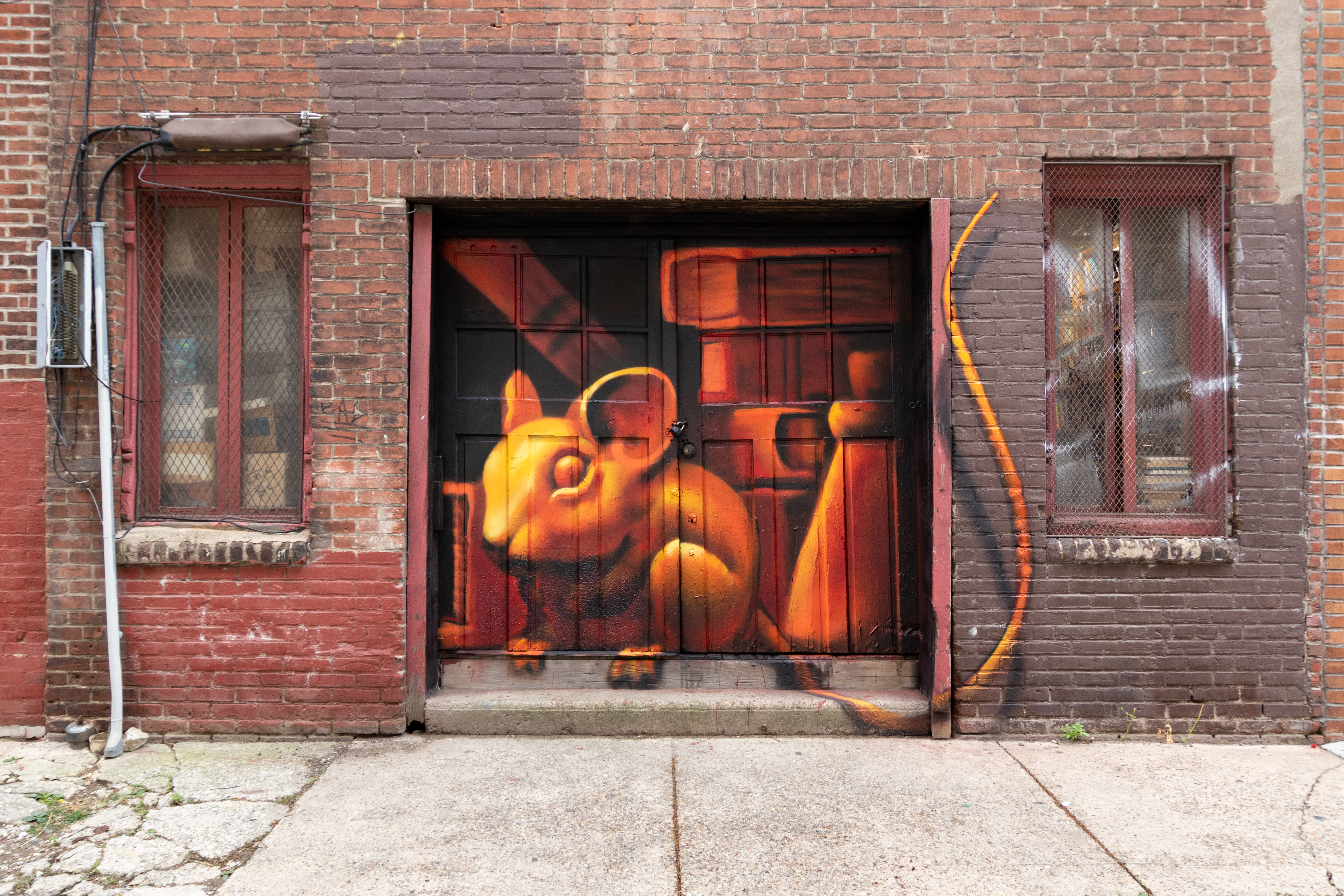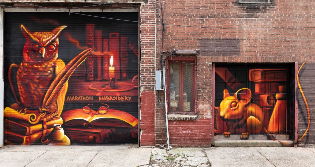 In August, two murals appeared in an alley off of South Street. Painted by artists Bear215 and Evan Lovett, they show an owl and a mouse sitting on some books. I love the warm colors and the way the artists hid their names on the spines of the books. But the best part might be the story behind them: one of these murals was an accident! Bear recounted the story.