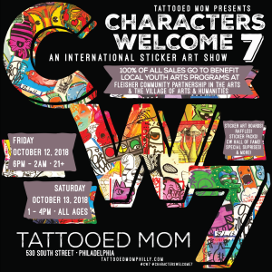 And on Friday, October 12 from 7pm–2am (21+) and Saturday, October 13 from 12pm–4pm (all ages) don’t miss Characters Welcome 7, Tattooed Mom’s annual international sticker art show. Characters Welcome is THE event for sticker artists to meet, exchange ideas, and leave behind tokens of their amazing art on Mom’s walls, ceilings, floors, etc… Come through, y’all!