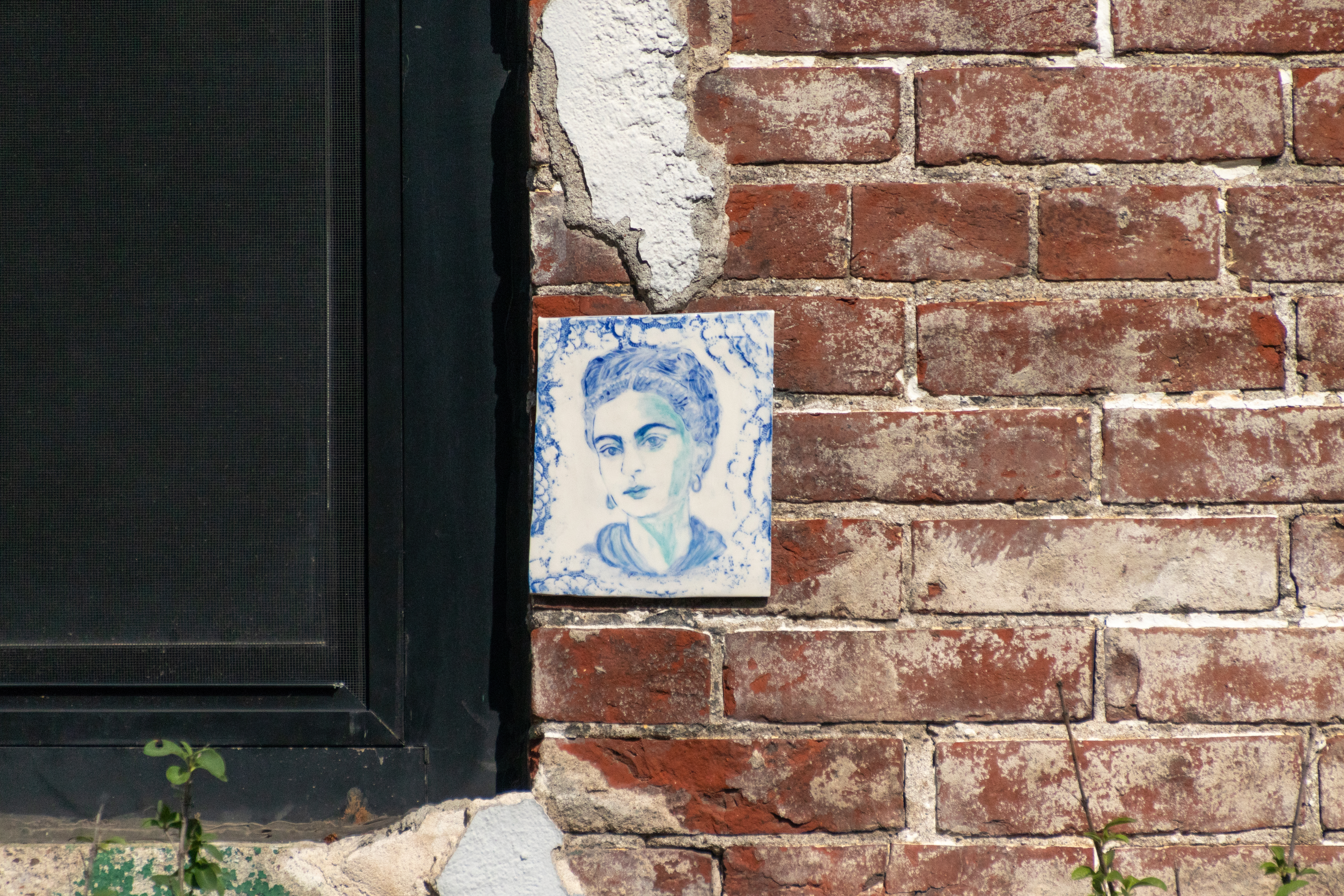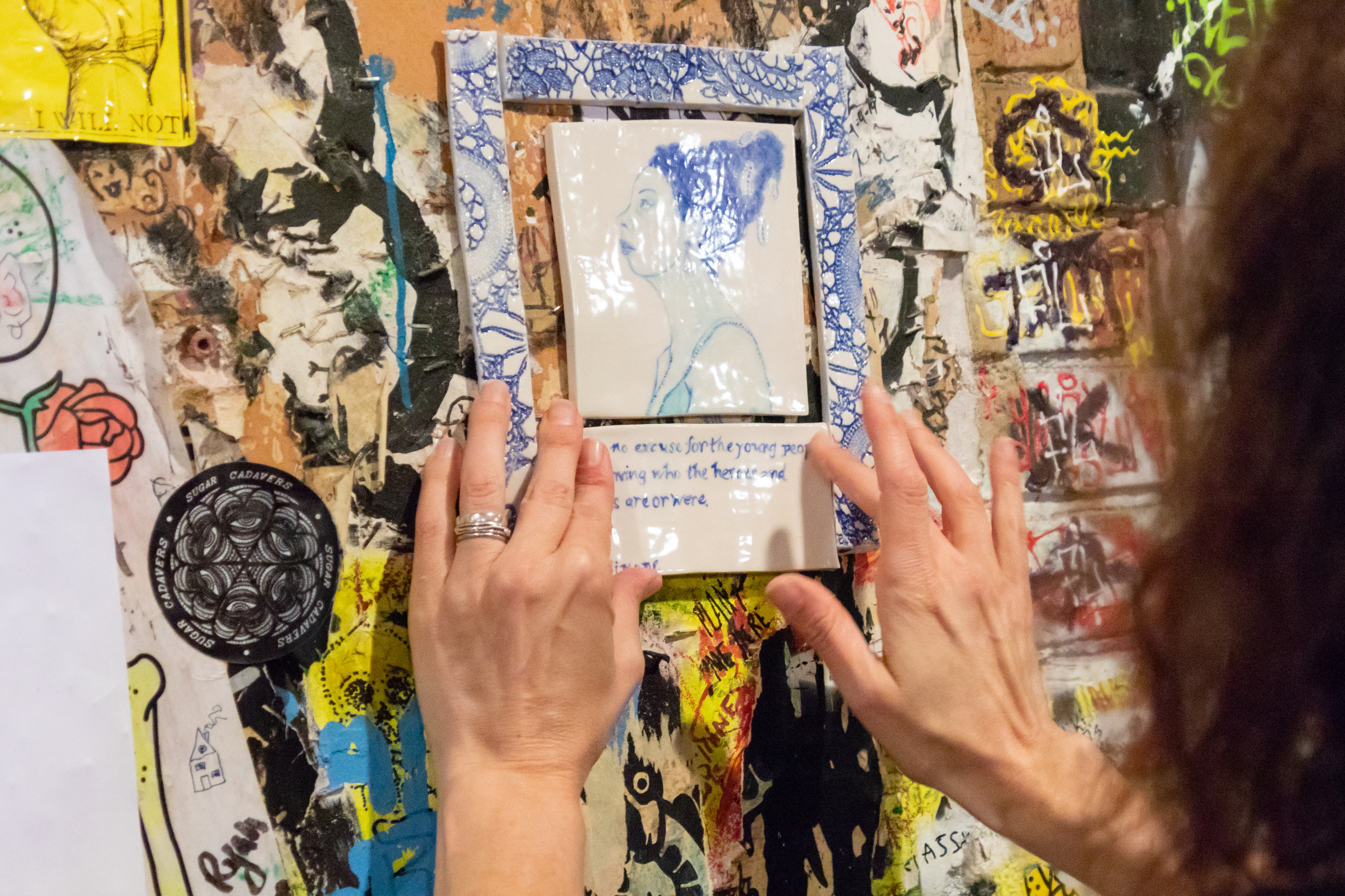 HH: Everything is porcelain. I used to do stoneware, and I switched to porcelain specifically for street art because it’s so durable. My biggest problem is adhesives. It’s coming down because of adhesives and I’ve tried so many – you should see the concoctions I put on the backs of some of these things! I have like contractor adhesive, double stick tape, PL… The adhesive takes 24 hours to cure, so I have the double stick industrial tape to hold it until it does. There’s a whole system. And all these pieces came down in the big rain! But the bigger the tiles are getting, the more it’s coming down. I’m realizing I’m going to have to grout. I was avoiding grouting because it’s time consuming, but I’m heavily considering it now. I’ll test out my new process here [at Mom’s] before I put it anywhere else.