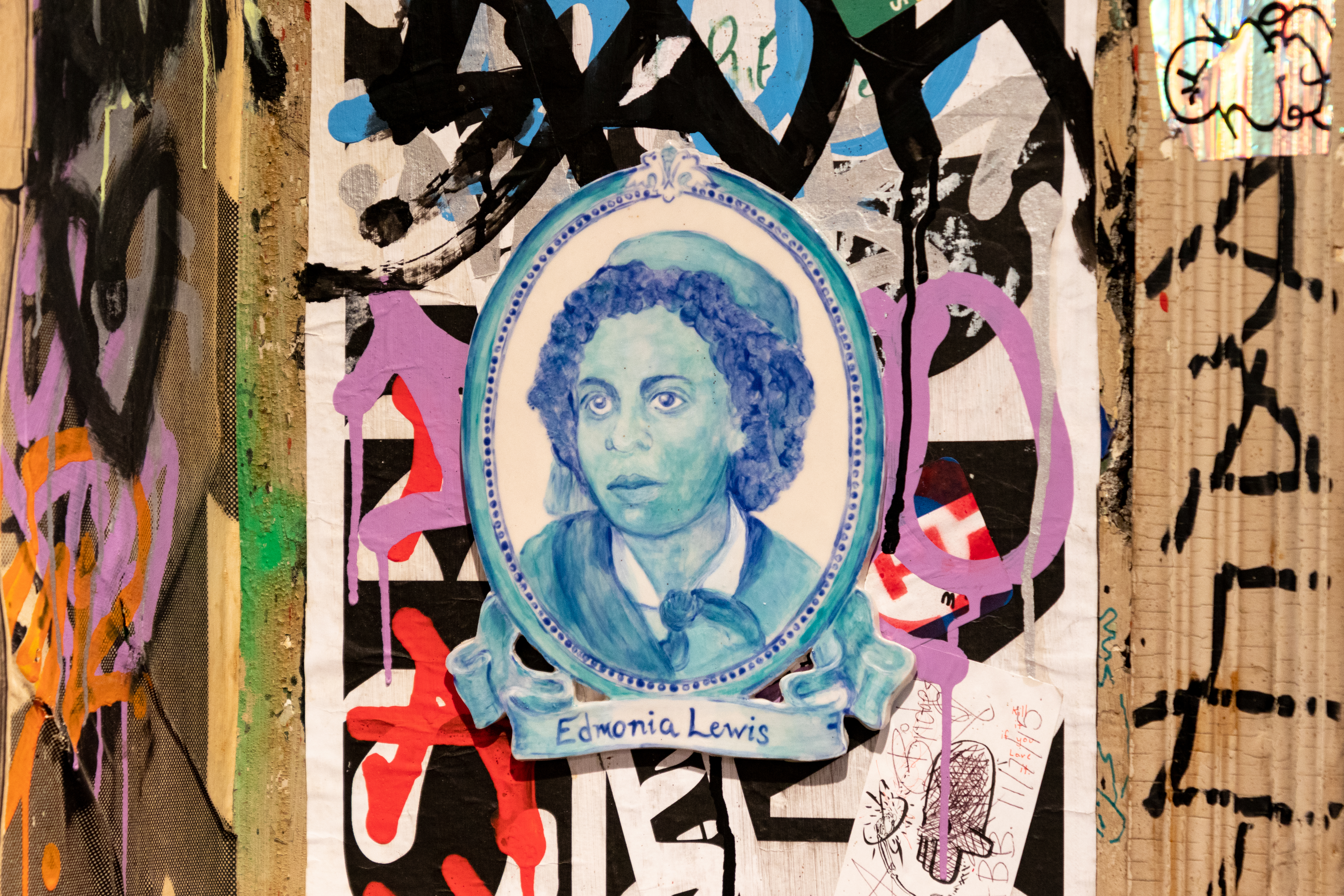 HH: No… I don’t. It really did come out of nowhere. I’ve worked in ceramics for years, and started making hummingbirds and hanging them, and kind of liked it. Honestly, what happened is I came here to hang some hummingbirds, and I hung that Frida [next to the stairs]. It was just some extra crap lying around – if you look at it, nothing is symmetrical! If I make a bowl and add texture, when I cut the bowl out and have extra shapes, then I fire them and use them for mosaics. So I came here to put up some hummingbirds, and I had Frida in my bag and I was like This might look good together… It was relatively spontaneous. But I got a crazy reaction from that particular piece, when they posted it, and I was really thrown off by it. I’m like What if I did this intentionally?! So I did, and then the next one I think I hung was Emma Lazarus – she was the only piece I think I have out that’s not porcelain.