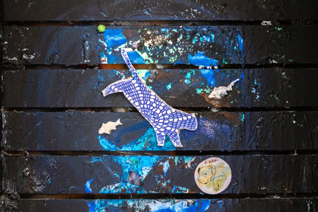 HH: We went together, and we redid it. I had so much going on in my life, and she was trying to do a million things, and I was like, “But we’re going to go to the Kitty Shrine?!” So she’s like, “Do you have anything on you?” I’m like, “I might have some blue paint, and I definitely have an extra kit.” And she’s like, “I think I have glitter.” …What?! And there we are, with glitter… I literally used my hands! I just put blue paint and went like this [makes a wiping motion with her hands]. And then I had the fish! We made it kind of blue, so I was thinking I should add my fish because it kind of looks underwater. I was making random fish, and every once in a while I would glue them in Fishtown. I had extras, so I just threw in the fish. There was no real plan, although I keep saying we should get together and come up with a plan. I do want to do something with it, because everything that’s happened so far is just spontaneous.